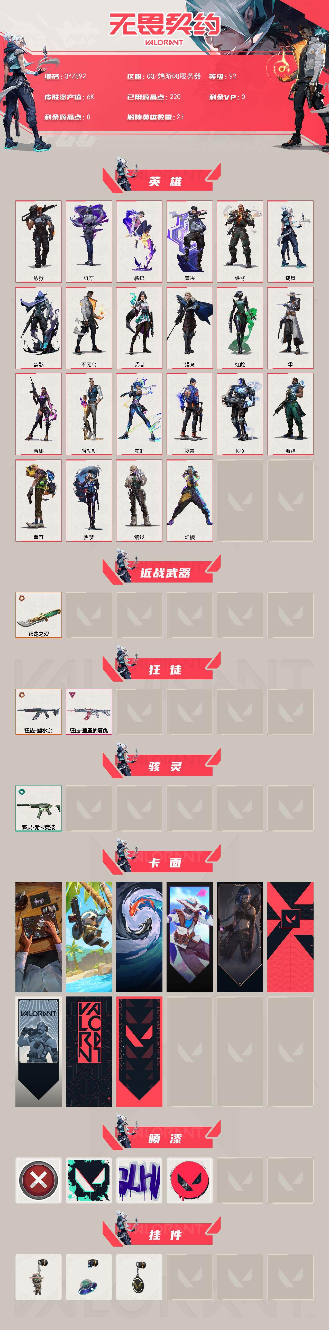 【qyz892】终极2/卓越1/皮肤7/等级92/段位:白银/幻棱/炼狱/维斯/暮蝶/壹决/铁臂/捷风/幽影/不死鸟/贤者/猎枭/蝰蛇/零/芮娜/尚勃勒/霓虹/夜露/k/o/海神/盖可/黑梦/钢锁/近战武器-5周年//公测重制版 苍龙之刃/狂徒-塑水宗/狂徒-盖亚的复仇/骇灵-无限竞技/浮光跃金 卡面/树懒大作战 卡面/红鳞松叶 卡面/无畏契约go!第一卷:零 卡面/《双城之战》金克丝 卡面/代号红色 卡面/新兵报到 卡面/v契约 卡面/无畏契约 卡面/买装还是存钱 喷漆/胜利属于无畏契约 喷漆/glhf 喷漆/无畏契约 喷漆/无畏契约go!第一卷 零 挂饰/天外飞客 挂饰/无畏契约 纪念币 挂饰