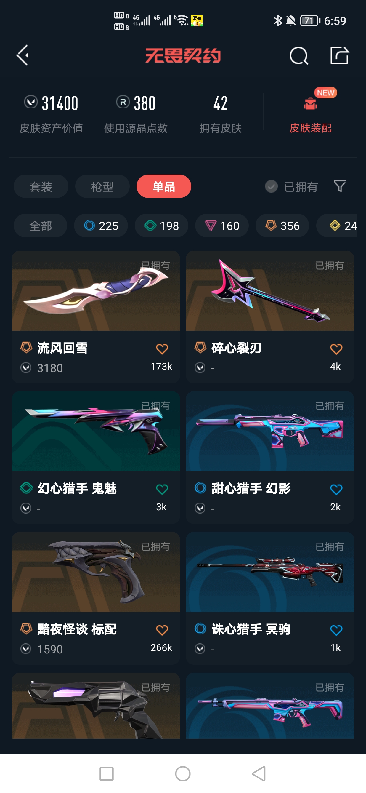 【游戏等级】lv45 【段位】 白银i 【r点】380 【皮肤总价值】31400 【英雄数量】10 【皮肤数量】42 【挂饰数量】26 【卡面数量】41 【喷漆数量】38 【近战武器】近战武器-流风回雪 近战武器-碎心裂刃 近战武器-星际猎兵短剑 近战武器-鬼丸国纲 近战武器-堕天遗武仪式匕首 【鬼魅】鬼魅-幻心猎手 鬼魅-瑰梦艺语 鬼魅-盖亚的复仇 【幻影】幻影-甜心猎手