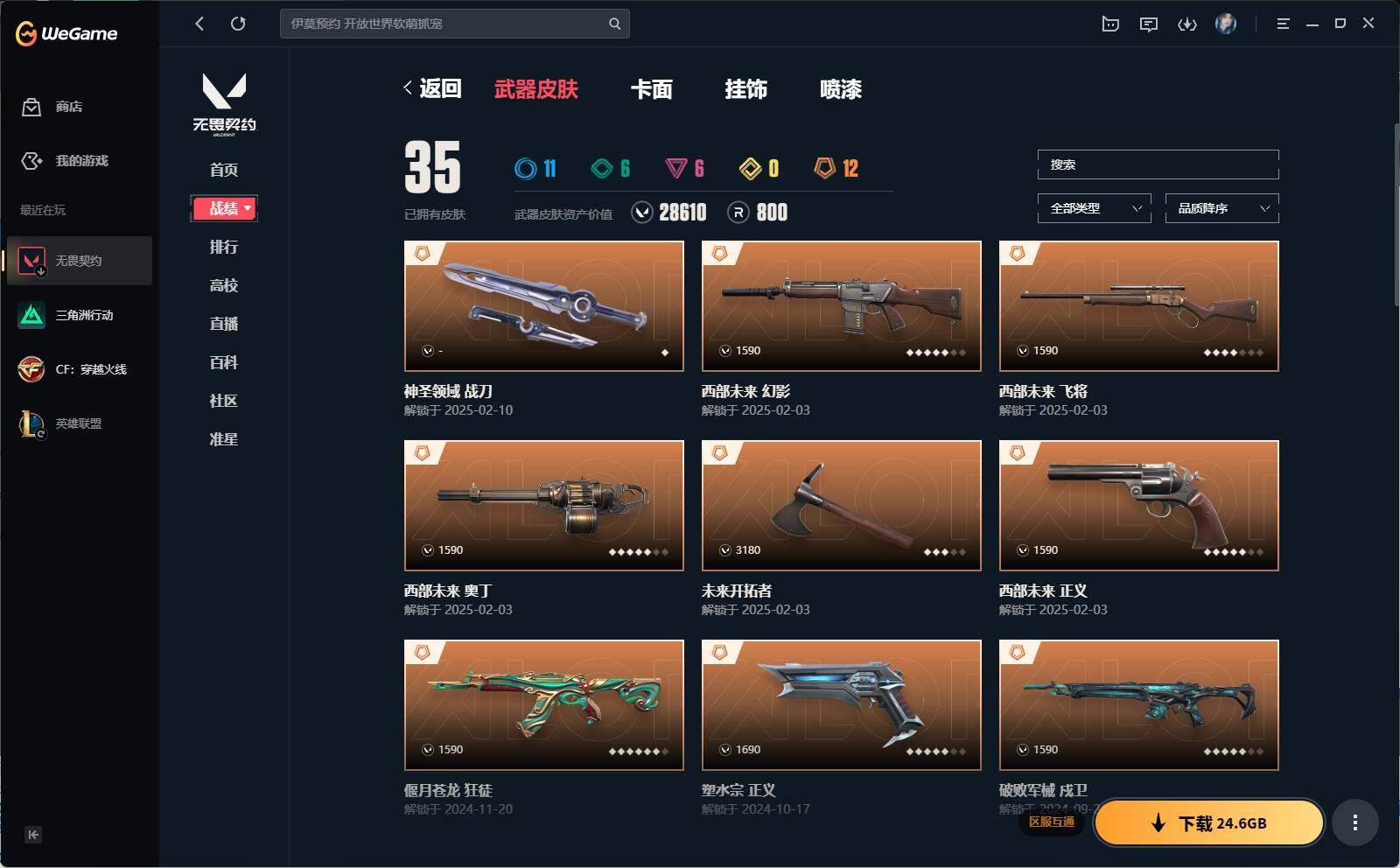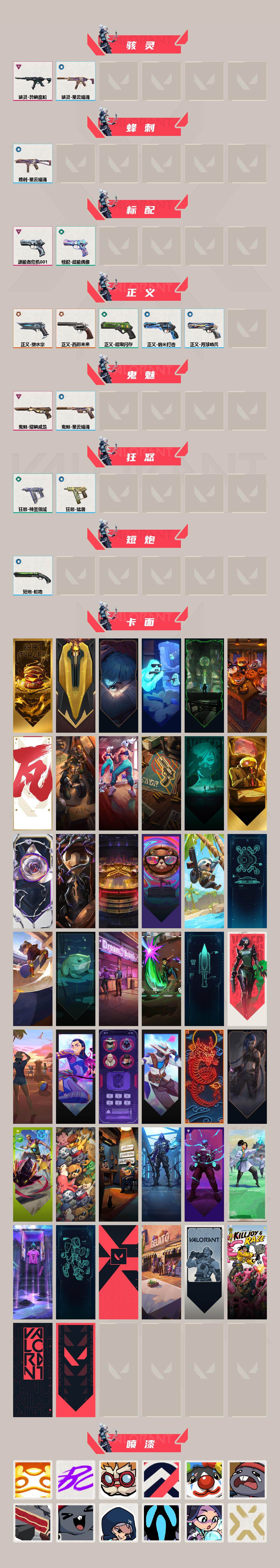 【1222】xl20282 【套装】:西部未来套装,耀鳞威龙套装 【英雄】:幻棱,炼狱,维斯,暮蝶,钛狐,壹决,铁臂,捷风,雷兹,幽影,不死鸟,贤者,猎枭,蝰蛇,零,芮娜,奇乐,尚勃勒,霓虹,斯凯,夜露,星礈,k/o,海神,盖可,黑梦,钢锁 【近战 武器】:近战武器-威龙之刃,近战武器-未来开拓者,近战武器-神圣领域 战刀 【狂徒】:狂徒-偃月苍龙,狂徒-耀鳞威龙 【幻影】:幻影-西部未来,幻影-侦察力量,幻影-神圣领域,幻影-西部未来 【戍卫】:戍卫-破败军械,戍卫-月球哨兵 【獠犬】:獠犬-神圣领域 【冥驹】:冥驹-堕天遗武,冥驹-星云暗涌 【飞将】:飞将-塑水宗,飞将-西部未来 【莽侠】:莽侠-rgx 11z pro//3.0,莽侠-月球哨兵 【战神】:战神-神圣领域 【奥丁】:奥丁-西部未来 【雄鹿】:雄鹿-月球哨兵 【骇灵】:骇灵-异鳞魔蛇,骇灵-星云暗涌 【蜂刺】:蜂刺-星云暗涌 【标配】:标配-源能者危机001,标配-超能偶像 【正义】:正义-塑水宗,正义-西部未来,正义-超限闪存,正义-纳米打击,正义-月球哨兵 【鬼魅】:鬼魅-耀鳞威龙,鬼魅-星云暗涌 【狂怒】:狂怒-神圣领域,狂怒-猛袭 【短炮】:短炮-蛇吻 【卡面】:终章:激斗汉堡 卡面,进入射程 卡面,《双城之战》拥抱 卡面,精灵大战 卡面,欢迎来到底城 卡面,南瓜盛典 卡面,vct cn首冠 卡面,修车达人 卡面,热舞环节 卡面,正义的化身 卡面,至黑之夜 卡面,终章:生意人麦宝 卡面,铁之华 卡面,时间到 卡面,最高舞台 卡面,音熊登场 卡面,树懒大作战 卡面,声感陷阱设计图 卡面,clutch 卡面,霓帧牛蛙 卡面,梦幻奶茶 卡面,源能反应 卡面,零点嗅探设计图 卡面,无畏契约:蝰蛇 卡面,沙雕爆能器 卡面,无畏契约go!第一卷:芮娜 卡面,清除名单 卡面,无畏契约go!第一卷:零 卡面,龍记 卡面,《双城之战》金克丝 卡面,势不可挡//盖可 卡面,同步耍酷 卡面,完美调谐 卡面 ,暗呛 卡面,势不可挡//k/o 卡面,夯实根基 卡面,"luie" 卡面,铁臂设计图 卡面,代号红色 卡面,冰淇淋店 卡面,新兵报到 卡面,友军火力 卡面,v契约 卡面,无畏契约 卡面 【喷漆】:嗨宝南瓜灯 喷漆,嘭! 喷漆,都算到了 喷漆,控场勿近 喷漆,小丑猫 喷漆,熊抱 喷漆,蛋糕还是爆能器? 喷漆,超级粉丝 喷漆,捷风差距 喷漆,惊声尖叫 喷漆,水晶球 喷漆,2021冠军巡回赛花火 喷漆,战术熊的巴拉莱卡琴 喷漆,拼一呛 喷漆,我觉得不行 喷漆,蝰蛇 喷漆,我的刀呢? 喷漆,致命毒素 喷漆,喜欢哪种毒? 喷漆,新潮流 喷漆,双击点赞 喷漆,买装还是存钱 喷漆,醒狮贺春 喷漆,红鳞 喷漆,旅行小熊 喷漆,蕊形灯 喷漆,老铁困了 喷漆,口袋贤者 喷漆,胜利属于无畏契约 喷漆,glhf 喷漆,无畏契约 喷漆 【挂饰】:终章:猫猫木乃伊 挂饰,悠闲鸡块 挂饰,伞绳 挂饰,《双城之战》小蛋糕 挂饰,第九季//第三幕 纪念币 挂饰,工具腰带 挂饰,鱼骨头 挂饰,熔岩灯 挂饰,瞬云履 挂饰,第九季//第二幕 纪念币 挂饰,终章:这瓜保熟 挂饰,糖葫芦 挂饰,袖珍捷风 挂饰,丢麦 挂饰,迷你浓缩 挂饰,尤克里里 挂饰,z世代特饮 挂饰,第九季//第一幕 纪念币 挂饰,战术河童 挂饰,荧光棒 挂饰,化学容器 挂饰,第八季//第三幕 纪念币 挂饰,第八季//第二幕 纪念币 挂饰 ,天外飞客 挂饰,好运福爪 挂饰,《双城之战》魄罗 挂饰,酷闪轮滑 挂饰,瞄这里 挂饰,第八季//第一幕 纪念币 挂饰,冬日絮语 挂饰,第七季//第三幕 纪念币 挂饰,幸运中国结 挂饰,第七季//第二幕 纪念币 挂饰,无畏契约 纪念币 挂饰