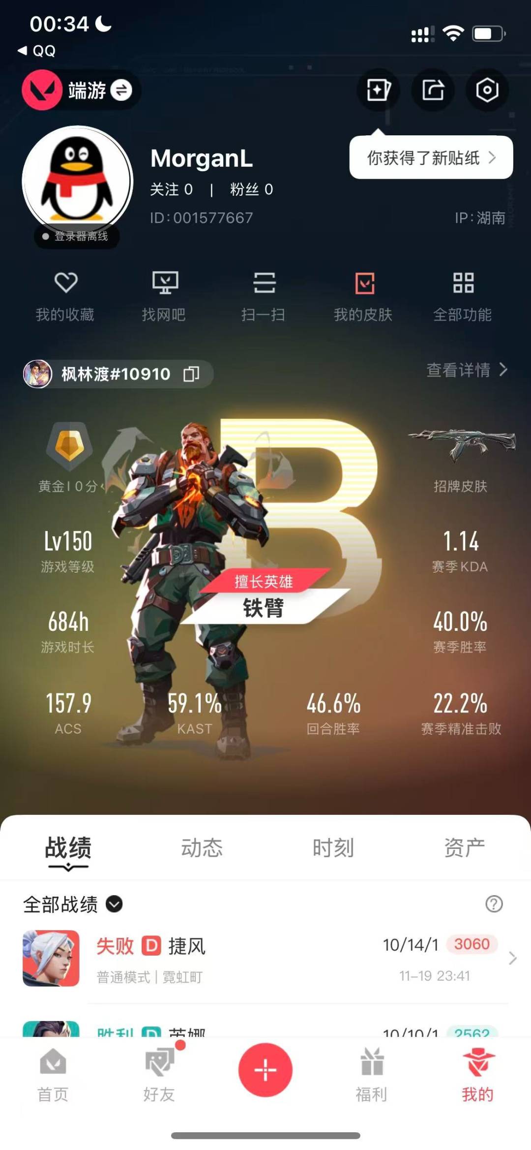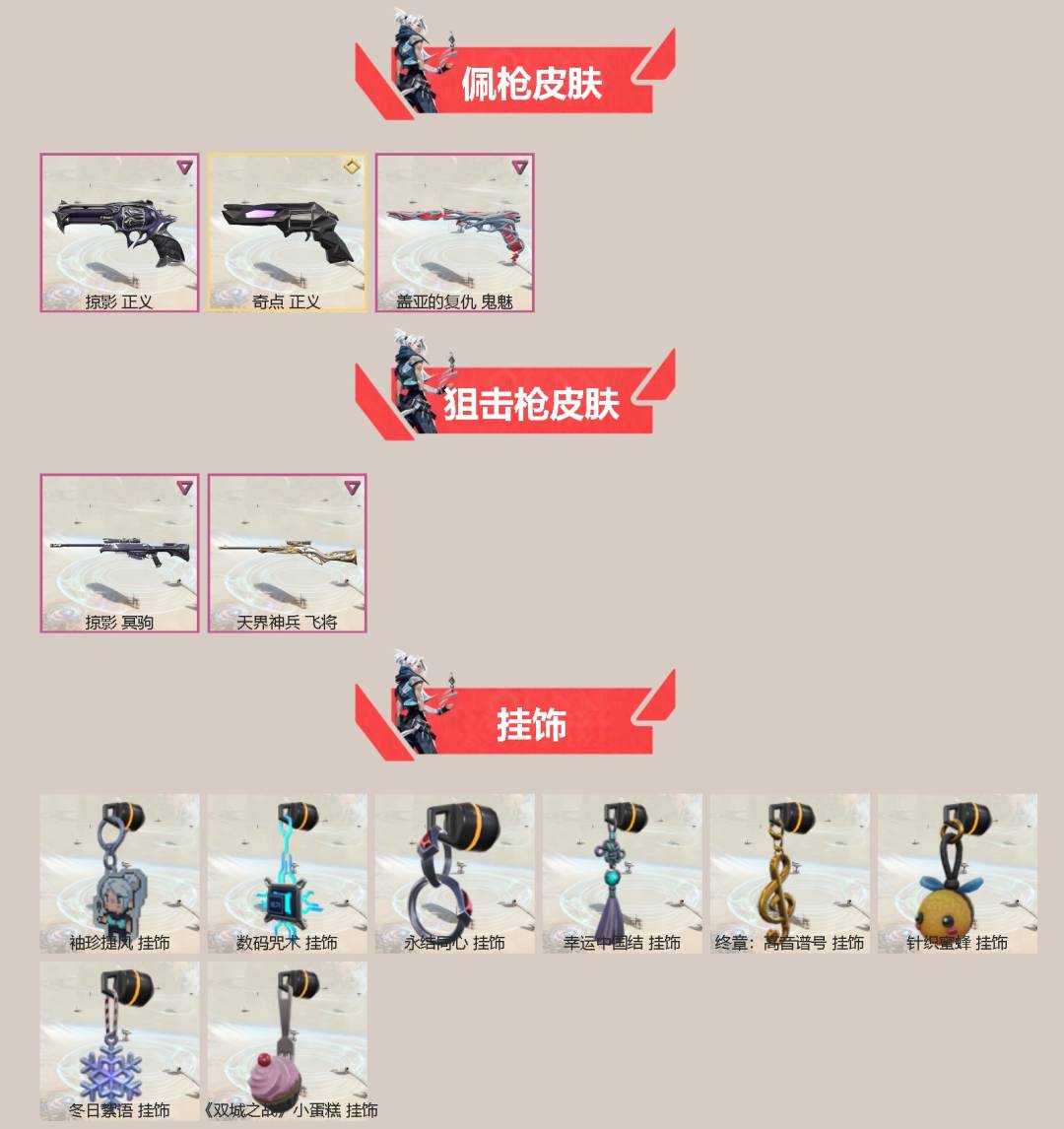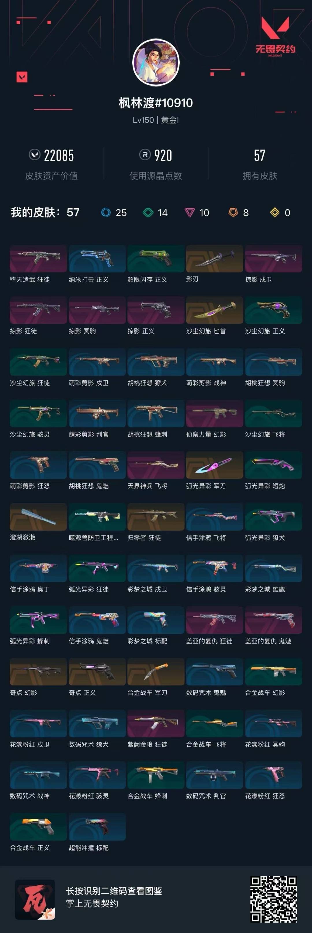 8橙皮 10紫皮 57皮肤 28英雄 109卡面 920已用源晶 黄金段位 【套装】:掠影套装 【近战武器皮肤】:影刃澄湖潋滟匕首-沙尘幻旅军刀-弧光异彩军刀-合金战车 【佩呛皮肤】:正义-掠影正义-奇点鬼魅-盖亚的复仇 【步呛皮肤】:狂徒-掠影戍卫-掠影狂徒-紫阙金琅狂徒-盖亚