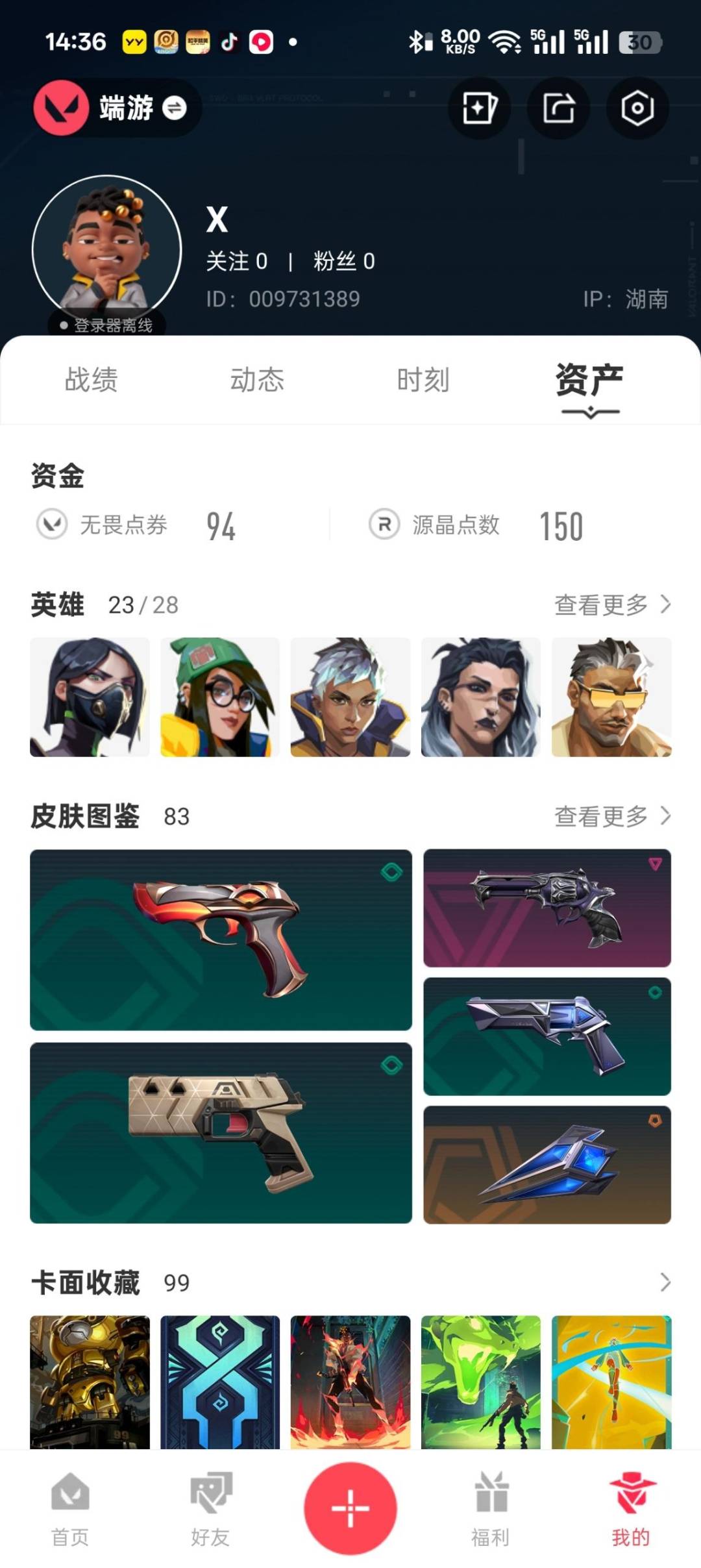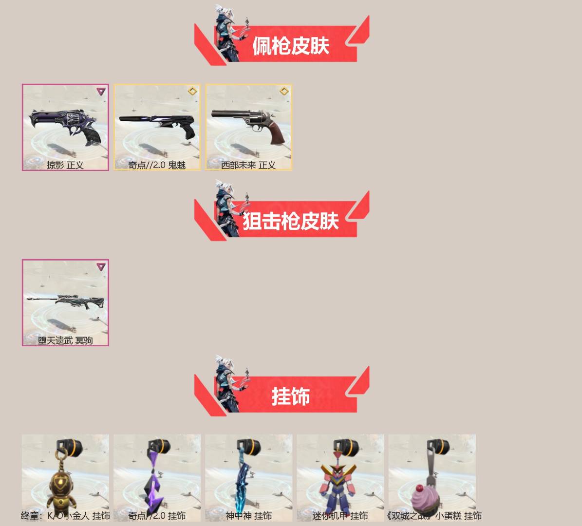 12橙皮 1金皮 9紫皮 83皮肤 23英雄 99卡面 960已用源晶 未定级段位 【套装】:奇点//2.0套装 【近战武器皮肤】:神圣领域 战刀诡秘蛇影匕首-超限闪存荒土机兵热能刀鬼丸国纲蝴蝶刀-奇点//2.0 【佩呛皮肤】:鬼魅-奇点//2.0正义-掠影正义-西部未来 【步呛皮肤