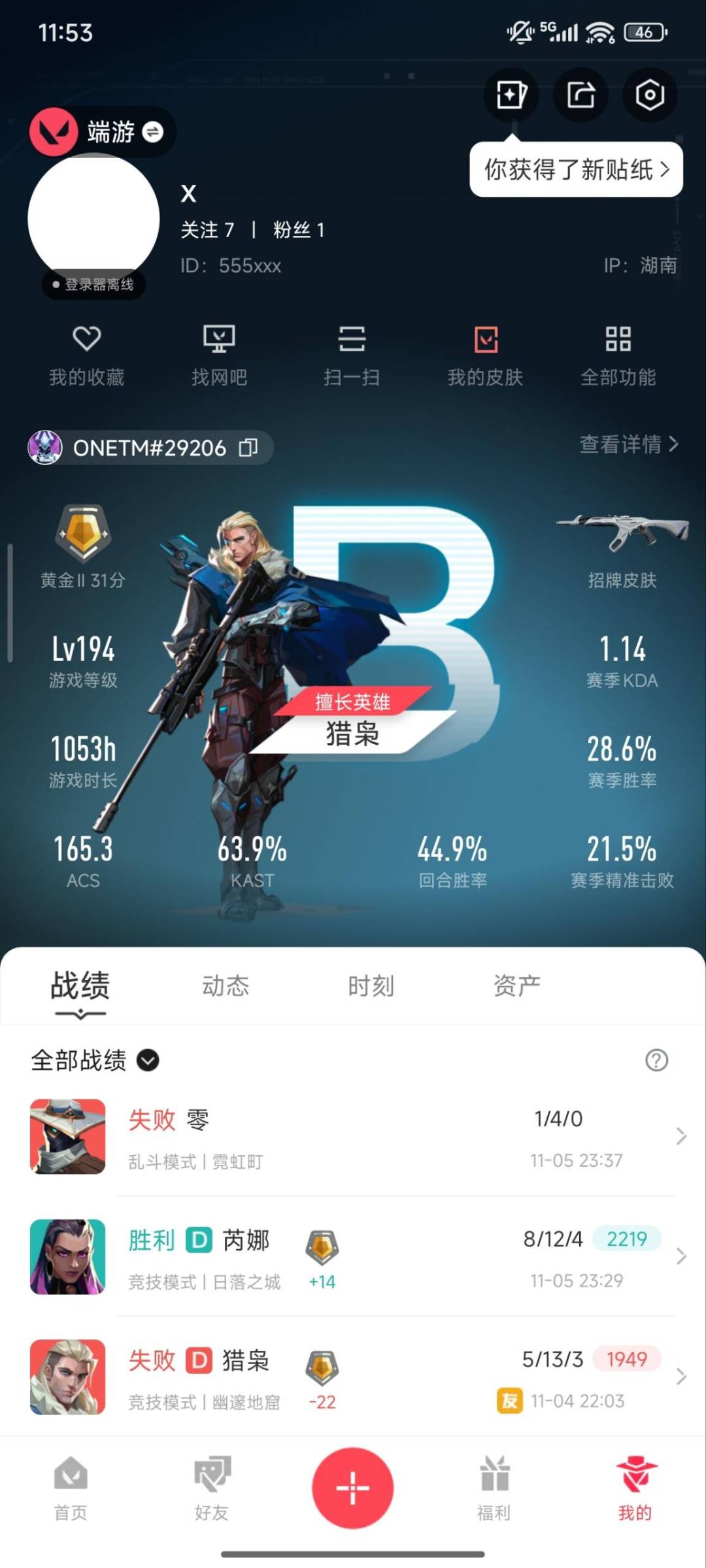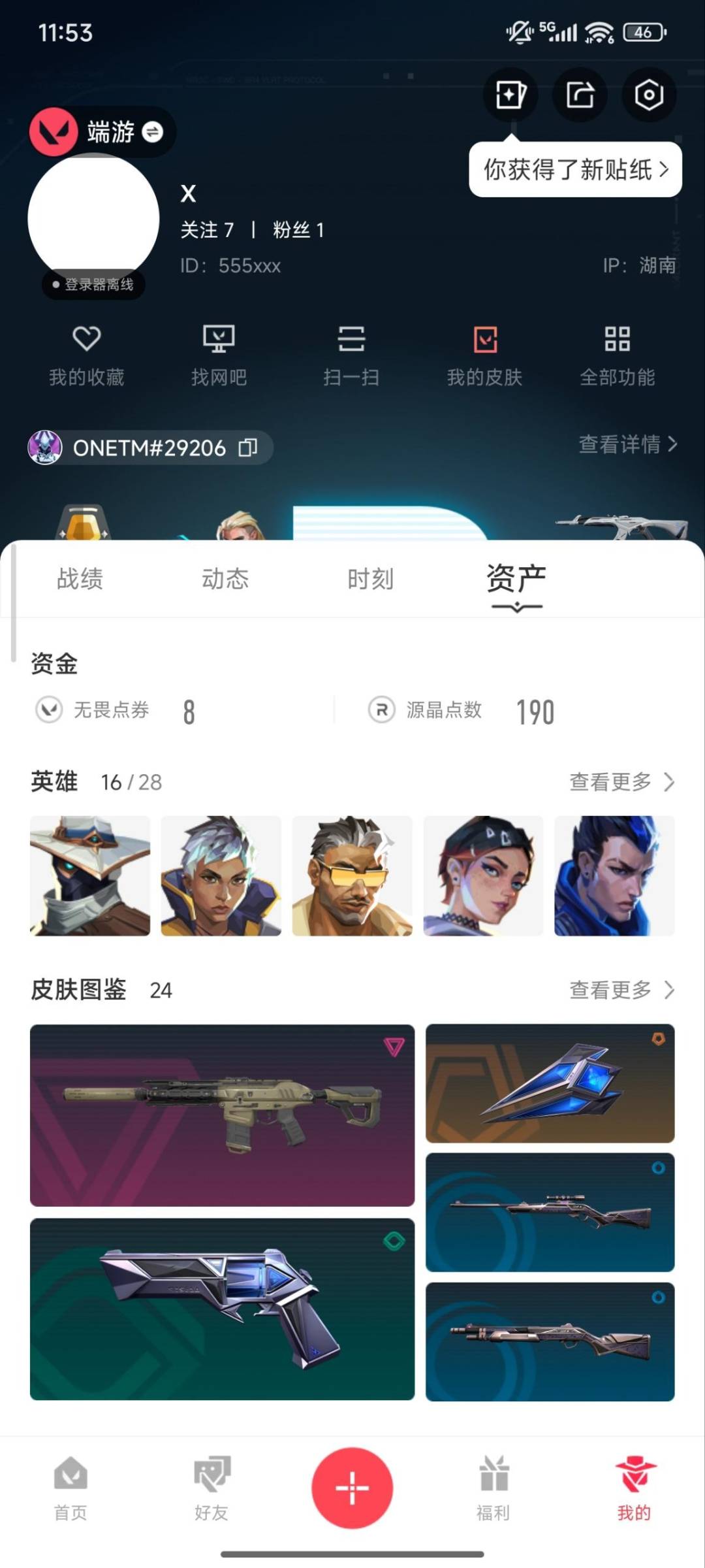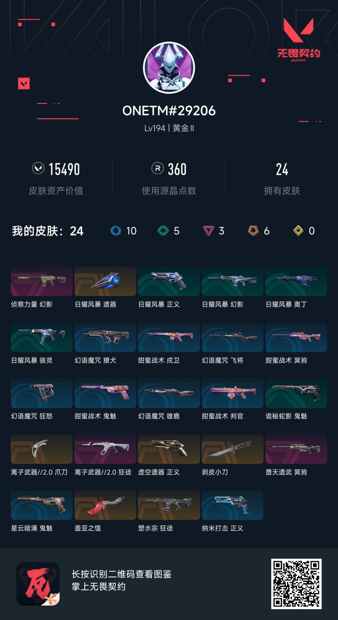 6橙皮 3紫皮 24皮肤 16英雄 79卡面 360已用源晶 黄金段位 【近战武器皮肤】:离子武器2.0 爪刀剥皮小刀盖亚之愠 【佩呛皮肤】:正义-虚空遗器 【步呛皮肤】:狂徒-离子武器2.0狂徒-塑水宗幻影-侦察力量 【狙击呛皮肤】:冥驹-堕天遗武 【挂饰】:薰衣草之心挂饰双城之战小蛋