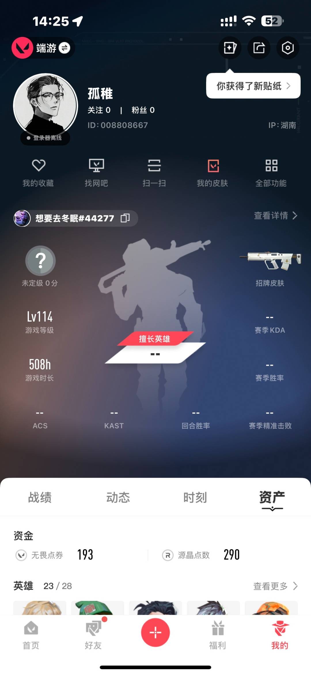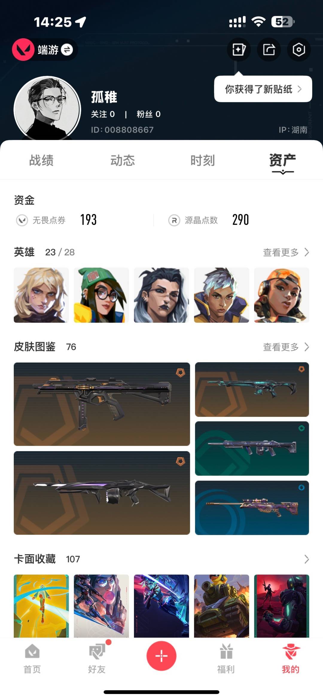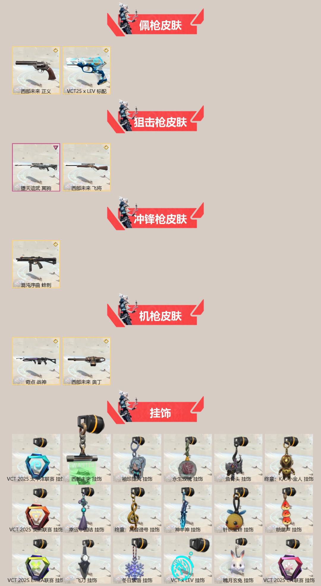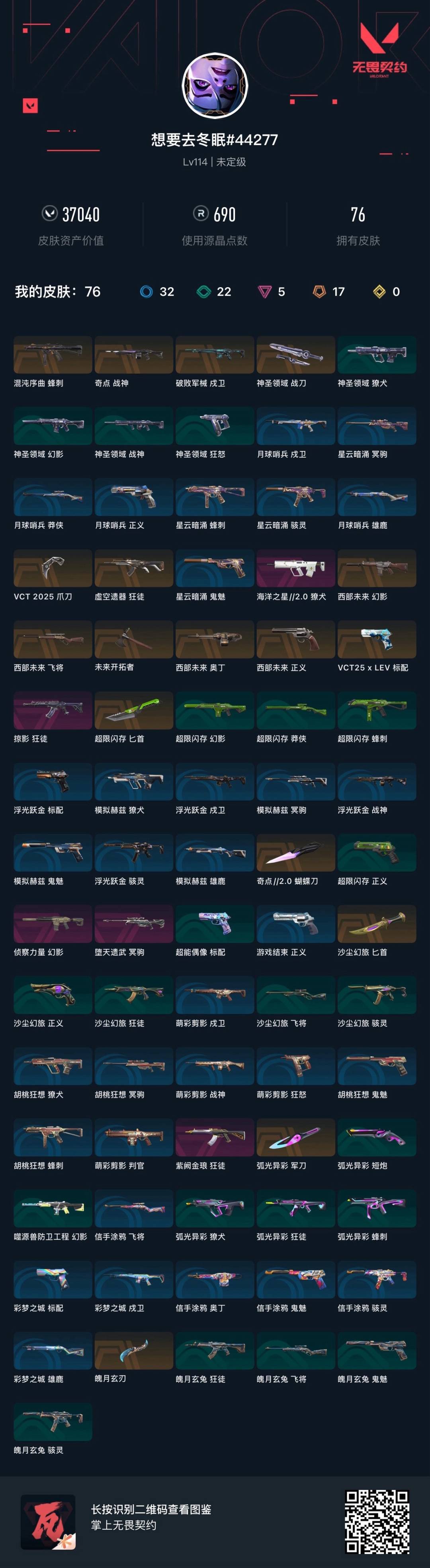 17橙皮 5紫皮 76皮肤 23英雄 107卡面 690已用源晶 未定级段位 【套装】:魄月玄兔套装vct 2025赛季礼包西部未来vcn2025套装 【近战武器皮肤】:匕首-超限闪存蝴蝶刀-奇点//2.0神圣领域 战刀vct 2025 爪刀未来开拓者魄月玄刃匕首-沙尘幻旅