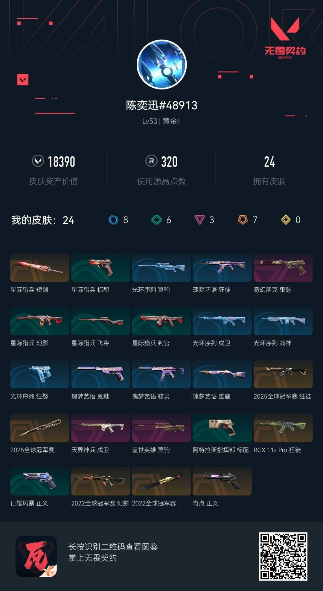 7橙皮 3紫皮 24皮肤 13英雄 40卡面 320已用源晶 黄金段位 【亮点皮肤】:幻影-2022全球冠军赛蝴蝶刀-2022全球冠军赛 【套装】:2025全球冠军赛2022全球冠军赛 【近战武器皮肤】:2025全球冠军赛 蝴蝶刀星际猎兵 短剑 【佩呛皮肤】:正义-奇点鬼魅-奇幻朋克 【步