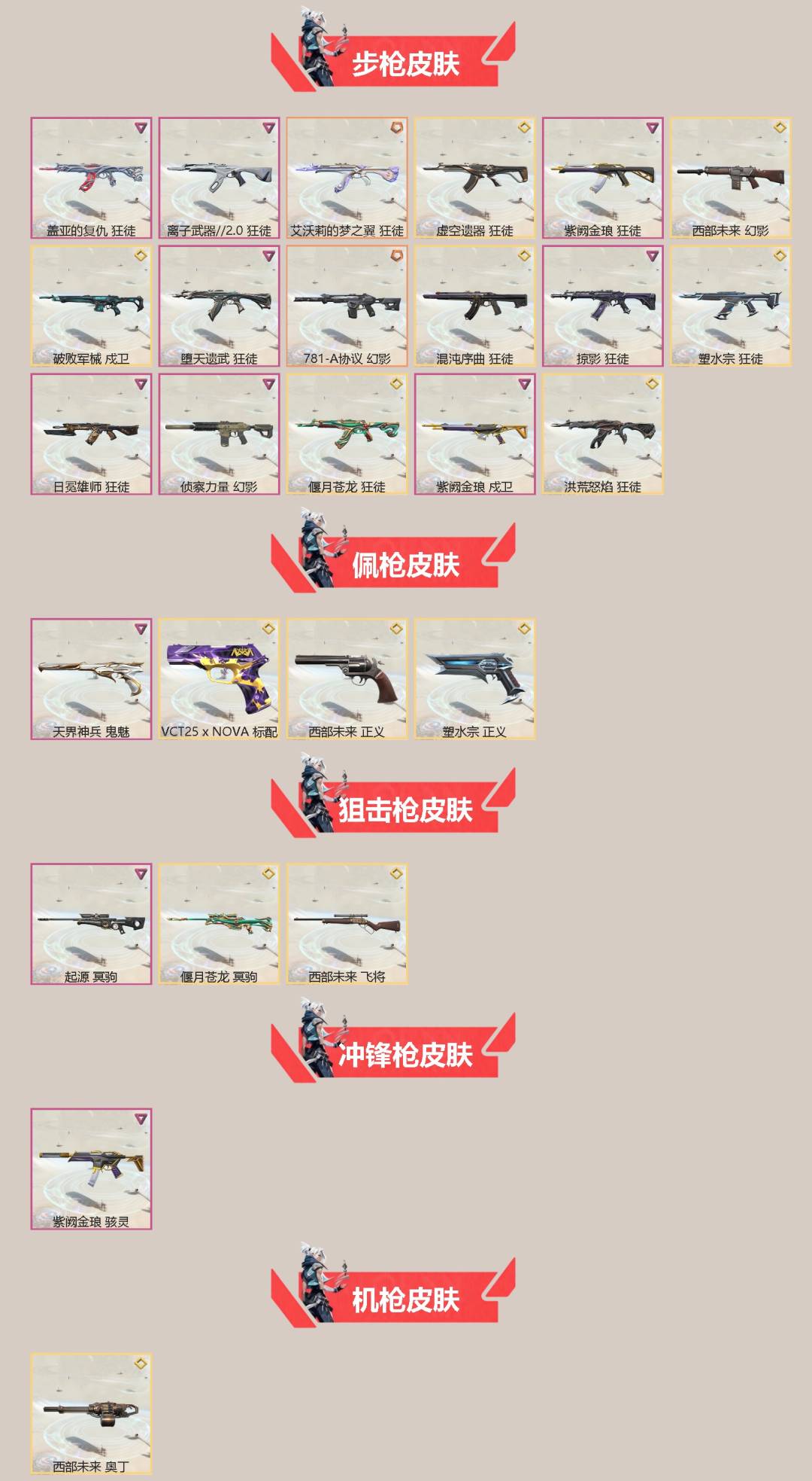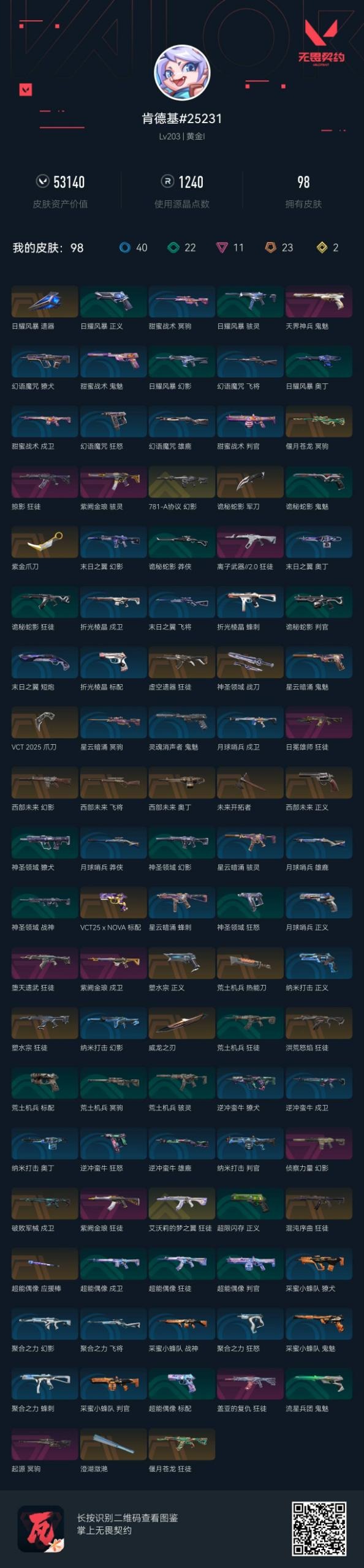 23橙皮 2金皮 11紫皮 98皮肤 18英雄 153卡面 1240已用源晶 未定级段位 【套装】:vct 2025赛季礼包西部未来vcn2025套装 【近战武器皮肤】:神圣领域 战刀未来开拓者vct 2025 爪刀诡秘蛇影荒土机兵热能刀紫金爪刀威龙之刃澄湖潋滟超能偶像 应