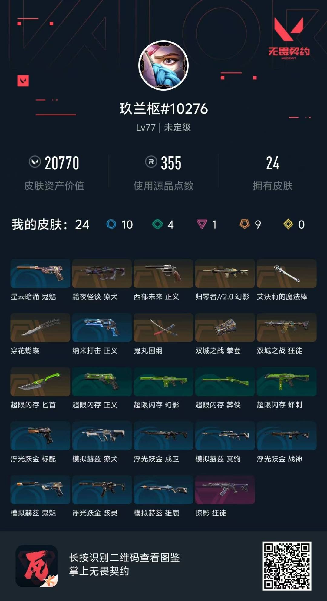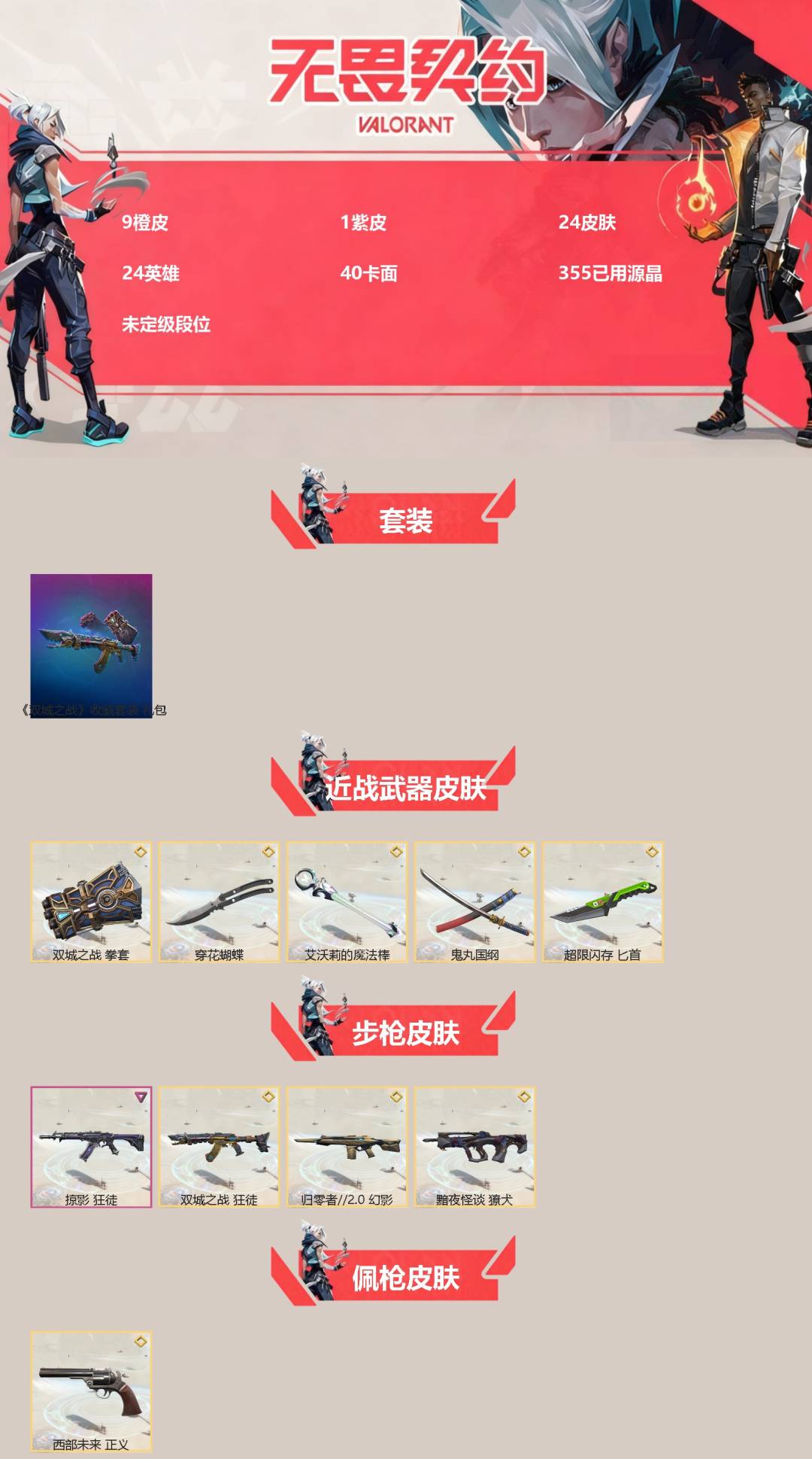 9橙皮 1紫皮 24皮肤 24英雄 40卡面 355已用源晶 未定级段位 【套装】:《双城之战》收藏套装 【近战武器皮肤】:匕首-超限闪存穿花蝴蝶鬼丸国纲拳套-双城之战艾沃莉的魔法棒 【佩呛皮肤】:正义-西部未来 【步呛皮肤】:獠犬-黯夜怪谈幻影-归零者//2.0狂徒-双城之战狂徒-