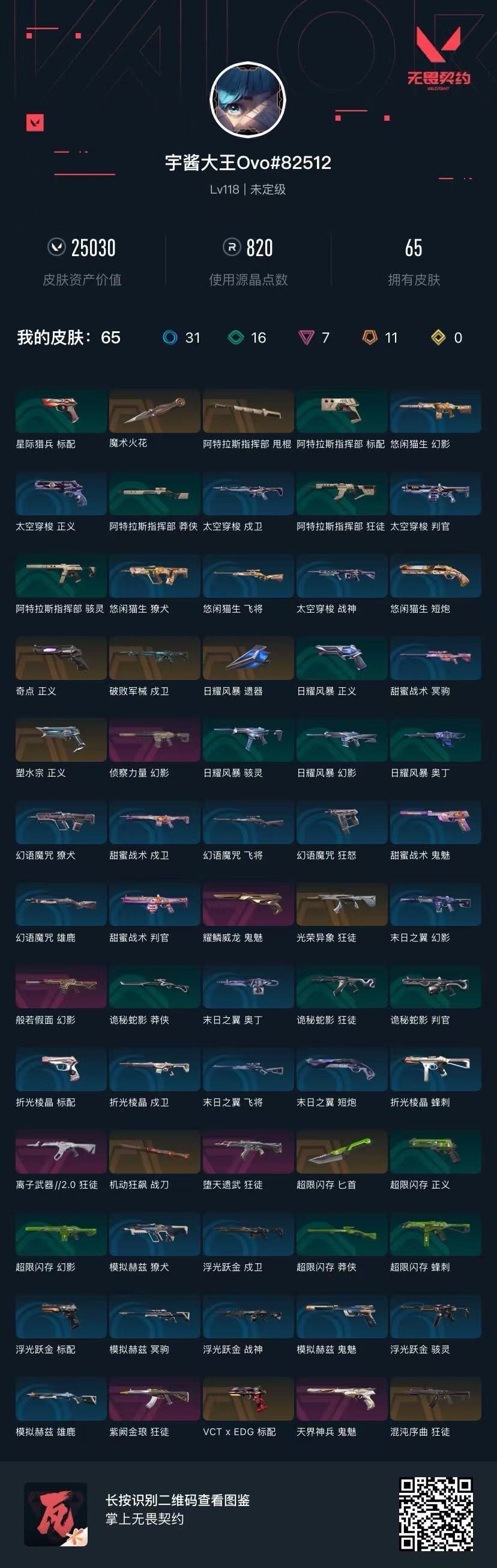 11橙皮 7紫皮 65皮肤 27英雄 95卡面 820已用源晶 未定级段位 【近战武器皮肤】:匕首-超限闪存阿特拉斯指挥部魔术火花机动狂飙战刀 【佩呛皮肤】:正义-奇点正义-塑水宗鬼魅-耀鳞威龙鬼魅-天界神兵标配-vctxedg 【步呛皮肤】:狂徒-离子武器2.0狂徒-混沌序曲狂