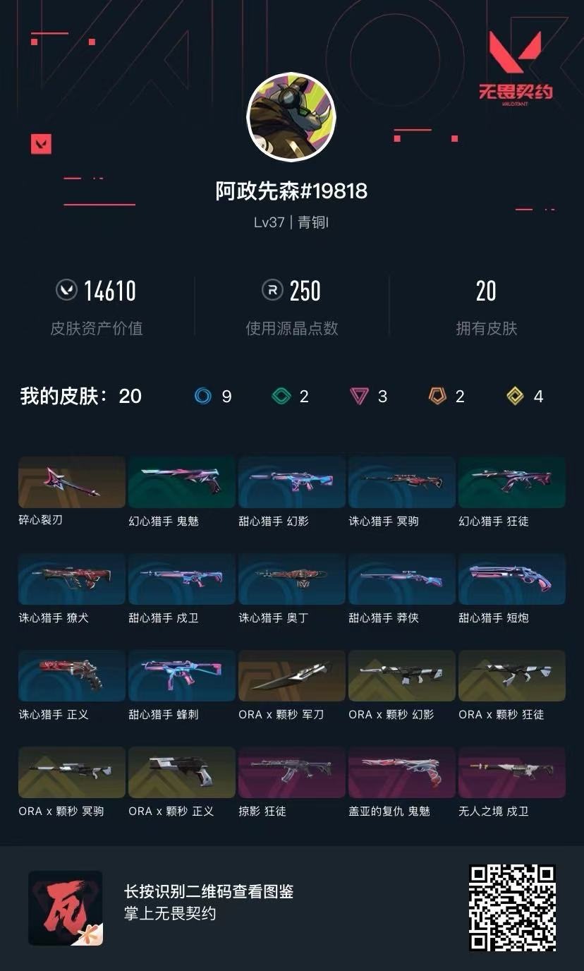 2橙皮 4金皮 3紫皮 20皮肤 13英雄 27卡面 250已用源晶 青铜段位 【套装】:ax颗秒 【近战武器皮肤】:ax颗秒 军刀碎心裂刃 【佩呛皮肤】:正义-ax颗秒鬼魅-盖亚的复仇 【步呛皮肤】:狂徒-ax颗秒狂徒-掠影幻影-ax颗秒戍卫-无人之境 【狙击呛皮肤