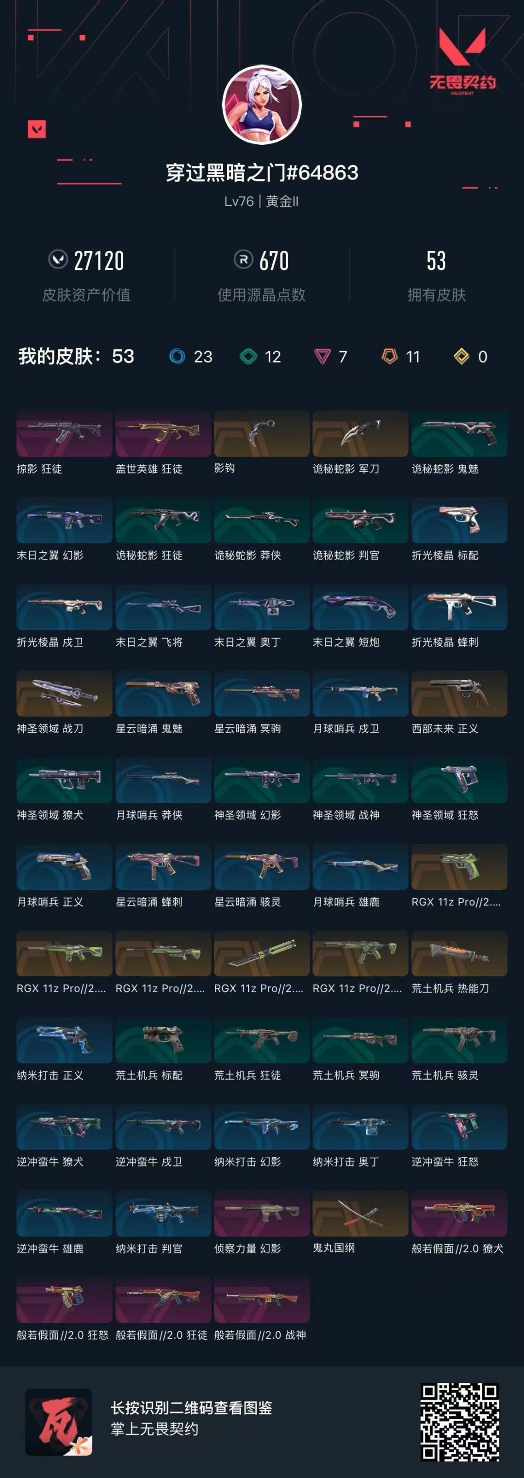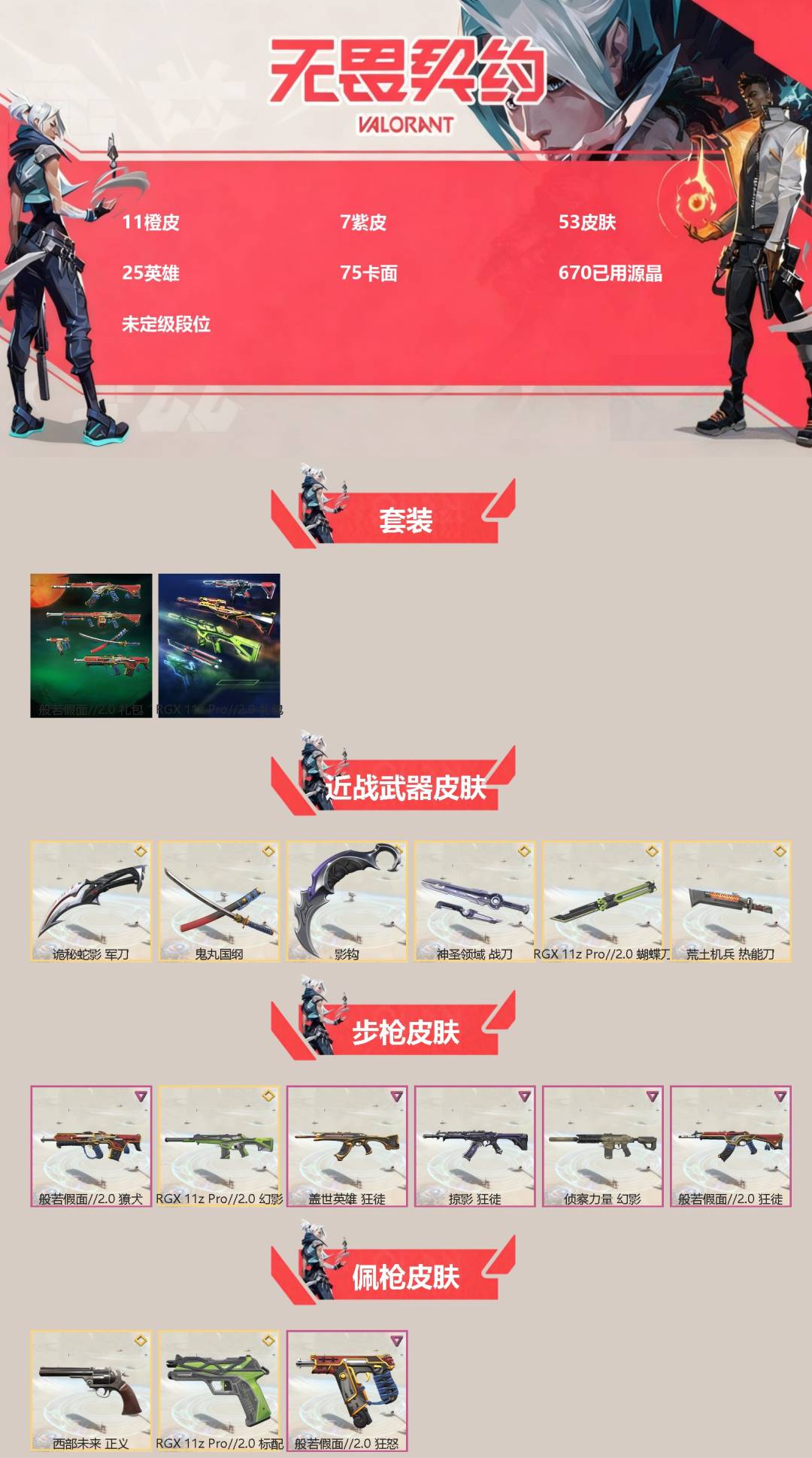 11橙皮 7紫皮 53皮肤 25英雄 75卡面 670已用源晶 未定级段位 【套装】:般若假面//2.0套装rgx 11z pro//2.0 【近战武器皮肤】:神圣领域 战刀rgx 11z pro//2.0 蝴蝶刀诡秘蛇影荒土机兵热能刀鬼丸国纲影钩 【佩呛皮肤】:狂怒-般若假面//2.