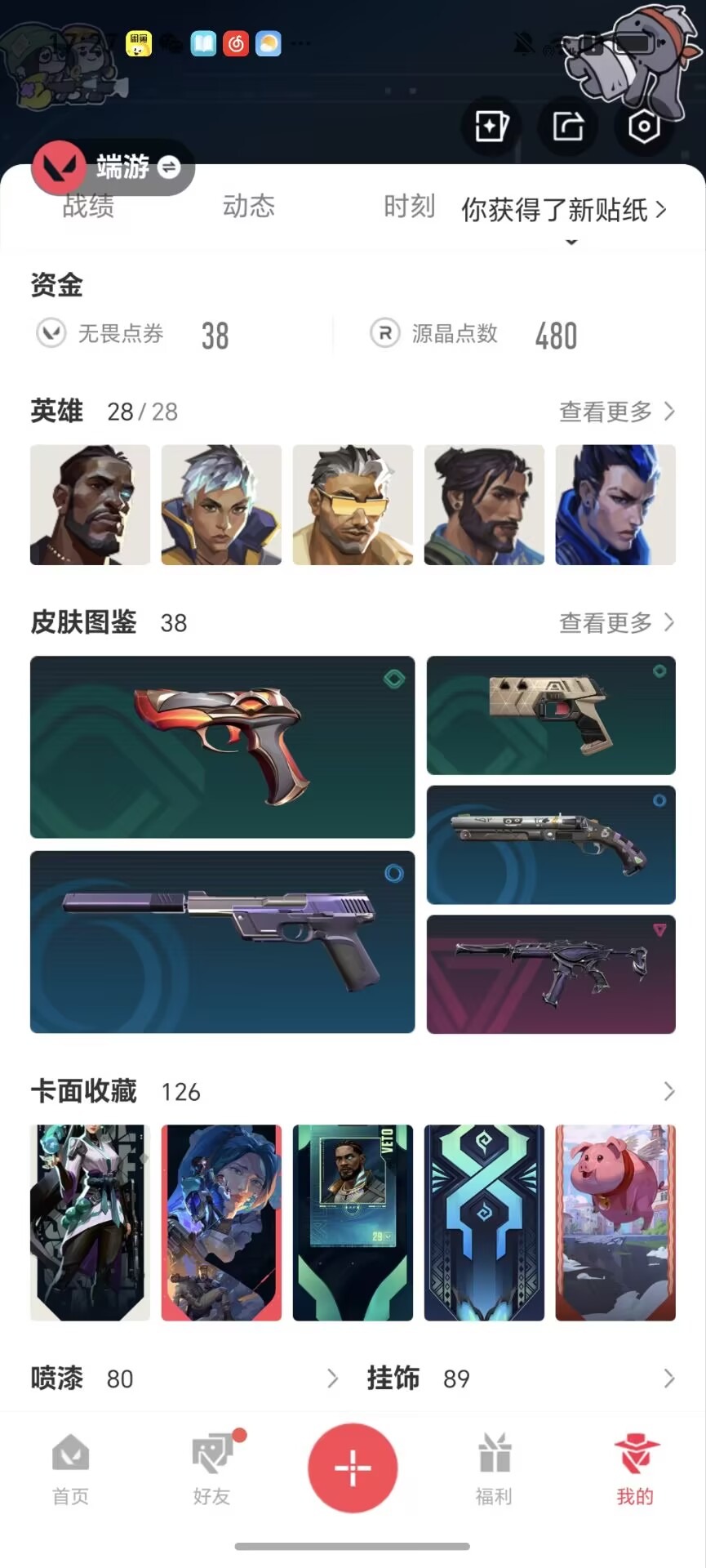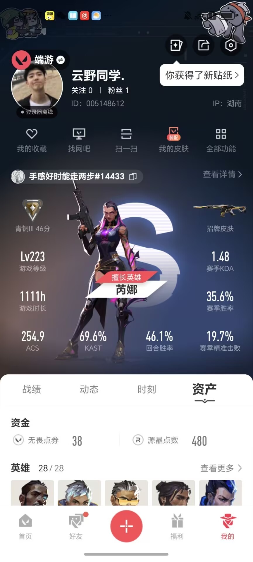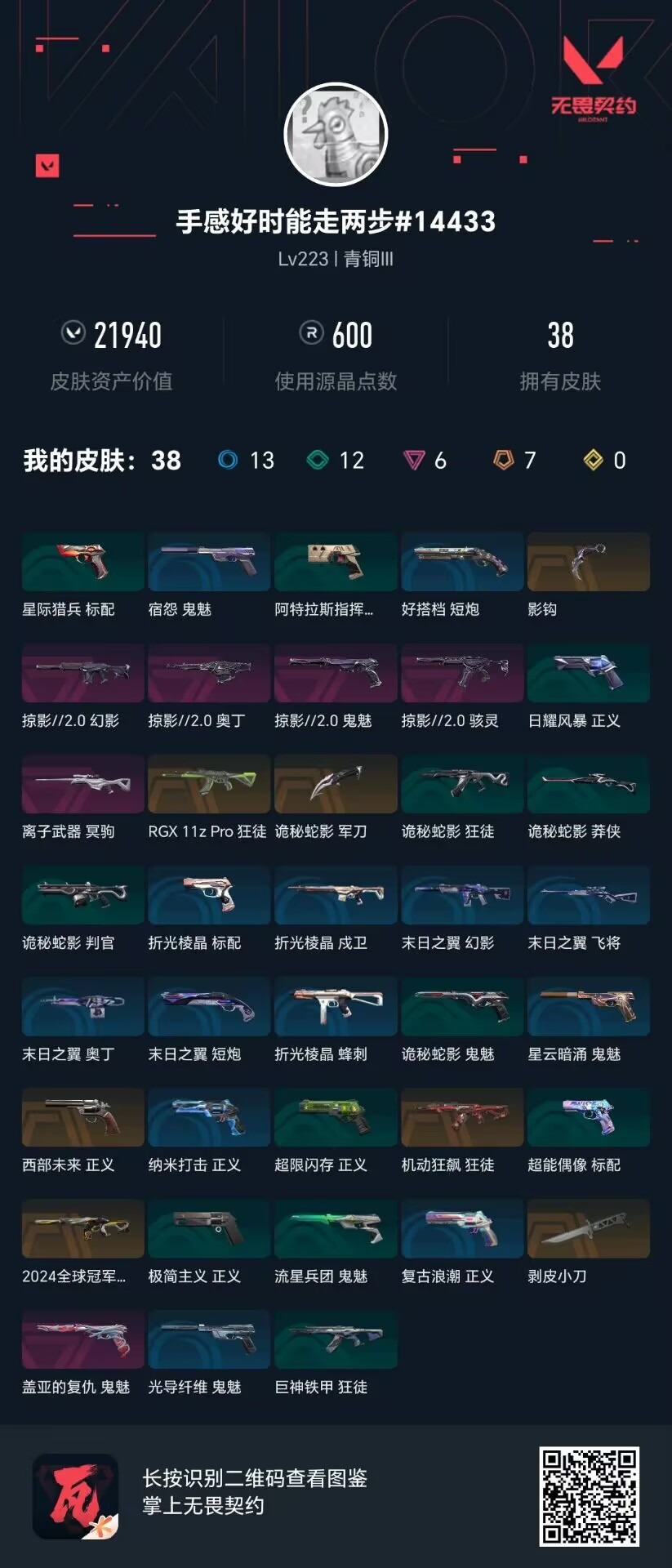 7橙皮 6紫皮 38皮肤 28英雄 126卡面 600已用源晶 青铜段位 【亮点皮肤】:幻影-2024全球冠军赛 【套装】:掠影2.0套装 【近战武器皮肤】:诡秘蛇影影钩剥皮小刀 【佩呛皮肤】:鬼魅-掠影2.0正义-西部未来鬼魅-盖亚的复仇 【冲锋呛皮肤】:骇灵-掠影2.0 【步呛皮肤】:
