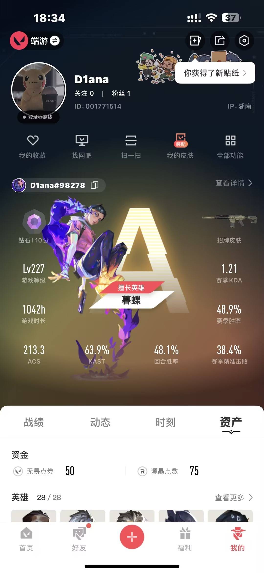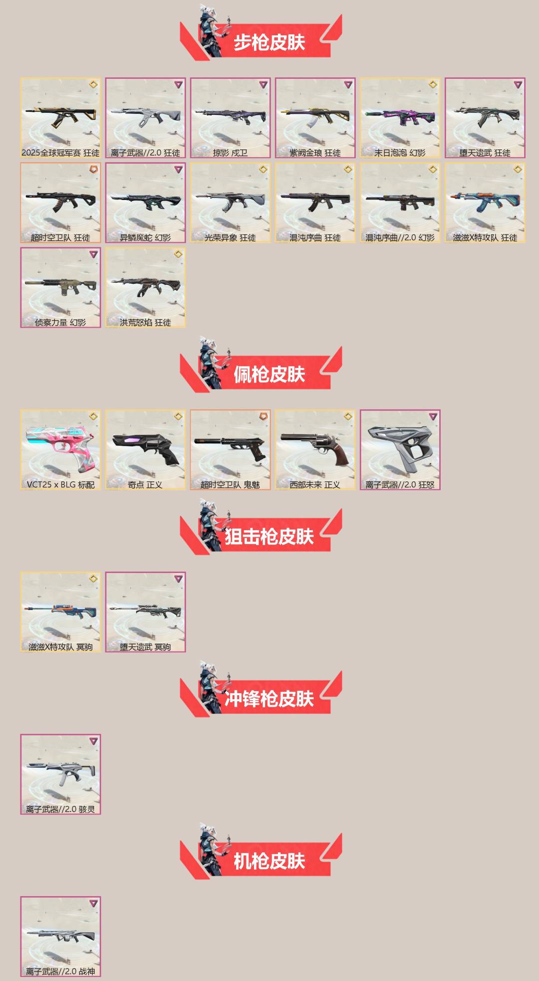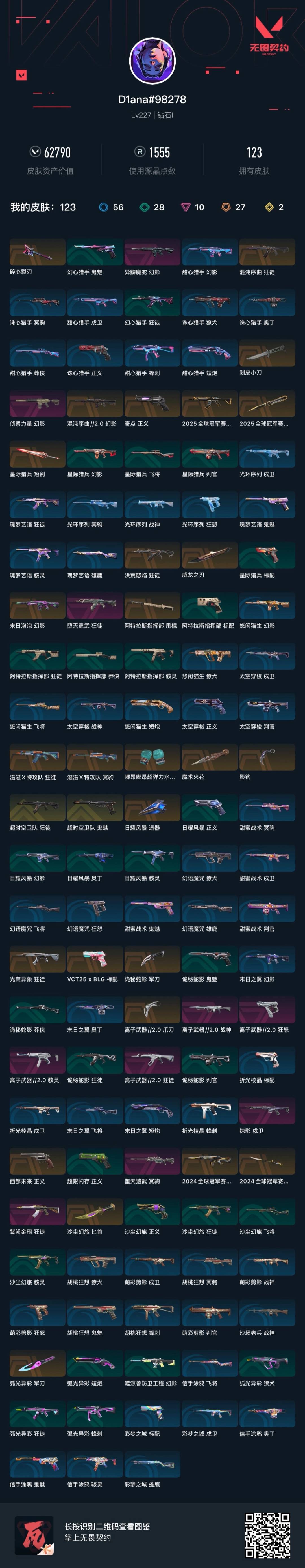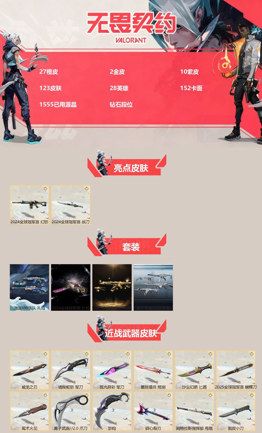 27橙皮 2金皮 10紫皮 123皮肤 28英雄 152卡面 1555已用源晶 钻石段位 【亮点皮肤】:幻影-2024全球冠军赛战刀-2024全球冠军赛 【套装】:2025全球冠军赛滋滋x特工队离子武器2.02024全球冠军赛套装 【近战武器皮肤】:影钩诡秘蛇影离子武器2.0 爪刀阿