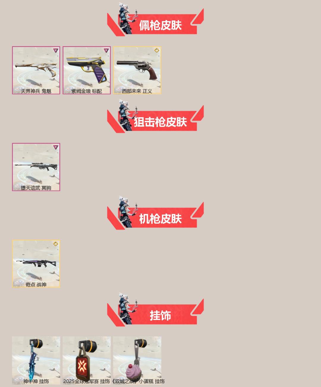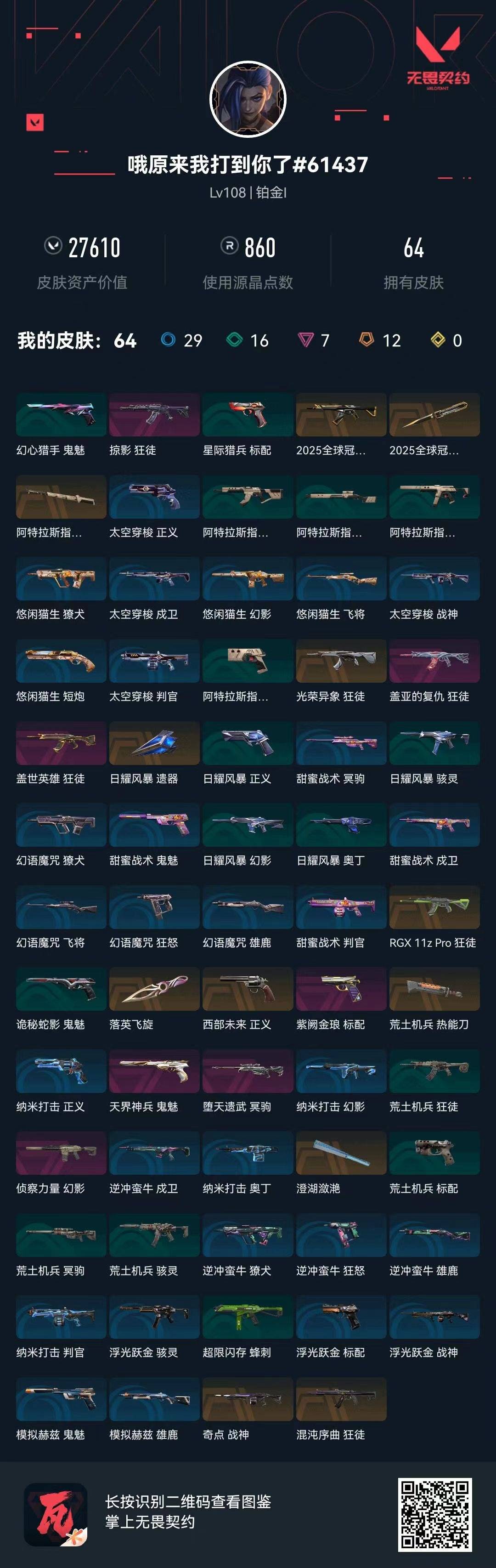 12橙皮 7紫皮 64皮肤 25英雄 86卡面 860已用源晶 铂金段位 【套装】:2025全球冠军赛 【近战武器皮肤】:荒土机兵热能刀阿特拉斯指挥部2025全球冠军赛 蝴蝶刀澄湖潋滟落英飞旋 【佩呛皮肤】:正义-西部未来鬼魅-天界神兵标配-紫阙金琅 【步呛皮肤】:狂徒-混沌序曲狂徒