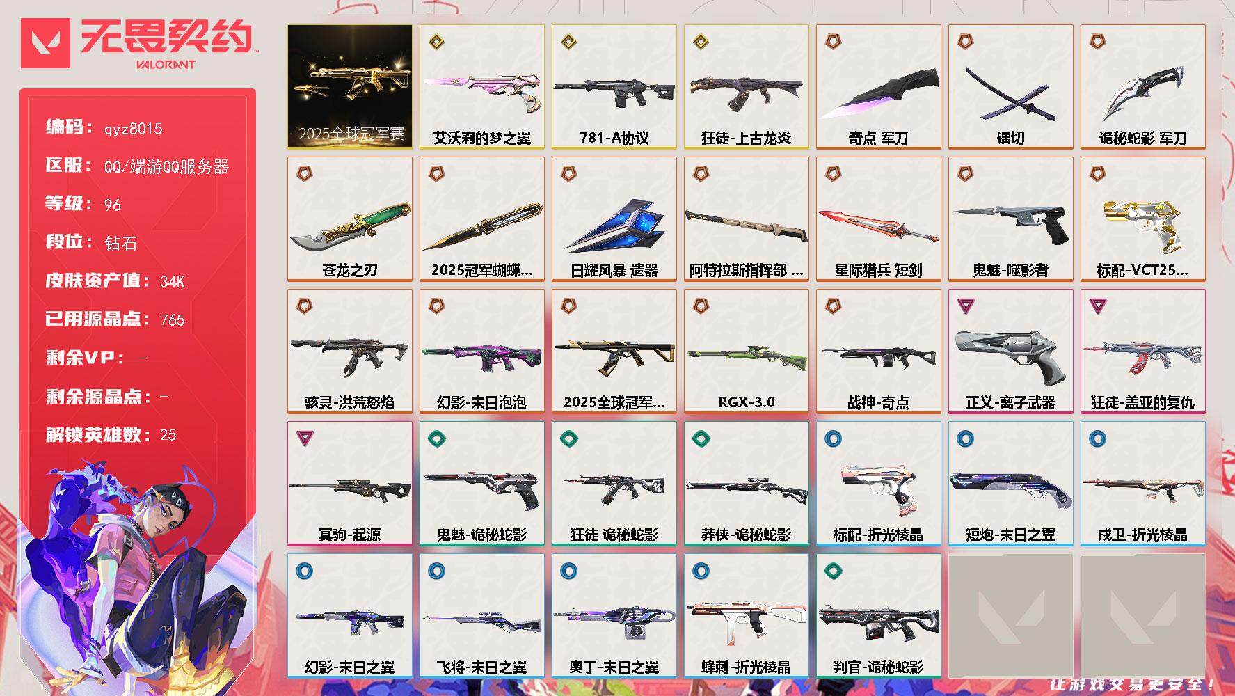25套装-奇点蝴蝶-镭切-五周年小刀-qyz8015-套装:-2025全球冠军赛-近战武器皮肤:-军刀-奇点镭切诡秘蛇影苍龙之刃2025全球冠军赛-蝴蝶刀-步呛皮肤:-狂徒-盖亚的复仇幻影-781-a协议狂徒-上古龙炎幻影-末日泡泡2025全球冠军赛-狂徒-佩呛皮肤:-正义-离子武器鬼魅-艾沃莉的梦之翼标配-vct25xbbl鬼魅-噬影者-狙击呛皮肤:-冥驹-起源莽侠-rgx-11z-pro-30-冲锋呛皮肤:-骇灵-洪荒怒焰-机呛皮肤:-战神-奇点-亮点:-【qyz8015】【套装】:2025全球冠军赛套装【英雄】:幻棱,炼狱,维斯,暮蝶,壹决,铁臂,捷风,雷兹,幽影,不死鸟,贤者,猎枭,蝰蛇,零,芮娜,奇乐,尚勃勒,霓虹,斯凯,夜露,星礈,k/o,海神,盖可,钢锁【近战-武器】:近战武器-2025全球冠军赛-蝴蝶刀,近战武器-5周年//公测重制版-苍龙之刃,近战武器-奇点-军刀,近战武器-镭切,近战武器-诡秘蛇影-军刀,近战武器-日耀风暴-遗器,近战武器-阿特拉斯指挥部-甩棍,近战武器-星际猎兵-短剑【狂徒】:狂徒-上古龙炎,狂徒-2025全球冠军赛,狂徒-盖亚的复仇,狂徒-诡秘蛇影【幻影】:幻影-781-a协议,幻影-末日泡泡,幻影-末日之翼【戍卫】:戍卫-折光棱晶【冥驹】:冥驹-起源【飞将】:飞将-末日之翼【莽侠】:莽侠-rgx-11z-pro//30,莽侠-诡秘蛇影【战神】:战神-奇点【奥丁】:奥丁-末日之翼【判官】:判官-诡秘蛇影【骇灵】:骇灵-洪荒怒焰【蜂刺】:蜂刺-折光棱晶【标配】:标配-折光棱晶【vct手呛】:标配-vct25-x-bbl【正义】:正义-离子武器【鬼魅】:鬼魅-艾沃莉的梦之翼,鬼魅-噬影者,鬼魅-诡秘蛇影【短炮】:短炮-末日之翼【卡面】:无畏契约go!第一卷:芮娜-卡面,无畏契约go!第一卷:零-卡面,《双城之战》金克丝-卡面,同步耍酷-卡面,代号红色-卡面,新兵报到-卡面,v契约-卡面,无畏契约-卡面【喷漆】:买装还是存钱-喷漆,胜利属于无畏契约-喷漆,glhf-喷漆,无畏契约-喷漆【挂饰】:鱼骨头-挂饰,天外飞客-挂饰,无畏契约-纪念币-挂饰