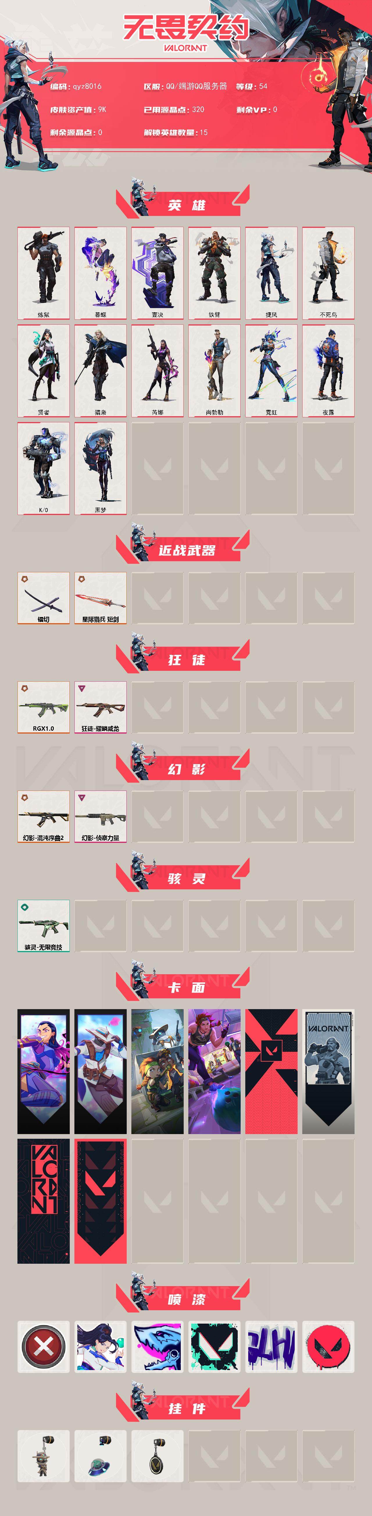 白银号-多热门-qyz8016-近战武器皮肤:-镭切-步呛皮肤:-幻影-侦察力量狂徒-耀鳞威龙狂徒-rgx-11z-pro幻影-混沌序曲20-亮点:-【qyz8016】【英雄】:炼狱,暮蝶,壹决,铁臂,捷风,不死鸟,贤者,猎枭,芮娜,尚勃勒,霓虹,夜露,k/o,黑梦【近战-武器】:近战武器-镭切,近战武器-星际猎兵-短剑【狂徒】:狂徒-rgx-11z-pro,狂徒-耀鳞威龙【幻影】:幻影-混沌序曲//20,幻影-侦察力量【骇灵】:骇灵-无限竞技【卡面】:无畏契约go!第一卷:芮娜-卡面,无畏契约go!第一卷:零-卡面,别冒尖-卡面,一击全倒-卡面,代号红色-卡面,新兵报到-卡面,v契约-卡面,无畏契约-卡面【喷漆】:买装还是存钱-喷漆,无畏契约go!第一卷:贤者-喷漆,暴走萝莉-喷漆,胜利属于无畏契约-喷漆,glhf-喷漆,无畏契约-喷漆【挂饰】:无畏契约go!第一卷-零-挂饰,天外飞客-挂饰,无畏契约-纪念币-挂饰