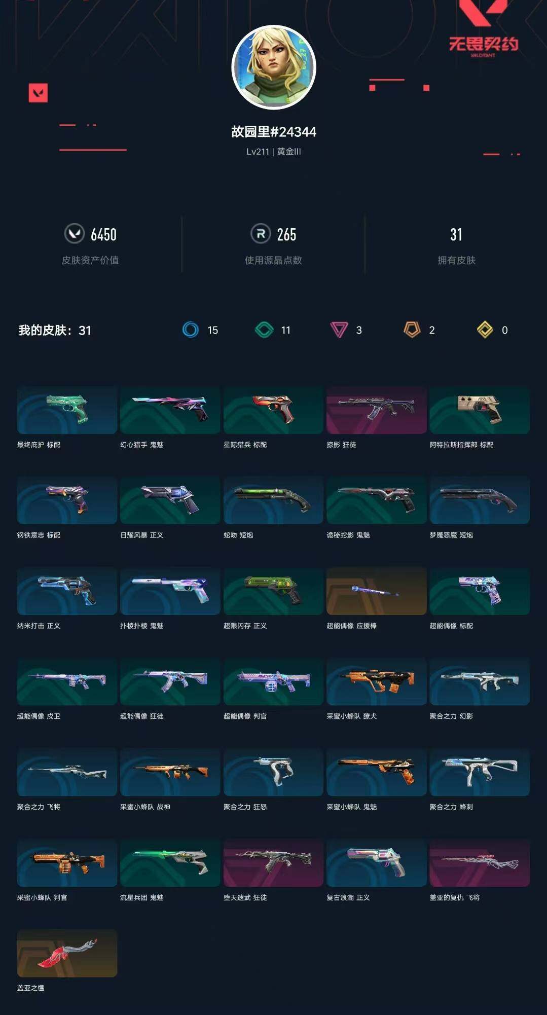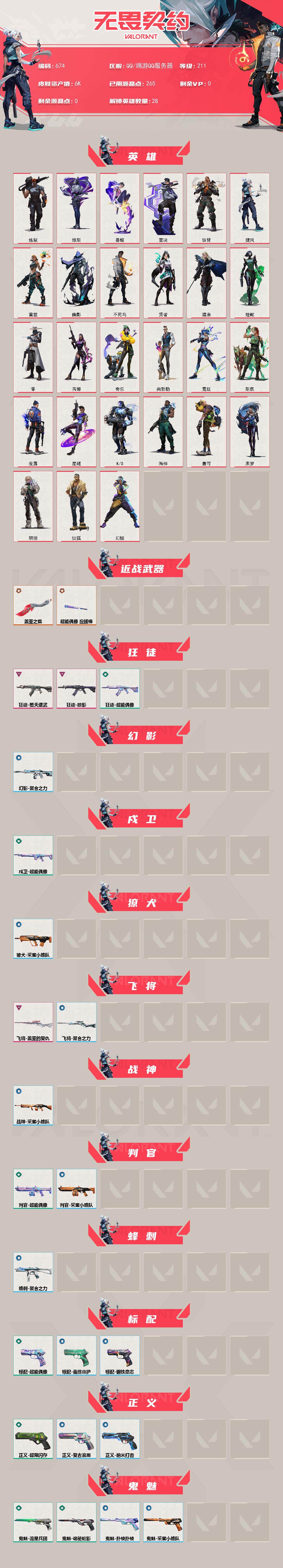 [14558962]【英雄】:幻棱,炼狱,维斯,暮蝶,钛狐,壹决,铁臂,捷风,雷兹,幽影,不死鸟,贤者,猎枭,蝰蛇,零,芮娜,奇乐,尚勃勒,霓虹,斯凯,夜露,星礈,k/o,海神,盖可,黑梦,钢锁 【近战 武器】:近战武器-超能偶像 应援棒,近战武器-盖亚之愠 【狂徒】:狂徒-堕天遗武,狂徒-掠影,狂徒-超能偶像 【幻影】:幻影-聚合之力 【戍卫】:戍卫-超能偶像 【獠犬】:獠犬-采蜜小蜂队 【飞将】:飞将-盖亚的复仇,飞将-聚合之力 【战神】:战神-采蜜小蜂队 【判官】:判官-超能偶像,判官-采蜜小蜂队 【蜂刺】:蜂刺-聚合之力 【标配】:标配-超能偶像,标配-钢铁意志,标配-最终庇护 【正义】:正义-超限闪存,正义-复古浪潮,正义-纳米打击 【鬼魅】:鬼魅-流星兵团,鬼魅-诡秘蛇影,鬼魅-采蜜小蜂队,鬼魅-扑棱扑棱 【狂怒】:狂怒-聚合之力 【短炮】:短炮-梦魇恶魔,短炮-蛇吻 【卡面】:终章:激斗汉堡 卡面,进入射程 卡面,《双城之战》拥抱 卡面,精灵大战 卡面,欢迎来到底城 卡面,南瓜盛典 卡面,无畏契约:暮蝶 卡面,修车达人 卡面,正义的化身 卡面,至黑之夜 卡面,终章:生意人麦宝 卡面,铁之华 卡面,失而复得 卡面,时间到 卡面,最高舞台 卡面,复活专家 卡面,归乡 // 蝰蛇 卡面,超能偶像 卡面,生意人麦宝 卡面,声感陷阱设计图 卡面,钢锁工牌 卡面,战术小伙伴的夏日 卡面,采蜜小蜂队 卡面,聚合之力 卡面,梦幻奶茶 卡面,终章:打造专属狂徒 卡面,趁热吃 卡面,源能反应 卡面,零点嗅探设计图 卡面,终章:瓦娃脸雪糕 卡面,无畏契约:蝰蛇 卡面,表象之下 卡面,虹吸式咖啡壶 卡面,沙雕爆能器 卡面,清除名单 卡面,无畏契约go!第一卷:零 卡面,暗呛 卡面,代号红色 卡面,新兵报到 卡面,v契约 卡面,无畏契约 卡面,暗潮 卡面 【喷漆】:嗨宝南瓜灯 喷漆,嘭! 喷漆,都算到了 喷漆,控场勿近 喷漆,伤心心 喷漆,小丑猫 喷漆,熊抱 喷漆,又被闪了 喷漆,终极羞辱 喷漆,超级粉丝 喷漆,黯兽卖萌 喷漆,捷风差距 喷漆,惊声尖叫 喷漆,五人成星 喷漆,超能偶像 喷漆,放我出去 喷漆,掩护我 喷漆,大佬发呛 喷漆,边缘试探 喷漆,拼一呛 喷漆,聚合之力 喷漆,采蜜小蜂队 喷漆,梦幻小队 喷漆,五个全都齐了 喷漆,我觉得不行 喷漆,蝰蛇 喷漆,我的刀呢? 喷漆,致命毒素 喷漆