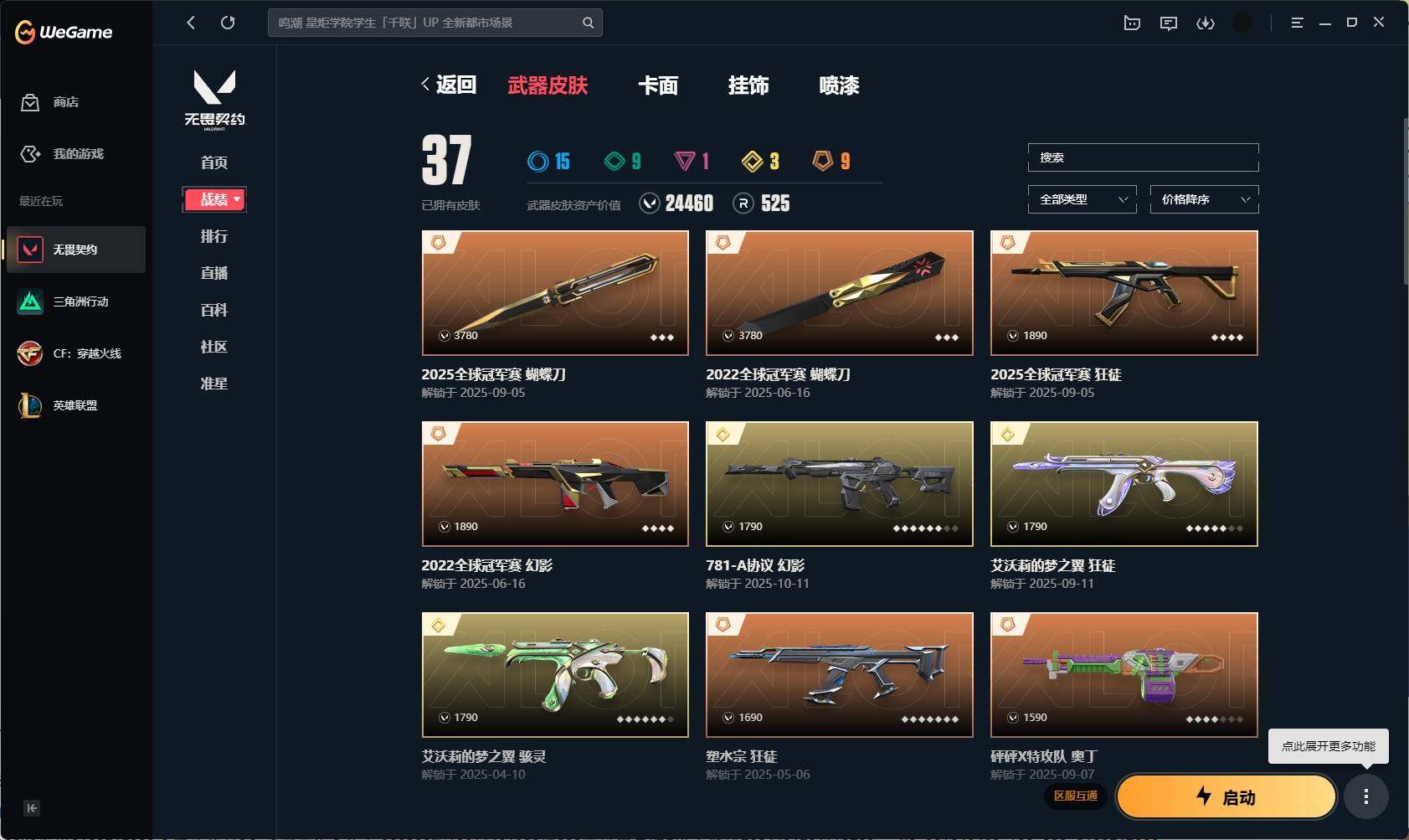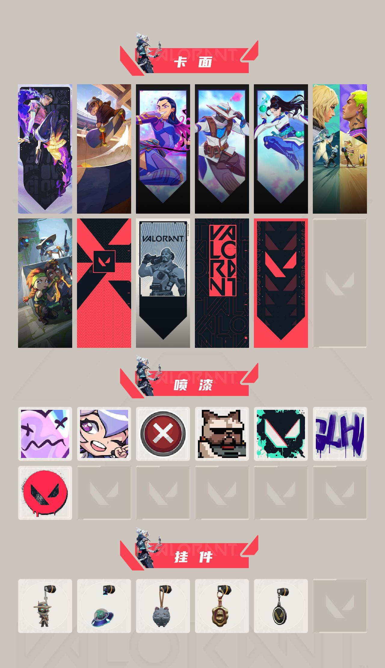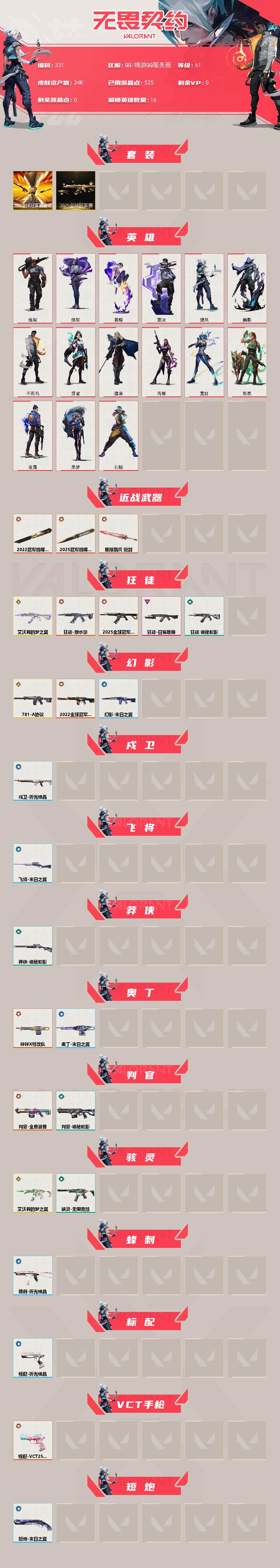 【331】【套装】:2025全球冠军赛套装,2022全球冠军赛套装 【英雄】:幻棱,炼狱,维斯,暮蝶,壹决,捷风,幽影,不死鸟,贤者,猎枭,芮娜,霓虹,斯凯,夜露,黑梦 【近战 武器】:近战武器-2025全球冠军赛 蝴蝶刀,近战武器-2022全球冠军赛 蝴蝶刀,近战武器-星际猎兵 短剑 【狂徒】:狂徒-艾沃莉的梦之翼,狂徒-2025全球冠军赛,狂徒-塑水宗,狂徒-日冕雄师,狂徒-诡秘蛇影 【幻影】:幻影-781-a协议,幻影-2022全球冠军赛,幻影-末日之翼 【戍卫】:戍卫-折光棱晶 【飞将】:飞将-末日之翼 【莽侠】:莽侠-诡秘蛇影 【奥丁】:奥丁-砰砰x特攻队,奥丁-末日之翼 【判官】:判官-全息波普,判官-诡秘蛇影 【骇灵】:骇灵-艾沃莉的梦之翼,骇灵-无限竞技 【蜂刺】:蜂刺-折光棱晶 【标配】:标配-折光棱晶 【vct手呛】:标配-vct25 x blg 【短炮】:短炮-末日之翼 【卡面】:无畏契约:暮蝶 卡面,clutch 卡面,无畏契约go!第一卷:芮娜 卡面,无畏契约go!第一卷:零 卡面,无畏契约go!第一卷:贤者 卡面,钢锁vs盖可 卡面,别冒尖 卡面,代号红色 卡面,新兵报到 卡面,v契约 卡面,无畏契约 卡面 【喷漆】:伤心心 喷漆,超能偶像 喷漆,买装还是存钱 喷漆,关门放狗 喷漆,胜利属于无畏契约 喷漆,glhf 喷漆,无畏契约 喷漆 【挂饰】:无畏契约go!第一卷 零 挂饰,天外飞客 挂饰,《双城之战》魄罗 挂饰,海豹的认可 挂饰,无畏契约 纪念币 挂饰