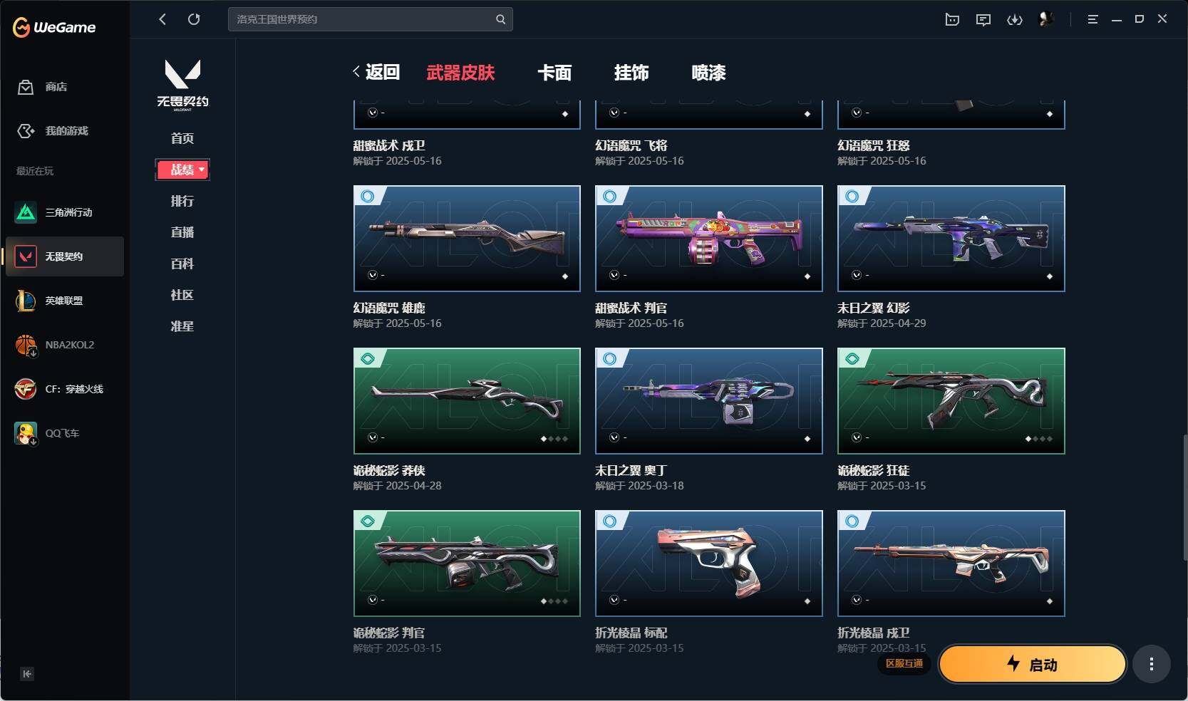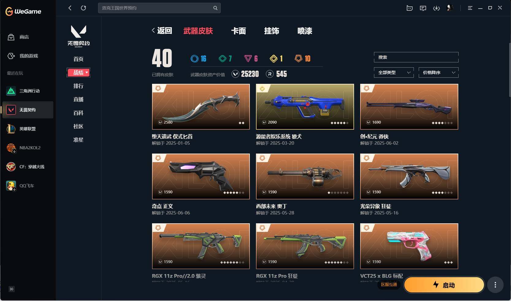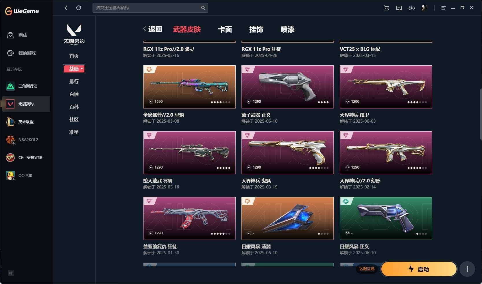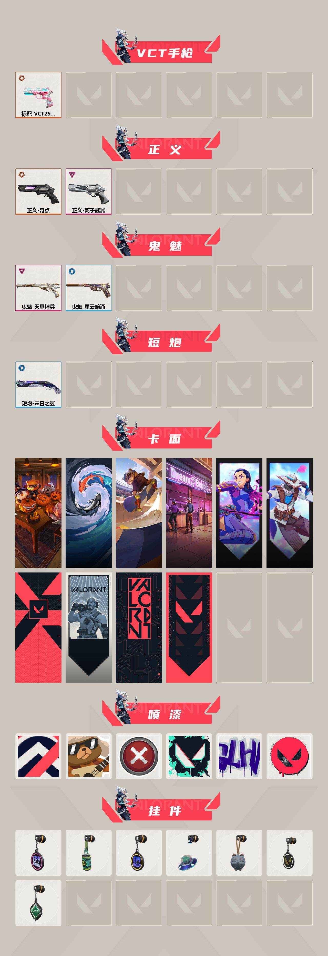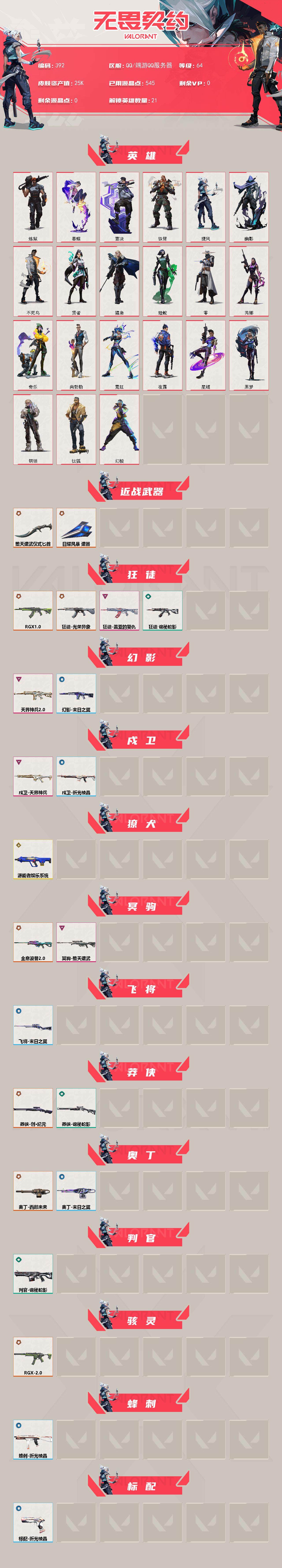 【392】【英雄】:幻棱,炼狱,暮蝶,钛狐,壹决,铁臂,捷风,幽影,不死鸟,贤者,猎枭,蝰蛇,零,芮娜,奇乐,尚勃勒,霓虹,夜露,星礈,黑梦,钢锁 【近战 武器】:近战武器-堕天遗武 仪式匕首,近战武器-日耀风暴 遗器 【狂徒】:狂徒-rgx 11z pro,狂徒-光荣异象,狂徒-盖亚的复仇,狂徒-诡秘蛇影 【幻影】:幻影-天界神兵//2.0,幻影-末日之翼 【戍卫】:戍卫-天界神兵,戍卫-折光棱晶 【獠犬】:獠犬-源能者娱乐系统 【冥驹】:冥驹-全息波普//2.0,冥驹-堕天遗武 【飞将】:飞将-末日之翼 【莽侠】:莽侠-创·纪元,莽侠-诡秘蛇影 【奥丁】:奥丁-西部未来,奥丁-末日之翼 【判官】:判官-诡秘蛇影 【骇灵】:骇灵-rgx 11z pro//2.0 【蜂刺】:蜂刺-折光棱晶 【标配】:标配-折光棱晶 【vct手呛】:标配-vct25 x blg 【正义】:正义-奇点,正义-离子武器 【鬼魅】:鬼魅-天界神兵,鬼魅-星云暗涌 【短炮】:短炮-末日之翼 【卡面】:南瓜盛典 卡面,红鳞松叶 卡面,clutch 卡面,梦幻奶茶 卡面,无畏契约go!第一卷:芮娜 卡面,无畏契约go!第一卷:零 卡面,代号红色 卡面,新兵报到 卡面,v契约 卡面,无畏契约 卡面 【喷漆】:控场勿近 喷漆,战术熊的巴拉莱卡琴 喷漆,买装还是存钱 喷漆,胜利属于无畏契约 喷漆,glhf 喷漆,无畏契约 喷漆 【挂饰】:v25第三幕:超凡 挂饰,第九季//第三幕 纪念币 挂饰,z世代特饮 挂饰,第九季//第一幕 纪念币 挂饰,天外飞客 挂饰,《双城之战》魄罗 挂饰,无畏契约 纪念币 挂饰