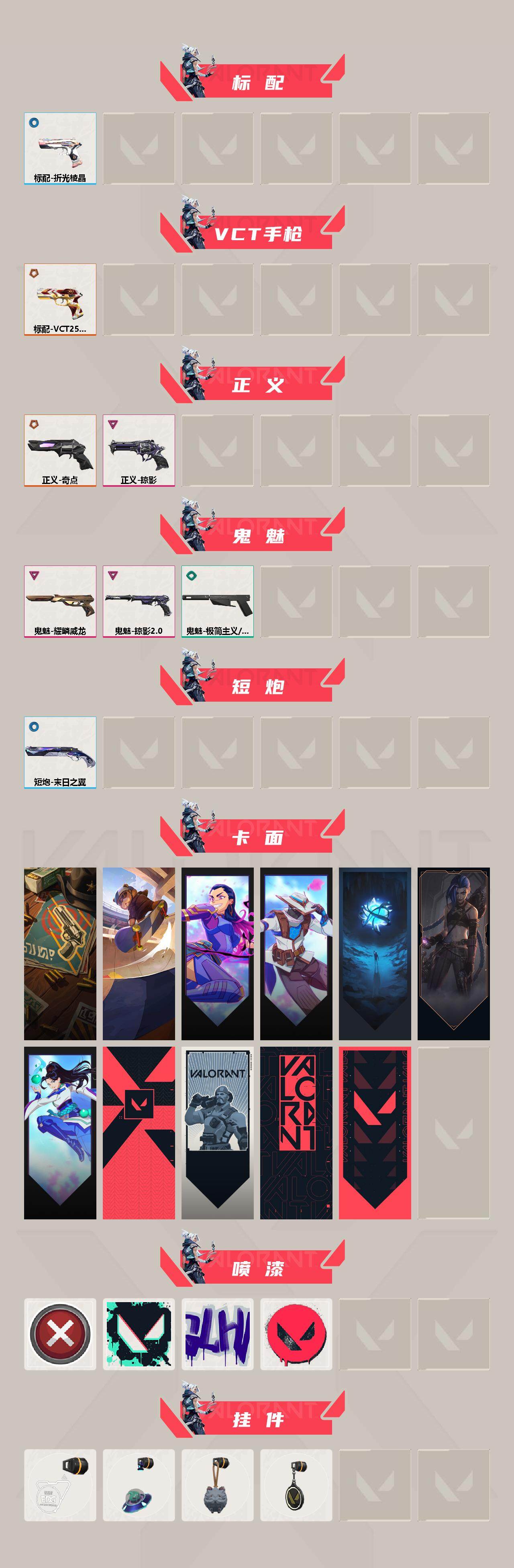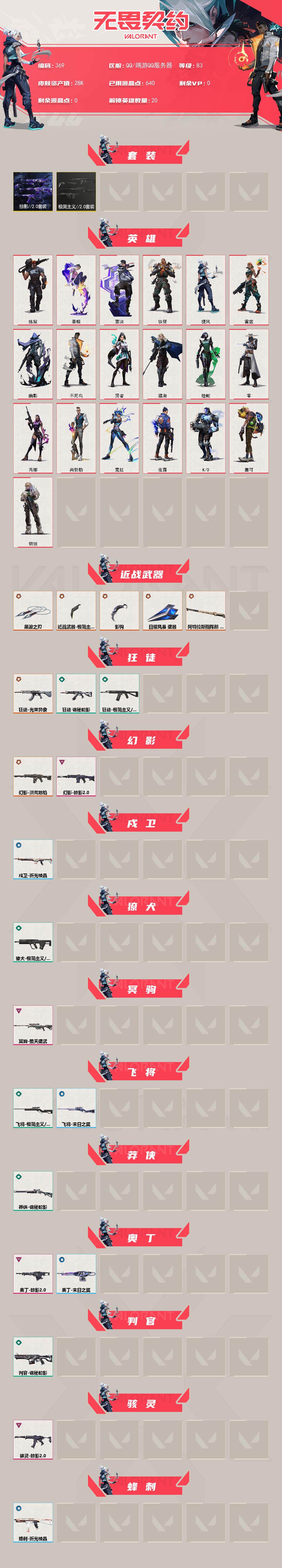 【369】【套装】:掠影//2.0套装,极简主义//2.0套装 【英雄】:炼狱,暮蝶,壹决,铁臂,捷风,雷兹,幽影,不死鸟,贤者,猎枭,蝰蛇,零,芮娜,尚勃勒,霓虹,夜露,k/o,盖可,钢锁 【近战 武器】:近战武器-影钩,近战武器-黑波之刃,近战武器-极简主义//2.0 爪刀,近战武器-日耀风暴 遗器,近战武器-阿特拉斯指挥部 甩棍 【狂徒】:狂徒-光荣异象,狂徒-诡秘蛇影,狂徒-极简主义//2.0 【幻影】:幻影-洪荒怒焰,幻影-掠影//2.0 【戍卫】:戍卫-折光棱晶 【獠犬】:獠犬-极简主义//2.0 【冥驹】:冥驹-堕天遗武 【飞将】:飞将-极简主义//2.0,飞将-末日之翼 【莽侠】:莽侠-诡秘蛇影 【奥丁】:奥丁-掠影//2.0,奥丁-末日之翼 【判官】:判官-诡秘蛇影 【骇灵】:骇灵-掠影//2.0 【蜂刺】:蜂刺-折光棱晶 【标配】:标配-折光棱晶 【vct手呛】:标配-vct25 x edg 【正义】:正义-奇点,正义-掠影 【鬼魅】:鬼魅-耀鳞威龙,鬼魅-掠影//2.0,鬼魅-极简主义//2.0 【短炮】:短炮-末日之翼 【卡面】:正义的化身 卡面,clutch 卡面,无畏契约go!第一卷:芮娜 卡面,无畏契约go!第一卷:零 卡面,无垠星环 卡面,《双城之战》金克丝 卡面,无畏契约go!第一卷:贤者 卡面,代号红色 卡面,新兵报到 卡面,v契约 卡面,无畏契约 卡面 【喷漆】:买装还是存钱 喷漆,胜利属于无畏契约 喷漆,glhf 喷漆,无畏契约 喷漆 【挂饰】:vct x edg 挂饰,天外飞客 挂饰,《双城之战》魄罗 挂饰,无畏契约 纪念币 挂饰