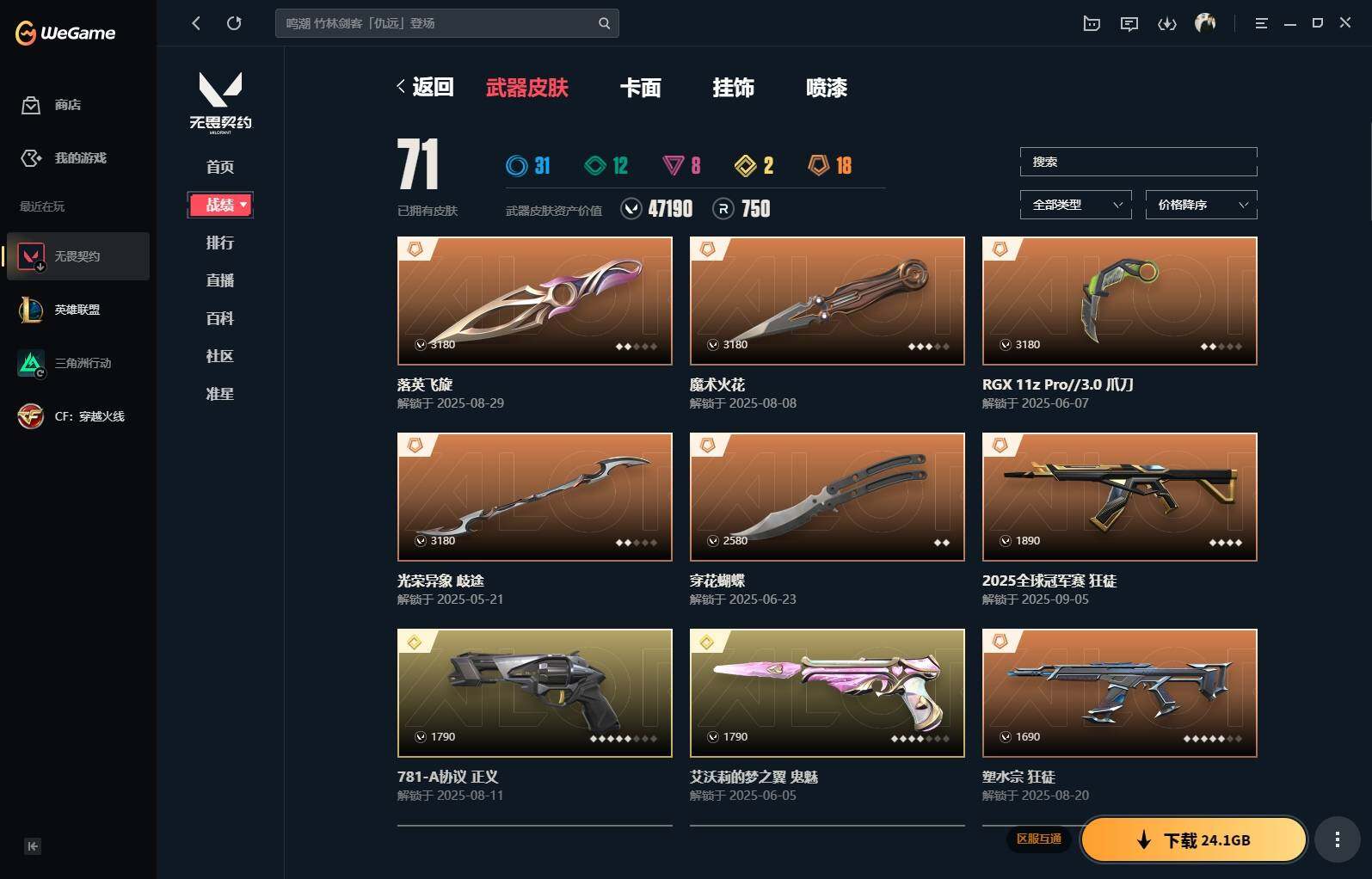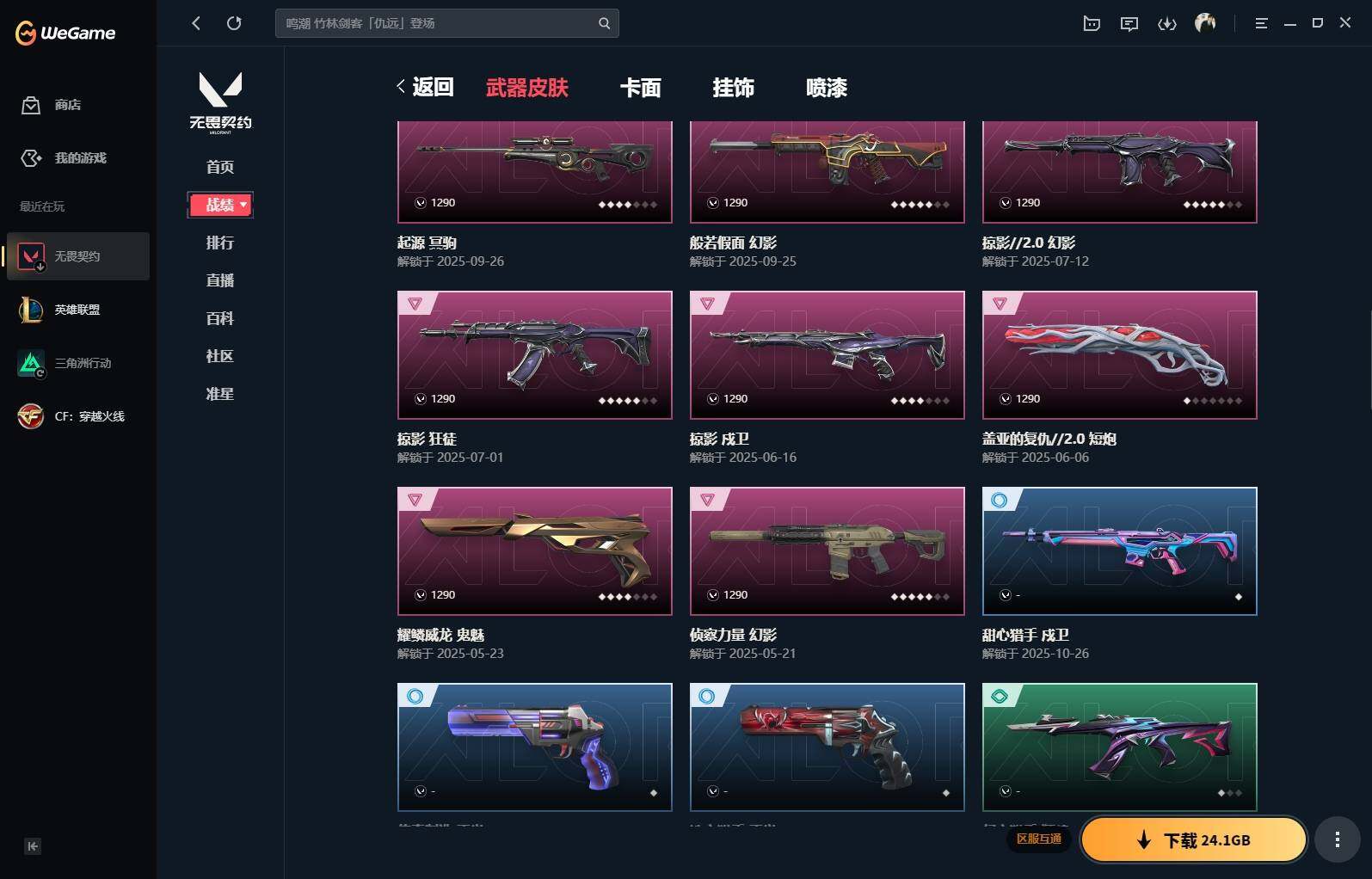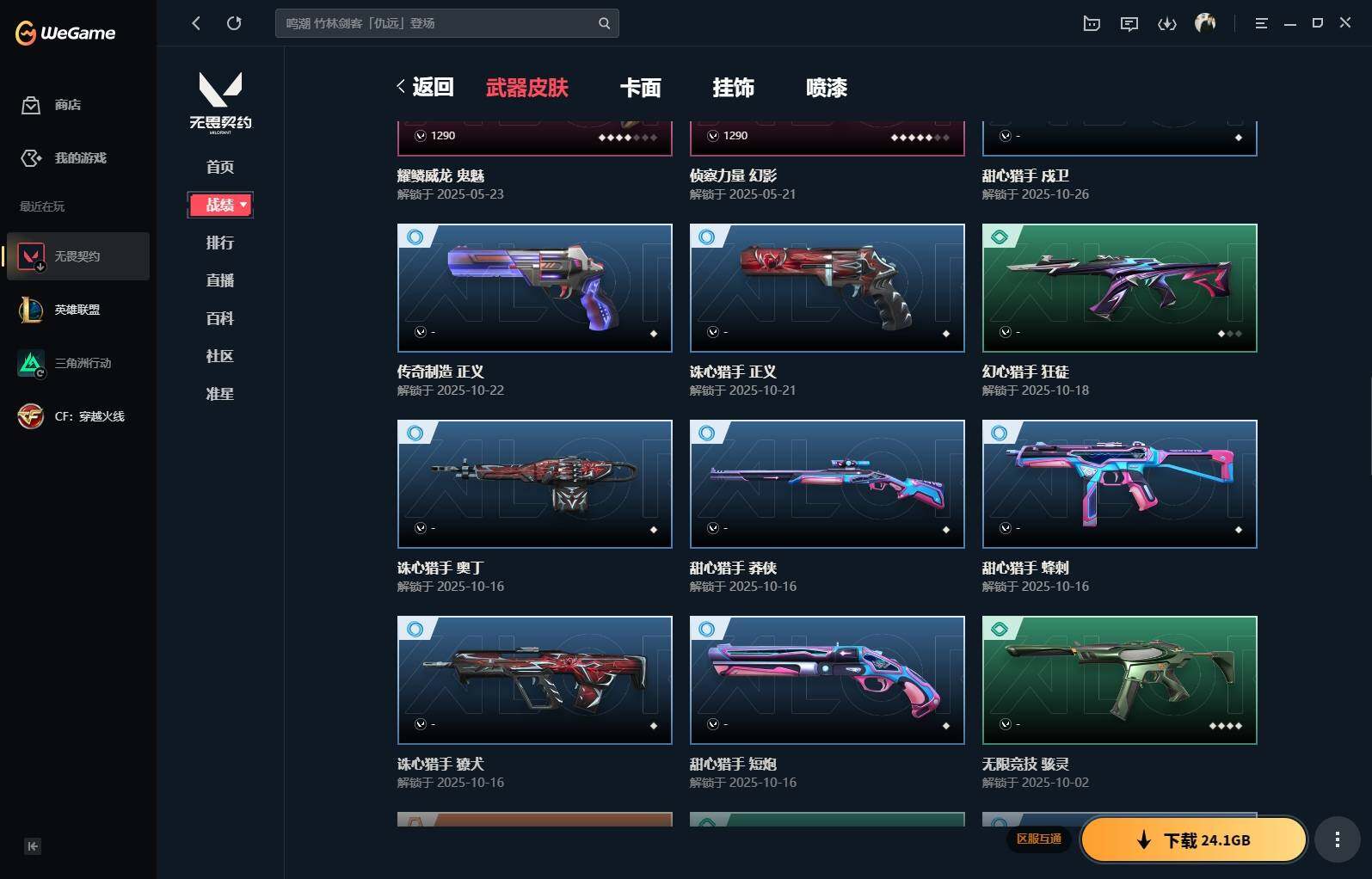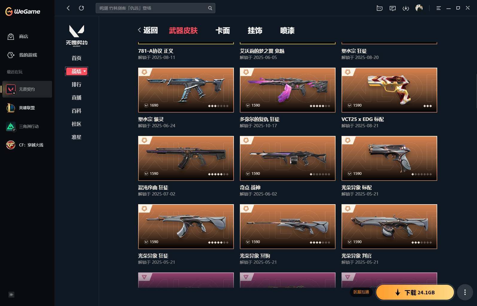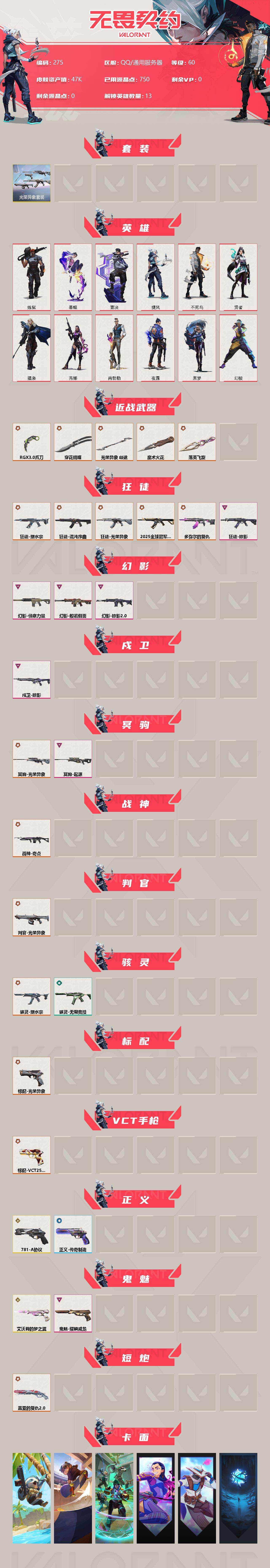 【275】【套装】:光荣异象套装 【英雄】:幻棱,炼狱,暮蝶,壹决,捷风,不死鸟,贤者,猎枭,芮娜,尚勃勒,夜露,黑梦 【近战 武器】:近战武器-魔术火花,近战武器-光荣异象 歧途,近战武器-穿花蝴蝶,近战武器-rgx 11z pro//3.0 爪刀,近战武器-落英飞旋,近战武器-魔术火花 【狂徒】:狂徒-2025全球冠军赛,狂徒-混沌序曲,狂徒-塑水宗,狂徒-光荣异象,狂徒-多弥尔的复仇,狂徒-掠影 【幻影】:幻影-般若假面,幻影-侦察力量,幻影-掠影//2.0 【戍卫】:戍卫-掠影 【冥驹】:冥驹-光荣异象,冥驹-起源 【战神】:战神-奇点 【判官】:判官-光荣异象 【骇灵】:骇灵-塑水宗,骇灵-无限竞技 【标配】:标配-光荣异象 【vct手呛】:标配-vct25 x edg 【正义】:正义-781-a协议,正义-传奇制造 【鬼魅】:鬼魅-艾沃莉的梦之翼,鬼魅-耀鳞威龙 【短炮】:短炮-盖亚的复仇//2.0 【卡面】:树懒大作战 卡面,clutch 卡面,哨卫者之领域 卡面,无畏契约go!第一卷:芮娜 卡面,无畏契约go!第一卷:零 卡面,无垠星环 卡面,《双城之战》金克丝 卡面,代号红色 卡面,新兵报到 卡面,v契约 卡面,无畏契约 卡面 【喷漆】:买装还是存钱 喷漆,暴走萝莉 喷漆,放下武器 喷漆,胜利属于无畏契约 喷漆,glhf 喷漆,无畏契约 喷漆 【挂饰】:鱼骨头 挂饰,薰衣草之心 挂饰,动力机箱 挂饰,vct x edg 挂饰,天外飞客 挂饰,无畏契约 纪念币 挂饰