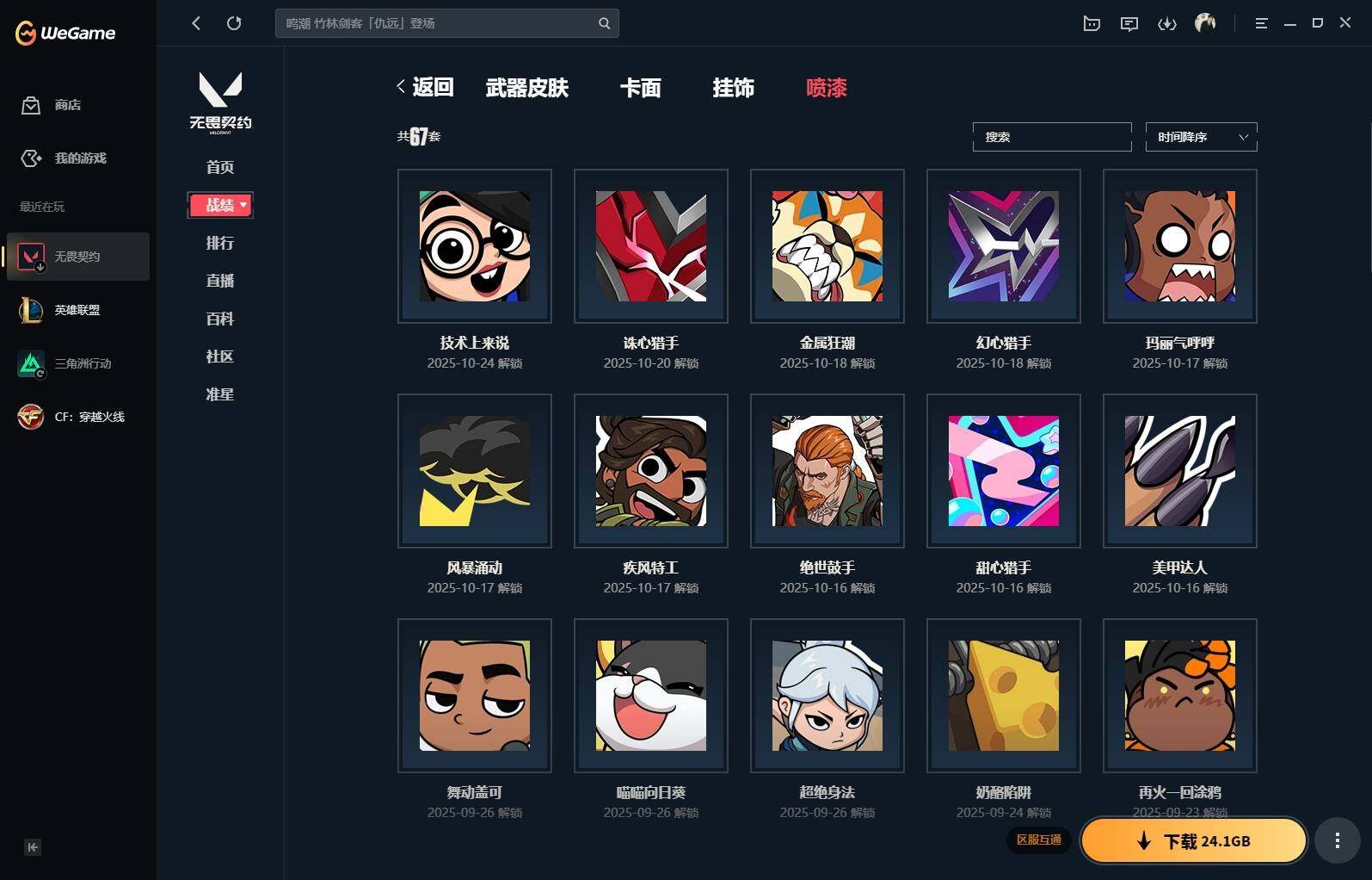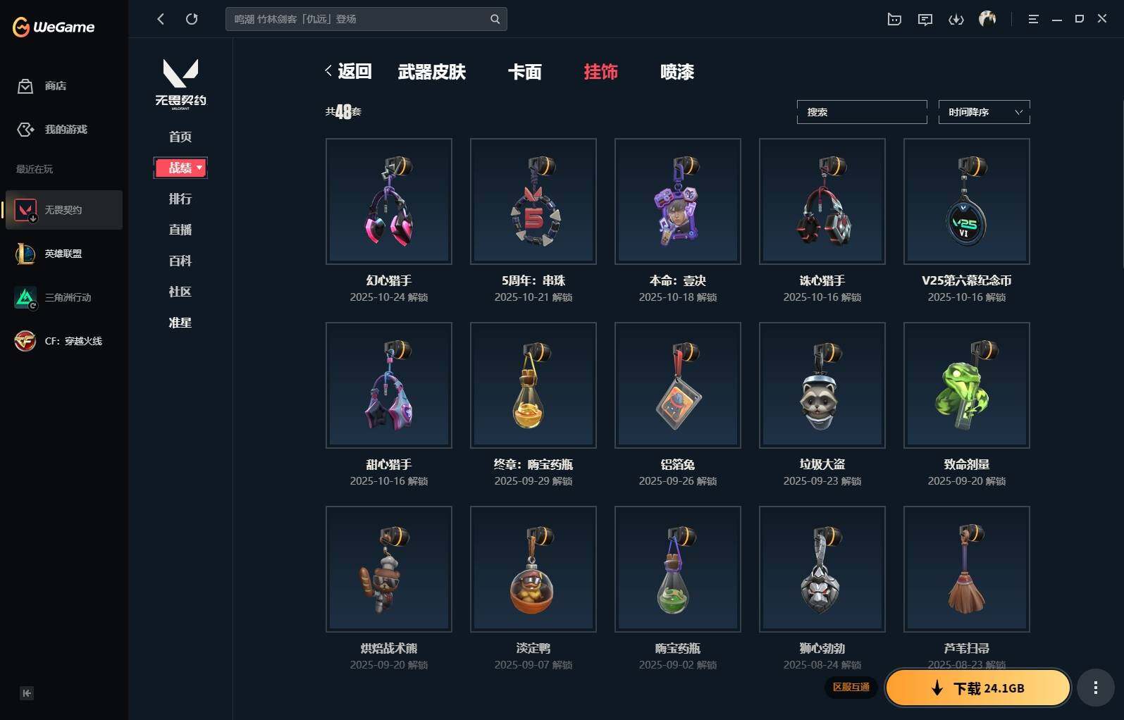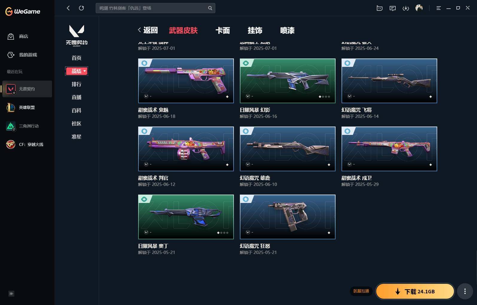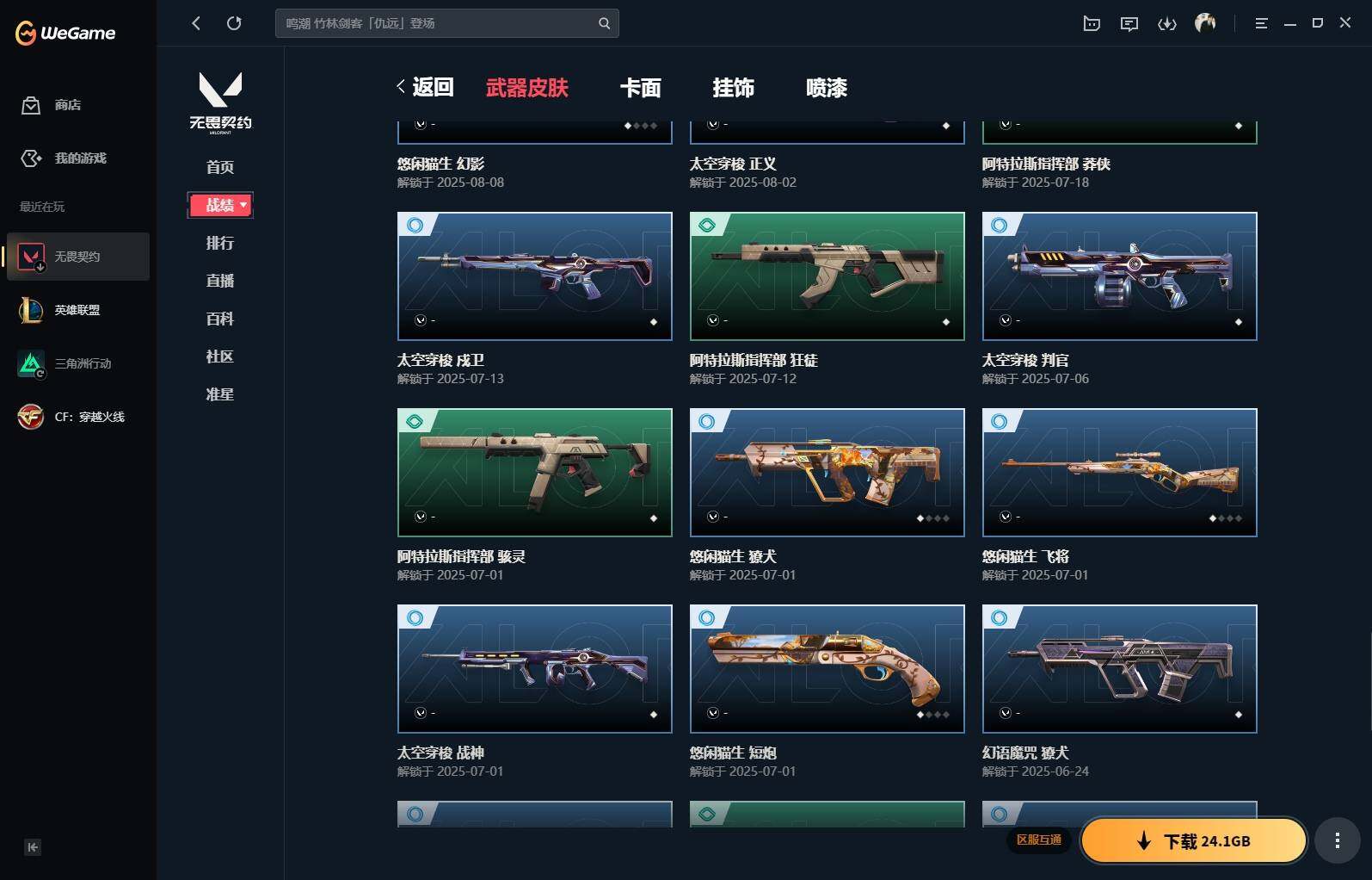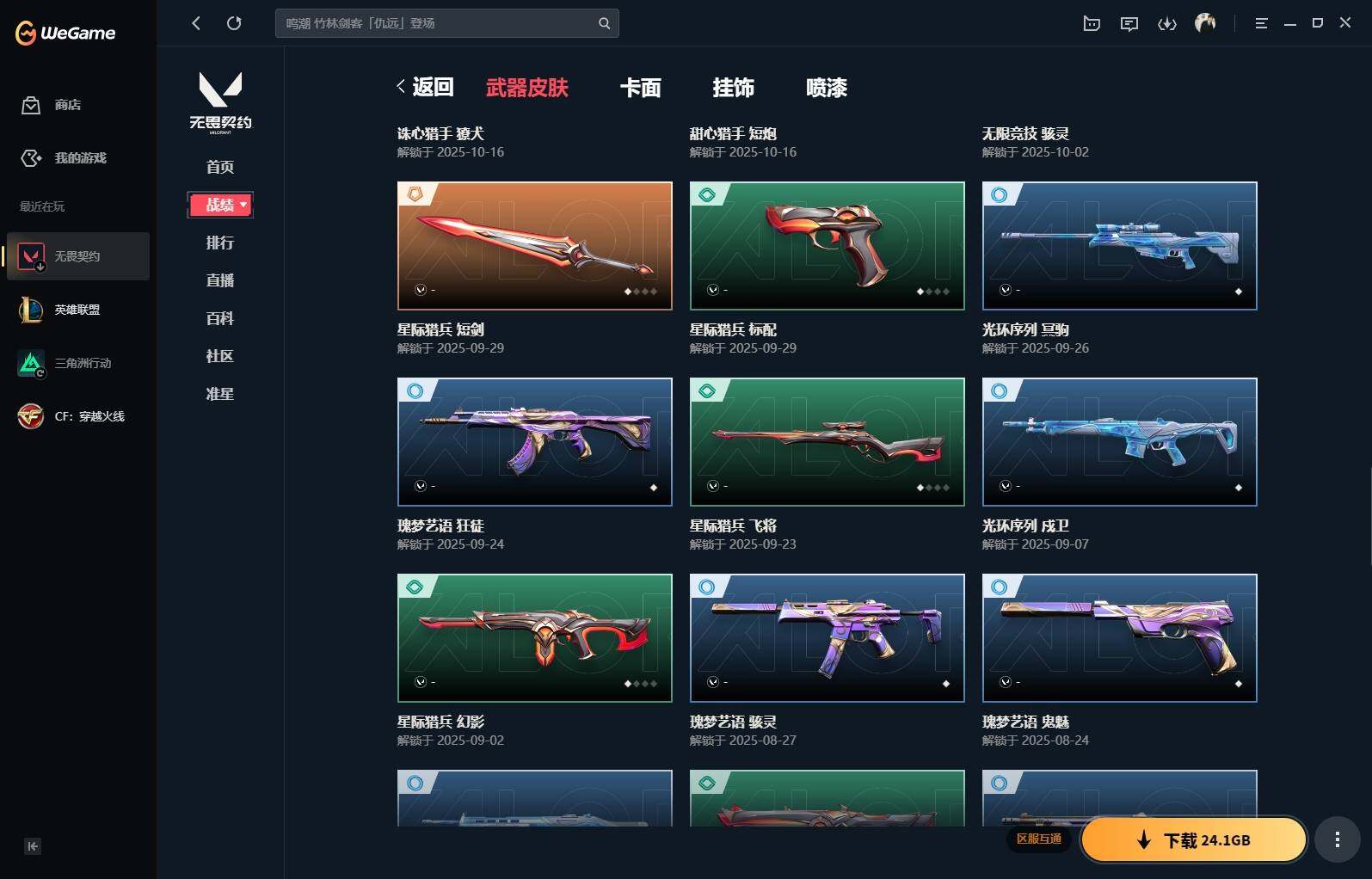 【275】【套装】:光荣异象套装 【英雄】:幻棱,炼狱,暮蝶,壹决,捷风,不死鸟,贤者,猎枭,芮娜,尚勃勒,夜露,黑梦 【近战 武器】:近战武器-魔术火花,近战武器-光荣异象 歧途,近战武器-穿花蝴蝶,近战武器-rgx 11z pro//3.0 爪刀,近战武器-落英飞旋,近战武器-魔术火花 【狂徒】:狂徒-2025全球冠军赛,狂徒-混沌序曲,狂徒-塑水宗,狂徒-光荣异象,狂徒-多弥尔的复仇,狂徒-掠影 【幻影】:幻影-般若假面,幻影-侦察力量,幻影-掠影//2.0 【戍卫】:戍卫-掠影 【冥驹】:冥驹-光荣异象,冥驹-起源 【战神】:战神-奇点 【判官】:判官-光荣异象 【骇灵】:骇灵-塑水宗,骇灵-无限竞技 【标配】:标配-光荣异象 【vct手呛】:标配-vct25 x edg 【正义】:正义-781-a协议,正义-传奇制造 【鬼魅】:鬼魅-艾沃莉的梦之翼,鬼魅-耀鳞威龙 【短炮】:短炮-盖亚的复仇//2.0 【卡面】:树懒大作战 卡面,clutch 卡面,哨卫者之领域 卡面,无畏契约go!第一卷:芮娜 卡面,无畏契约go!第一卷:零 卡面,无垠星环 卡面,《双城之战》金克丝 卡面,代号红色 卡面,新兵报到 卡面,v契约 卡面,无畏契约 卡面 【喷漆】:买装还是存钱 喷漆,暴走萝莉 喷漆,放下武器 喷漆,胜利属于无畏契约 喷漆,glhf 喷漆,无畏契约 喷漆 【挂饰】:鱼骨头 挂饰,薰衣草之心 挂饰,动力机箱 挂饰,vct x edg 挂饰,天外飞客 挂饰,无畏契约 纪念币 挂饰