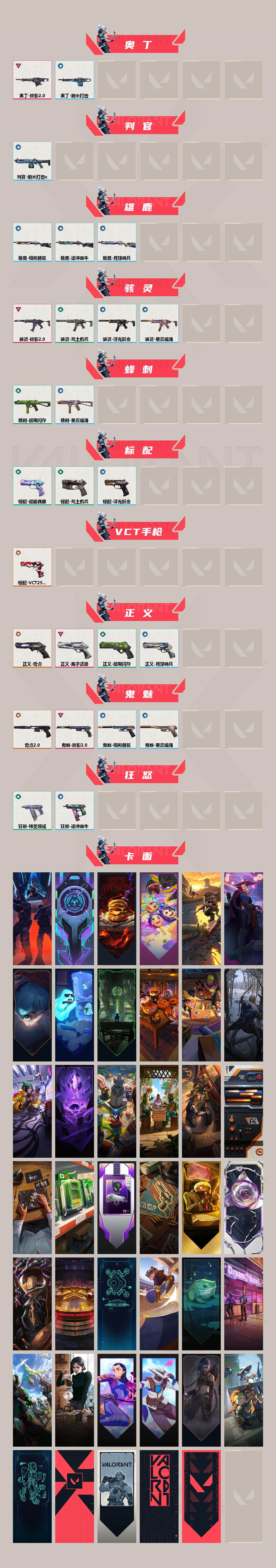 【500】【套装】:奇点//2.0套装,掠影//2.0套装 【英雄】:幻棱,炼狱,维斯,暮蝶,钛狐,壹决,铁臂,捷风,雷兹,幽影,不死鸟,贤者,猎枭,蝰蛇,零,芮娜,奇乐,尚勃勒,霓虹,斯凯,夜露,星礈,k/o,海神,盖可,黑梦,钢锁 【近战 武器】:近战武器-影钩,近战武器-奇点//2.0 蝴蝶刀,近战武器-超限闪存 匕首,近战武器-天玄刀,近战武器-神圣领域 战刀,近战武器-日耀风暴 遗器,近战武器-阿特拉斯指挥部 甩棍 【狂徒】:狂徒-艾沃莉的梦之翼,狂徒-归零者,狂徒-混沌序曲,狂徒-奇点//2.0,狂徒-偃月苍龙,狂徒-堕天遗武,狂徒-盖亚的复仇,狂徒-紫阙金琅 【幻影】:幻影-归零者//2.0,幻影-rgx 11z pro//2.0,幻影-盖亚的复仇//2.0,幻影-掠影//2.0,幻影-超限闪存,幻影-神圣领域,幻影-琉璃幻梦 【戍卫】:戍卫-盖亚的复仇,戍卫-浮光跃金,戍卫-月球哨兵 【獠犬】:獠犬-神圣领域,獠犬-模拟赫兹,獠犬-逆冲蛮牛 【冥驹】:冥驹-光荣异象,冥驹-荒土机兵,冥驹-模拟赫兹,冥驹-星云暗涌 【莽侠】:莽侠-超限闪存,莽侠-月球哨兵 【战神】:战神-神圣领域,战神-浮光跃金 【奥丁】:奥丁-掠影//2.0,奥丁-纳米打击 【判官】:判官-纳米打击x 【雄鹿】:雄鹿-模拟赫兹,雄鹿-逆冲蛮牛,雄鹿-月球哨兵 【骇灵】:骇灵-掠影//2.0,骇灵-荒土机兵,骇灵-浮光跃金,骇灵-星云暗涌 【蜂刺】:蜂刺-超限闪存,蜂刺-星云暗涌 【标配】:标配-超能偶像,标配-荒土机兵,标配-浮光跃金 【vct手呛】:标配-vct25 x t1 【正义】:正义-奇点,正义-离子武器,正义-超限闪存,正义-月球哨兵 【鬼魅】:鬼魅-奇点//2.0,鬼魅-掠影//2.0,鬼魅-模拟赫兹,鬼魅-星云暗涌 【狂怒】:狂怒-神圣领域,狂怒-逆冲蛮牛 【卡面】:纳米打击 卡面,抑制技术 卡面,激斗汉堡 卡面,瓦娃脸雪糕 p2 卡面,荒土机兵 卡面,银弹猎手 卡面,《双城之战》拥抱 卡面,精灵大战 卡面,欢迎来到底城 卡面,南瓜盛典 卡面,唱片的故事 卡面,钢弓与箭弦 卡面,排除故障 卡面,奇点//2.0 卡面,战术桌游 卡面,悠享食光 卡面,修车达人 卡面,模拟赫兹 卡面,浮光跃金 卡面,超限闪存 卡面,维斯工牌 卡面,正义的化身 卡面,终章:生意人麦宝 卡面,铁之华 卡面,时间到 卡面,最高舞台 卡面,声感陷阱设计图 卡面,clutch 卡面,霓帧牛蛙 卡面,梦幻奶茶 卡面,流星兵团 卡面,虹吸式咖啡壶 卡面,无畏契约go!第一卷:芮娜 卡面,无畏契约go!第一卷:零 卡面,《双城之战》金克丝 卡面,别冒尖 卡面,铁臂设计图 卡面,代号红色 卡面,新兵报到 卡面,v契约 卡面,无畏契约 卡面 【喷漆】:请求重启 喷漆,纳米打击 喷漆,简笔画黯兽 喷漆,独守蝰腹 喷漆,他们将落荒而逃 喷漆,通缉:战术企鹅 喷漆,荒土机兵 喷漆,别挡我吃球! 喷漆,嘭! 喷漆,都算到了 喷漆,控场勿近 喷漆,皮蛋呼呼 喷漆,像素星礈 喷漆,图谋不轨的零 喷漆,小丑猫 喷漆,模拟赫兹 喷漆,高丽风情小熊 喷漆,奇点//2.0 喷漆,蹲到一个 喷漆,全力集中 喷漆,超限闪存 喷漆,rua一下 喷漆,熊抱 喷漆,高丽风情小虎 喷漆,记在小本本 喷漆,防弹企鹅 喷漆,高丽风情小蛙 喷漆,超级粉丝 喷漆,捷风差距 喷漆,惊声尖叫 喷漆,拼一呛 喷漆,吸一口快乐 喷漆,买装还是存钱 喷漆,关门放狗 喷漆,无畏契约go!第一卷:零 喷漆,无畏契约go!第一卷:贤者 喷漆,胜利属于无畏契约 喷漆,glhf 喷漆,无畏契约 喷漆 【挂饰】:猫猫木乃伊 挂饰,水壶 挂饰,纳米打击 挂饰,伞绳 挂饰,《双城之战》小蛋糕 挂饰,第九季//第三幕 纪念币 挂饰,拳击战术熊 挂饰,工具腰带 挂饰,无畏契约go!第一卷 芮娜 挂饰,无畏契约go!第一卷 零 挂饰,暗藏猫腻 挂饰,高丽风情 挂饰,奇点//2.0 挂饰,熔岩灯 挂饰,超限闪存 挂饰,迷你k/o 挂饰,模拟赫兹 挂饰,第九季//第二幕 纪念币 挂饰,薰衣草之心 挂饰,终章:这瓜保熟 挂饰,糖葫芦 挂饰,袖珍捷风 挂饰,迷你浓缩 挂饰,第九季//第一幕 纪念币 挂饰,天外飞客 挂饰,《双城之战》魄罗 挂饰,无畏契约 纪念币 挂饰