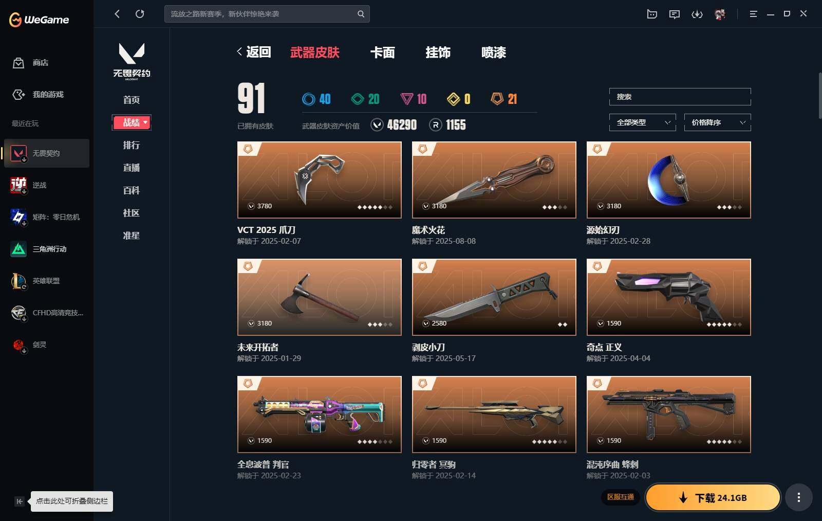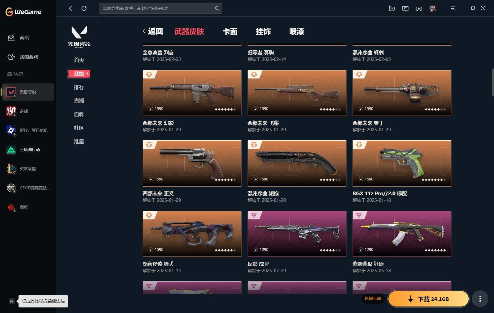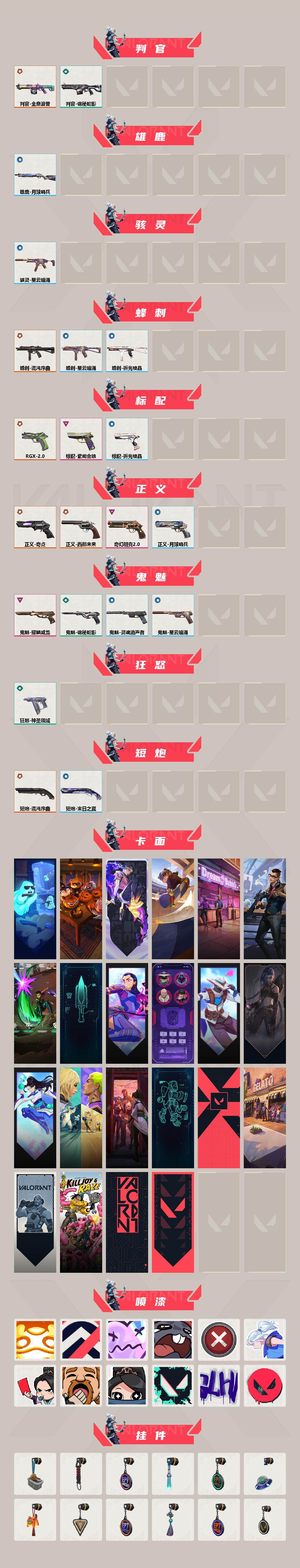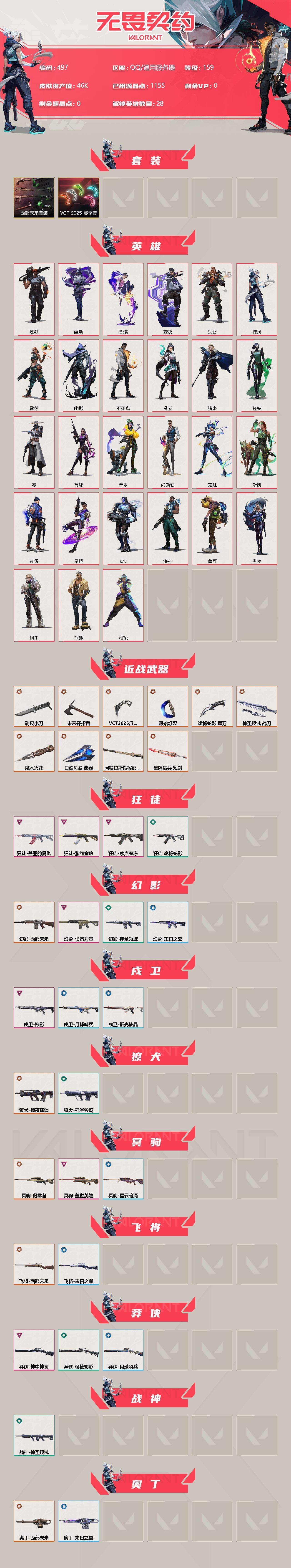 【497】【套装】:vct 2025 赛季套装,西部未来套装 【英雄】:幻棱,炼狱,维斯,暮蝶,钛狐,壹决,铁臂,捷风,雷兹,幽影,不死鸟,贤者,猎枭,蝰蛇,零,芮娜,奇乐,尚勃勒,霓虹,斯凯,夜露,星礈,k/o,海神,盖可,黑梦,钢锁 【近战 武器】:近战武器-魔术火花,近战武器-剥皮小刀,近战武器-vct 2025 爪刀,近战武器-源始幻刃,近战武器-未来开拓者,近战武器-诡秘蛇影 军刀,近战武器-神圣领域 战刀,近战武器-日耀风暴 遗器,近战武器-阿特拉斯指挥部 甩棍,近战武器-星际猎兵 短剑,近战武器-魔术火花 【狂徒】:狂徒-冰点凝冻,狂徒-盖亚的复仇,狂徒-紫阙金琅,狂徒-诡秘蛇影 【幻影】:幻影-西部未来,幻影-侦察力量,幻影-神圣领域,幻影-末日之翼,幻影-西部未来 【戍卫】:戍卫-掠影,戍卫-月球哨兵,戍卫-折光棱晶 【獠犬】:獠犬-黯夜怪谈,獠犬-神圣领域 【冥驹】:冥驹-归零者,冥驹-盖世英雄,冥驹-星云暗涌 【飞将】:飞将-西部未来,飞将-末日之翼 【莽侠】:莽侠-神中神罚,莽侠-诡秘蛇影,莽侠-月球哨兵 【战神】:战神-神圣领域 【奥丁】:奥丁-西部未来,奥丁-末日之翼 【判官】:判官-全息波普,判官-诡秘蛇影 【雄鹿】:雄鹿-月球哨兵 【骇灵】:骇灵-星云暗涌 【蜂刺】:蜂刺-混沌序曲,蜂刺-星云暗涌,蜂刺-折光棱晶 【标配】:标配-rgx 11z pro//2.0,标配-紫阙金琅,标配-折光棱晶 【正义】:正义-奇点,正义-西部未来,正义-奇幻朋克//2.0,正义-月球哨兵 【鬼魅】:鬼魅-耀鳞威龙,鬼魅-诡秘蛇影,鬼魅-灵魂消声者,鬼魅-星云暗涌 【狂怒】:狂怒-神圣领域 【短炮】:短炮-混沌序曲,短炮-末日之翼 【卡面】:精灵大战 卡面,南瓜盛典 卡面,无畏契约:暮蝶 卡面,clutch 卡面,梦幻奶茶 卡面,西装暴徒 卡面,源能反应 卡面,零点嗅探设计图 卡面,无畏契约go!第一卷:芮娜 卡面,清除名单 卡面,无畏契约go!第一卷:零 卡面,《双城之战》金克丝 卡面,无畏契约go!第一卷:贤者 卡面,钢锁vs盖可 卡面,热烈欢迎 卡面,铁臂设计图 卡面,代号红色 卡面,冰淇淋店 卡面,新兵报到 卡面,友军火力 卡面,v契约 卡面,无畏契约 卡面 【喷漆】:嗨宝南瓜灯 喷漆,控场勿近 喷漆,伤心心 喷漆,我的刀呢? 喷漆,买装还是存钱 喷漆,无畏契约go!第一卷:捷风 喷漆,红牌退场 喷漆,老铁困了 喷漆,口袋贤者 喷漆,胜利属于无畏契约 喷漆,glhf 喷漆,无畏契约 喷漆 【挂饰】:悠闲鸡块 挂饰,伞绳 挂饰,第九季//第三幕 纪念币 挂饰,荧光棒 挂饰,第八季//第三幕 纪念币 挂饰,天外飞客 挂饰,好运福爪 挂饰,第七季:青铜 挂饰,第七季//第三幕 纪念币 挂饰,幸运中国结 挂饰,第七季//第二幕 纪念币 挂饰,无畏契约 纪念币 挂饰