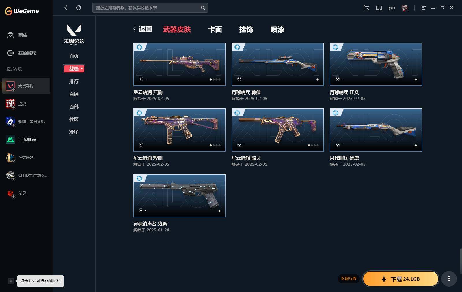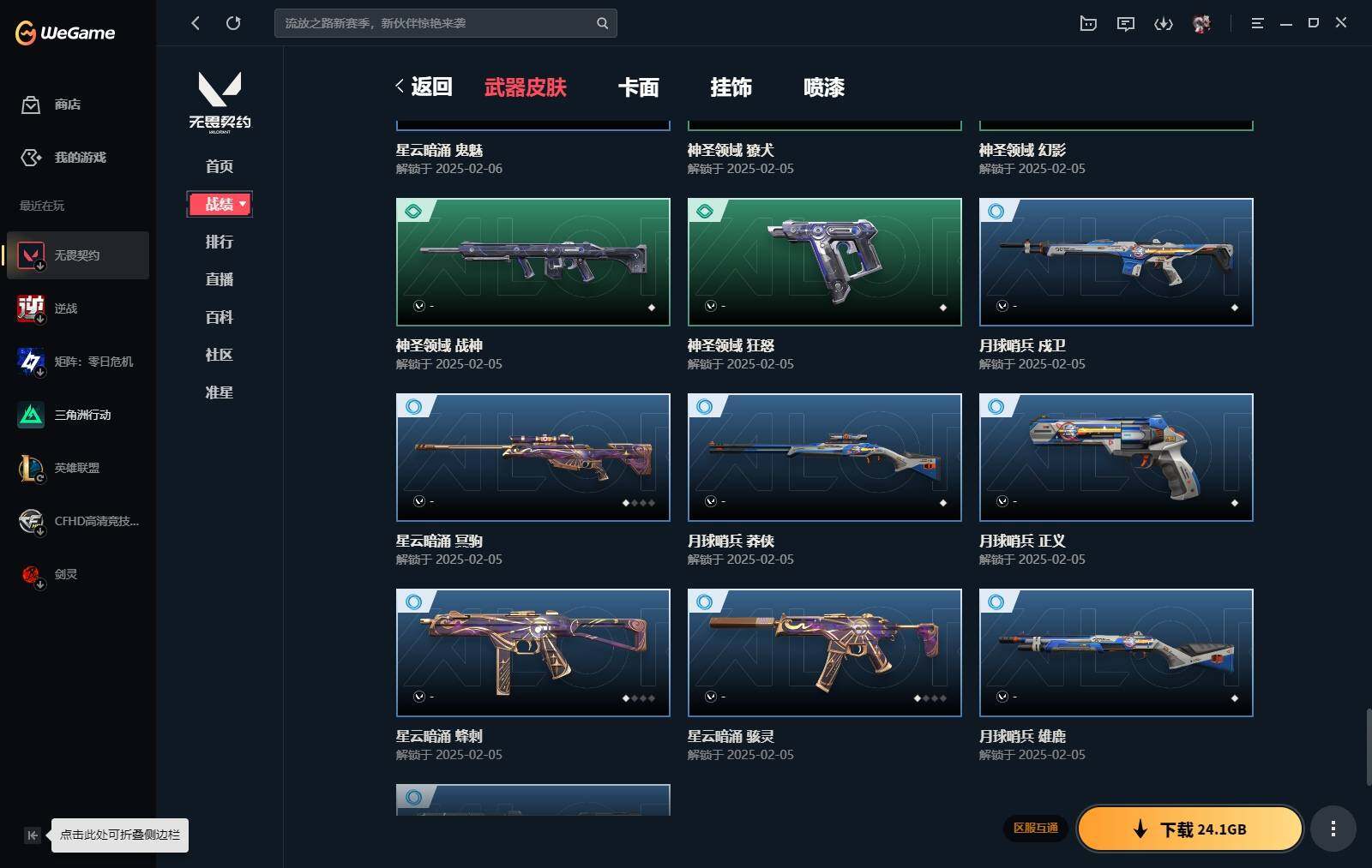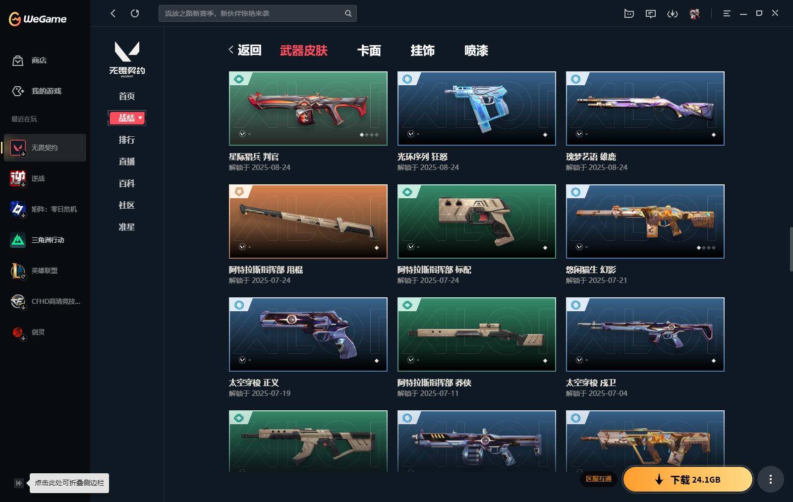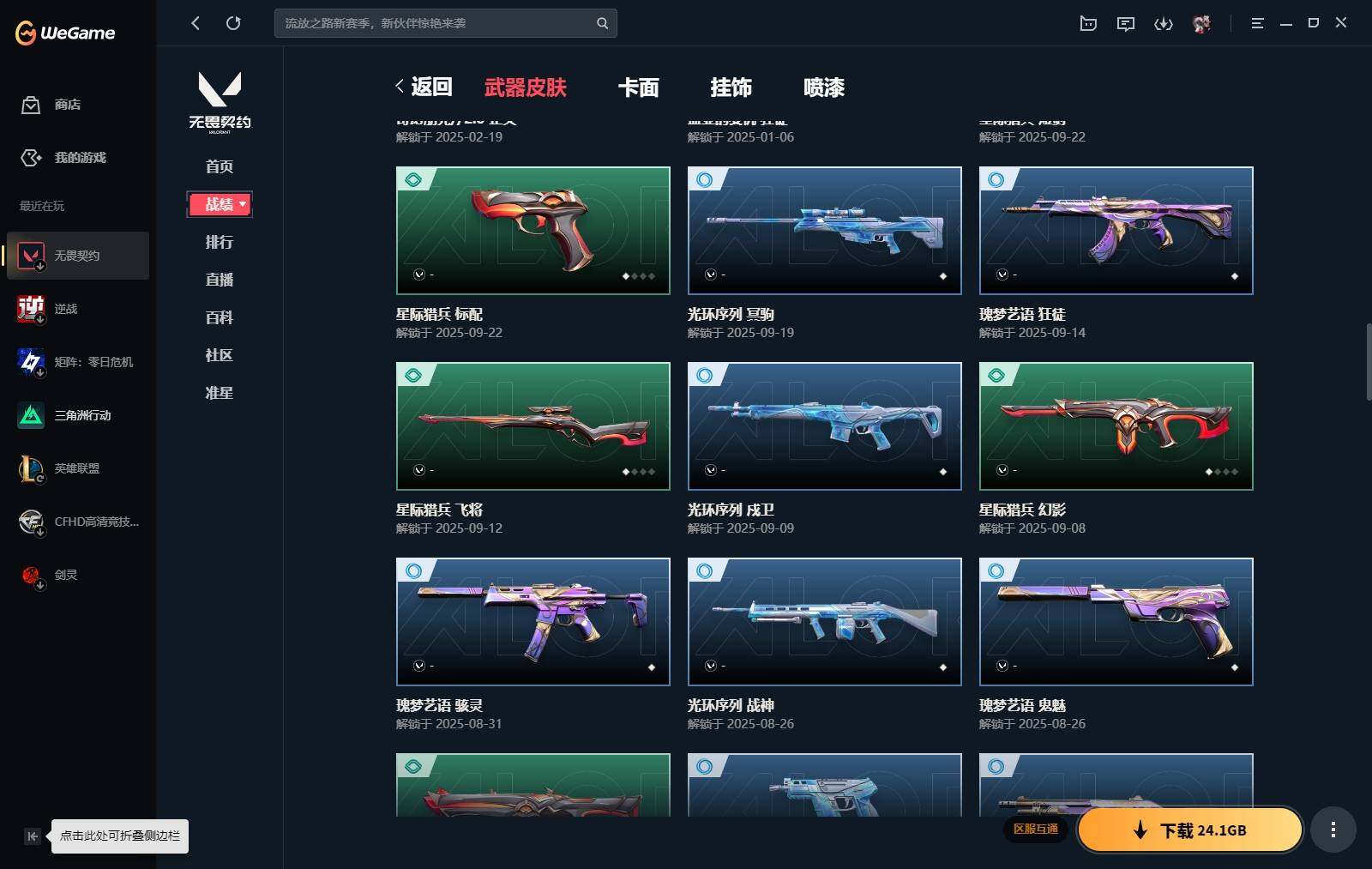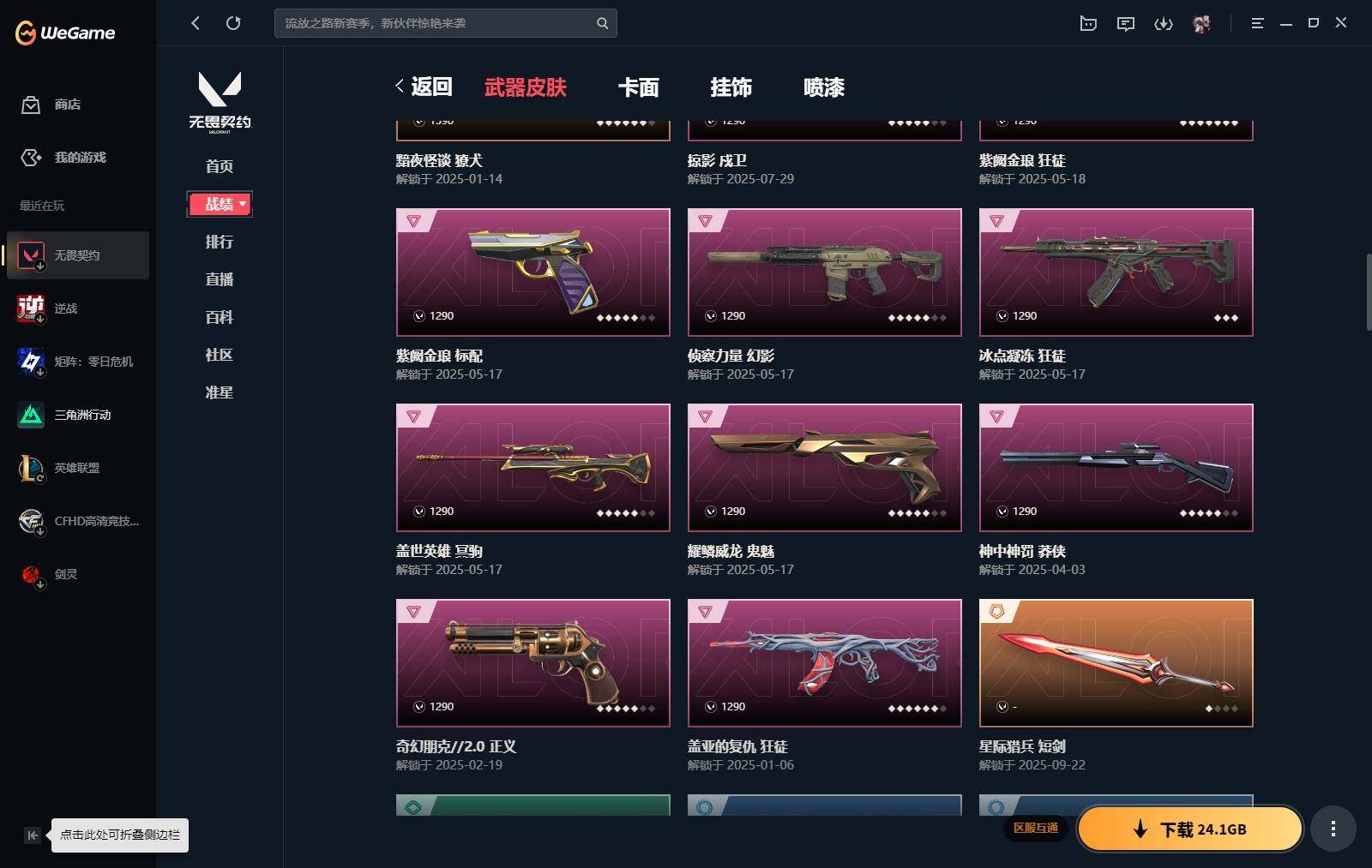 【497】【套装】:vct 2025 赛季套装,西部未来套装 【英雄】:幻棱,炼狱,维斯,暮蝶,钛狐,壹决,铁臂,捷风,雷兹,幽影,不死鸟,贤者,猎枭,蝰蛇,零,芮娜,奇乐,尚勃勒,霓虹,斯凯,夜露,星礈,k/o,海神,盖可,黑梦,钢锁 【近战 武器】:近战武器-魔术火花,近战武器-剥皮小刀,近战武器-vct 2025 爪刀,近战武器-源始幻刃,近战武器-未来开拓者,近战武器-诡秘蛇影 军刀,近战武器-神圣领域 战刀,近战武器-日耀风暴 遗器,近战武器-阿特拉斯指挥部 甩棍,近战武器-星际猎兵 短剑,近战武器-魔术火花 【狂徒】:狂徒-冰点凝冻,狂徒-盖亚的复仇,狂徒-紫阙金琅,狂徒-诡秘蛇影 【幻影】:幻影-西部未来,幻影-侦察力量,幻影-神圣领域,幻影-末日之翼,幻影-西部未来 【戍卫】:戍卫-掠影,戍卫-月球哨兵,戍卫-折光棱晶 【獠犬】:獠犬-黯夜怪谈,獠犬-神圣领域 【冥驹】:冥驹-归零者,冥驹-盖世英雄,冥驹-星云暗涌 【飞将】:飞将-西部未来,飞将-末日之翼 【莽侠】:莽侠-神中神罚,莽侠-诡秘蛇影,莽侠-月球哨兵 【战神】:战神-神圣领域 【奥丁】:奥丁-西部未来,奥丁-末日之翼 【判官】:判官-全息波普,判官-诡秘蛇影 【雄鹿】:雄鹿-月球哨兵 【骇灵】:骇灵-星云暗涌 【蜂刺】:蜂刺-混沌序曲,蜂刺-星云暗涌,蜂刺-折光棱晶 【标配】:标配-rgx 11z pro//2.0,标配-紫阙金琅,标配-折光棱晶 【正义】:正义-奇点,正义-西部未来,正义-奇幻朋克//2.0,正义-月球哨兵 【鬼魅】:鬼魅-耀鳞威龙,鬼魅-诡秘蛇影,鬼魅-灵魂消声者,鬼魅-星云暗涌 【狂怒】:狂怒-神圣领域 【短炮】:短炮-混沌序曲,短炮-末日之翼 【卡面】:精灵大战 卡面,南瓜盛典 卡面,无畏契约:暮蝶 卡面,clutch 卡面,梦幻奶茶 卡面,西装暴徒 卡面,源能反应 卡面,零点嗅探设计图 卡面,无畏契约go!第一卷:芮娜 卡面,清除名单 卡面,无畏契约go!第一卷:零 卡面,《双城之战》金克丝 卡面,无畏契约go!第一卷:贤者 卡面,钢锁vs盖可 卡面,热烈欢迎 卡面,铁臂设计图 卡面,代号红色 卡面,冰淇淋店 卡面,新兵报到 卡面,友军火力 卡面,v契约 卡面,无畏契约 卡面 【喷漆】:嗨宝南瓜灯 喷漆,控场勿近 喷漆,伤心心 喷漆,我的刀呢? 喷漆,买装还是存钱 喷漆,无畏契约go!第一卷:捷风 喷漆,红牌退场 喷漆,老铁困了 喷漆,口袋贤者 喷漆,胜利属于无畏契约 喷漆,glhf 喷漆,无畏契约 喷漆 【挂饰】:悠闲鸡块 挂饰,伞绳 挂饰,第九季//第三幕 纪念币 挂饰,荧光棒 挂饰,第八季//第三幕 纪念币 挂饰,天外飞客 挂饰,好运福爪 挂饰,第七季:青铜 挂饰,第七季//第三幕 纪念币 挂饰,幸运中国结 挂饰,第七季//第二幕 纪念币 挂饰,无畏契约 纪念币 挂饰