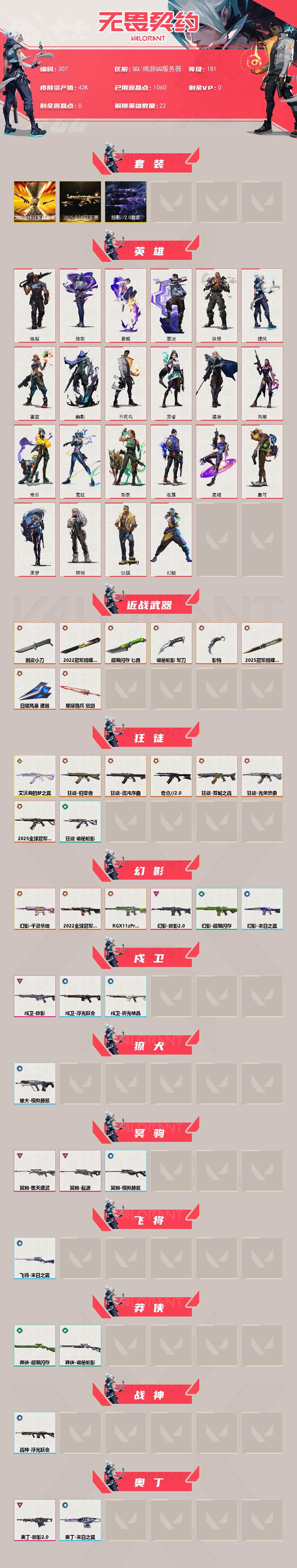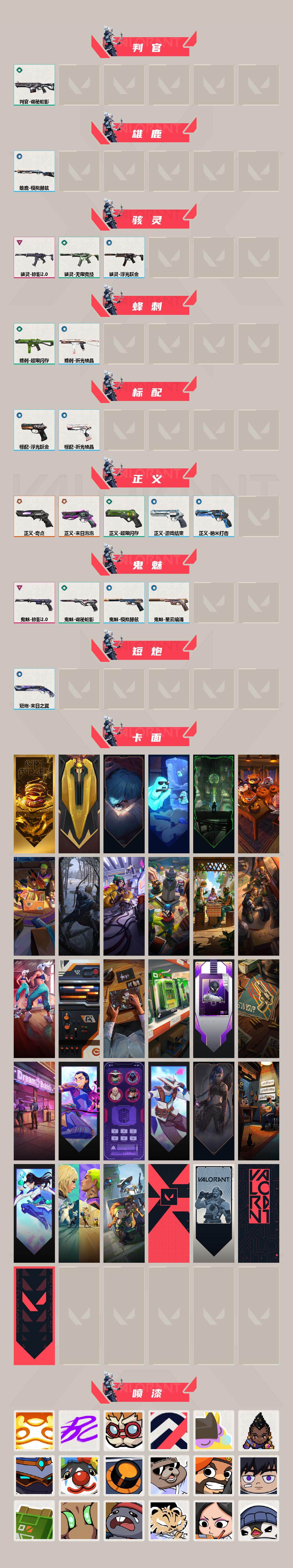 【307】【套装】:2025全球冠军赛套装,2022全球冠军赛套装,掠影//2.0套装 【英雄】:幻棱,炼狱,维斯,暮蝶,钛狐,壹决,铁臂,捷风,雷兹,幽影,不死鸟,贤者,猎枭,芮娜,奇乐,霓虹,斯凯,夜露,星礈,盖可,黑梦,钢锁 【近战 武器】:近战武器-2025全球冠军赛 蝴蝶刀,近战武器-2022全球冠军赛 蝴蝶刀,近战武器-影钩,近战武器-剥皮小刀,近战武器-超限闪存 匕首,近战武器-诡秘蛇影 军刀,近战武器-日耀风暴 遗器,近战武器-星际猎兵 短剑 【狂徒】:狂徒-艾沃莉的梦之翼,狂徒-2025全球冠军赛,狂徒-归零者,狂徒-混沌序曲,狂徒-奇点//2.0,狂徒-双城之战,狂徒-光荣异象,狂徒-诡秘蛇影 【幻影】:幻影-2022全球冠军赛,幻影-千灵华绽,幻影-rgx 11z pro//2.0,幻影-掠影//2.0,幻影-超限闪存,幻影-末日之翼 【戍卫】:戍卫-掠影,戍卫-浮光跃金,戍卫-折光棱晶 【獠犬】:獠犬-模拟赫兹 【冥驹】:冥驹-堕天遗武,冥驹-起源,冥驹-模拟赫兹 【飞将】:飞将-末日之翼 【莽侠】:莽侠-超限闪存,莽侠-诡秘蛇影 【战神】:战神-浮光跃金 【奥丁】:奥丁-掠影//2.0,奥丁-末日之翼 【判官】:判官-诡秘蛇影 【雄鹿】:雄鹿-模拟赫兹 【骇灵】:骇灵-掠影//2.0,骇灵-无限竞技,骇灵-浮光跃金 【蜂刺】:蜂刺-超限闪存,蜂刺-折光棱晶 【标配】:标配-浮光跃金,标配-折光棱晶 【正义】:正义-奇点,正义-末日泡泡,正义-超限闪存,正义-纳米打击,正义-游戏结束 【鬼魅】:鬼魅-掠影//2.0,鬼魅-诡秘蛇影,鬼魅-模拟赫兹,鬼魅-星云暗涌 【短炮】:短炮-末日之翼 【卡面】:终章:激斗汉堡 卡面,进入射程 卡面,《双城之战》拥抱 卡面,精灵大战 卡面,欢迎来到底城 卡面,南瓜盛典 卡面,唱片的故事 卡面,钢弓与箭弦 卡面,排除故障 卡面,战术桌游 卡面,悠享食光 卡面,修车达人 卡面,热舞环节 卡面,模拟赫兹 卡面,浮光跃金 卡面,超限闪存 卡面,维斯工牌 卡面,正义的化身 卡面,梦幻奶茶 卡面,无畏契约go!第一卷:芮娜 卡面,清除名单 卡面,无畏契约go!第一卷:零 卡面,《双城之战》金克丝 卡面,完美调谐 卡面 ,无畏契约go!第一卷:贤者 卡面,钢锁vs盖可 卡面,别冒尖 卡面,代号红色 卡面,新兵报到 卡面,v契约 卡面,无畏契约 卡面 【喷漆】:嗨宝南瓜灯 喷漆,嘭! 喷漆,都算到了 喷漆,控场勿近 喷漆,皮蛋呼呼 喷漆,像素星礈 喷漆,图谋不轨的零 喷漆,小丑猫 喷漆,模拟赫兹 喷漆,高丽风情小熊 喷漆,蹲到一个 喷漆,全力集中 喷漆,超限闪存 喷漆,rua一下 喷漆,熊抱 喷漆,高丽风情小虎 喷漆,记在小本本 喷漆,防弹企鹅 喷漆,高丽风情小蛙 喷漆,新潮流 喷漆,买装还是存钱 喷漆,无畏契约go!第一卷:芮娜 喷漆,胜利属于无畏契约 喷漆,glhf 喷漆,无畏契约 喷漆 【挂饰】:终章:猫猫木乃伊 挂饰,悠闲鸡块 挂饰,伞绳 挂饰,《双城之战》小蛋糕 挂饰,第九季//第三幕 纪念币 挂饰,拳击战术熊 挂饰,工具腰带 挂饰,暗藏猫腻 挂饰,高丽风情 挂饰,熔岩灯 挂饰,超限闪存 挂饰,迷你k/o 挂饰,模拟赫兹 挂饰,第九季//第二幕 纪念币 挂饰,z世代特饮 挂饰,天外飞客 挂饰,《双城之战》魄罗 挂饰,无畏契约 纪念币 挂饰
