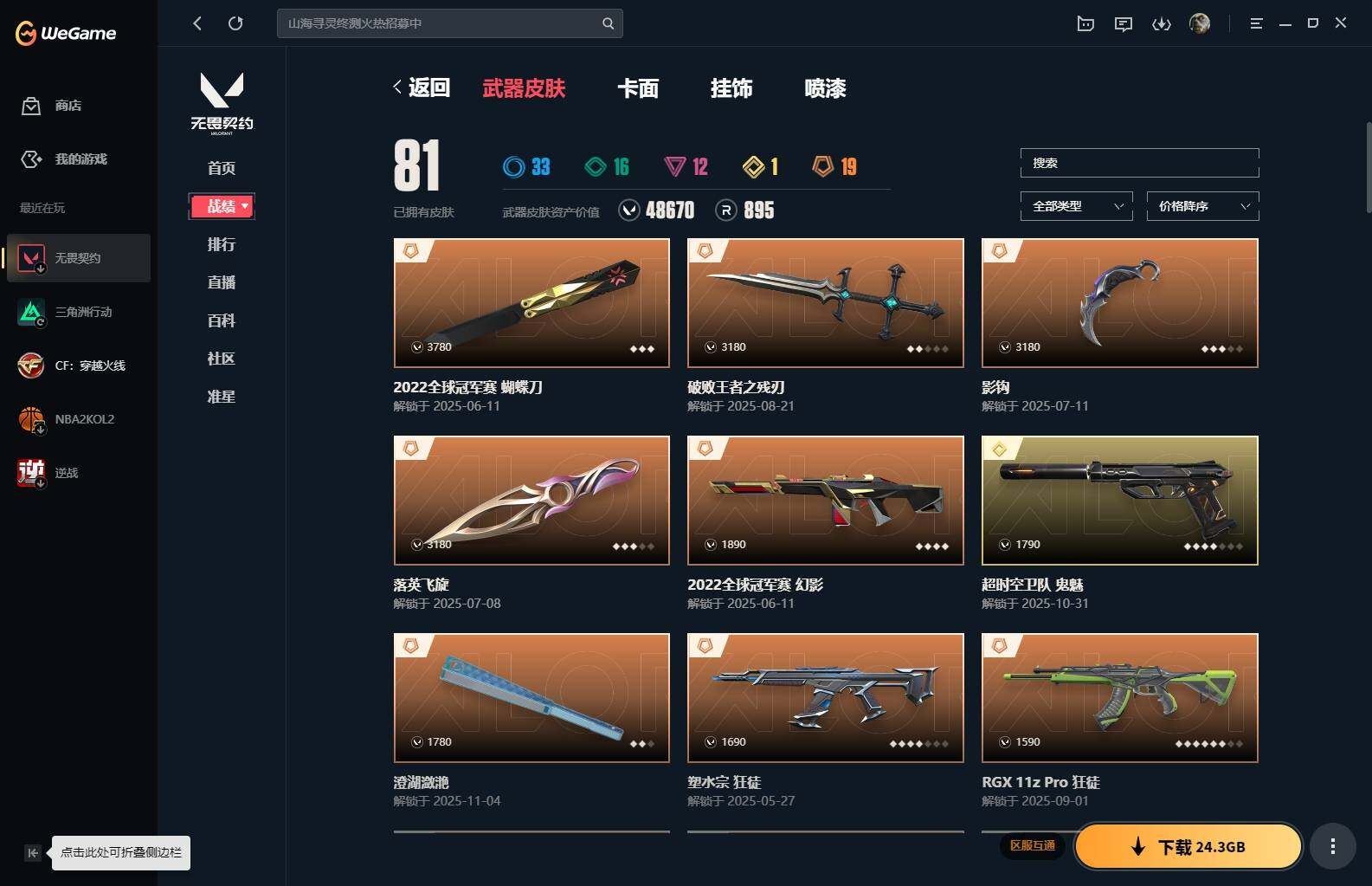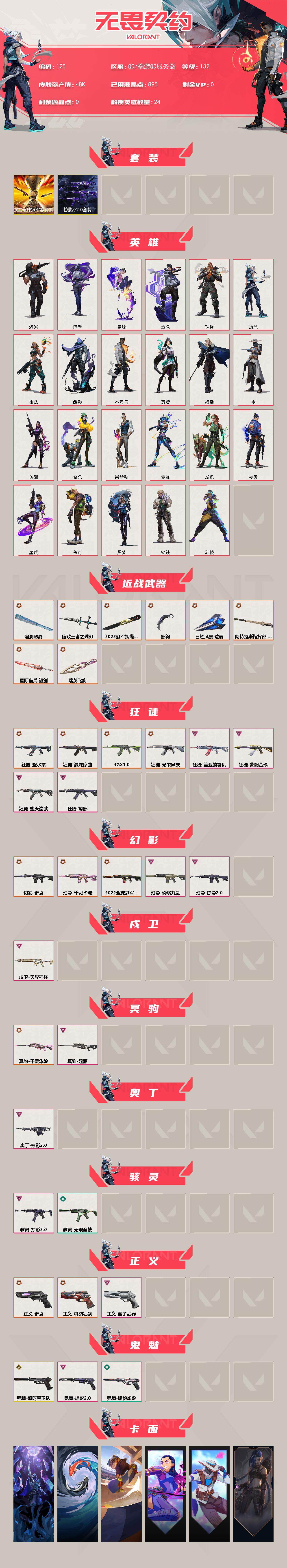 【125】xq14689 【套装】:2022全球冠军赛套装,掠影//2.0套装 【英雄】:幻棱,炼狱,维斯,暮蝶,壹决,铁臂,捷风,雷兹,幽影,不死鸟,贤者,猎枭,零,芮娜,奇乐,尚勃勒,霓虹,斯凯,夜露,星礈,盖可,黑梦,钢锁 【近战 武器】:近战武器-2022全球冠军赛 蝴蝶刀,近战武器-影钩,近战武器-落英飞旋,近战武器-澄湖潋滟,近战武器-破败王者之残刃,近战武器-日耀风暴 遗器,近战武器-阿特拉斯指挥部 甩棍,近战武器-星际猎兵 短剑 【狂徒】:狂徒-混沌序曲,狂徒-塑水宗,狂徒-rgx 11z pro,狂徒-光荣异象,狂徒-堕天遗武,狂徒-掠影,狂徒-盖亚的复仇,狂徒-紫阙金琅 【幻影】:幻影-2022全球冠军赛,幻影-奇点,幻影-千灵华绽,幻影-侦察力量,幻影-掠影//2.0 【戍卫】:戍卫-天界神兵 【冥驹】:冥驹-千灵华绽,冥驹-起源 【奥丁】:奥丁-掠影//2.0 【骇灵】:骇灵-掠影//2.0,骇灵-无限竞技 【正义】:正义-机动狂飙,正义-奇点,正义-离子武器 【鬼魅】:鬼魅-超时空卫队,鬼魅-掠影//2.0,鬼魅-诡秘蛇影 【卡面】:失而复得 卡面,红鳞松叶 卡面,clutch 卡面,无畏契约go!第一卷:芮娜 卡面,无畏契约go!第一卷:零 卡面,《双城之战》金克丝 卡面,钢锁vs盖可 卡面,别冒尖 卡面,代号红色 卡面,新兵报到 卡面,v契约 卡面,无畏契约 卡面 【喷漆】:买装还是存钱 喷漆,关门放狗 喷漆,红鳞 喷漆,无畏契约go!第一卷:贤者 喷漆,暴走萝莉 喷漆,胜利属于无畏契约 喷漆,glhf 喷漆,无畏契约 喷漆 【挂饰】:薰衣草之心 挂饰,天外飞客 挂饰,《双城之战》魄罗 挂饰,无畏契约 纪念币 挂饰