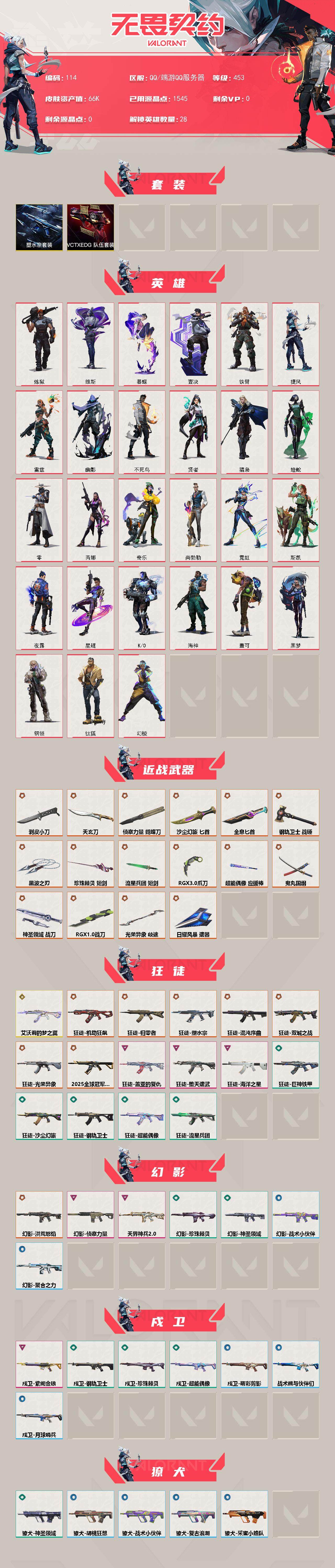 【114】xq22932 【套装】:塑水宗套装,vctxedg 队伍套装 【英雄】:幻棱,炼狱,维斯,暮蝶,钛狐,壹决,铁臂,捷风,雷兹,幽影,不死鸟,贤者,猎枭,蝰蛇,零,芮娜,奇乐,尚勃勒,霓虹,斯凯,夜露,星礈,k/o,海神,盖可,黑梦,钢锁 【近战 武器】:近战武器-光荣异象 歧途,近战武器-rgx 11z pro 战刀,近战武器-侦察力量 蝴蝶刀,近战武器-剥皮小刀,近战武器-rgx 11z pro//3.0 爪刀,近战武器-黑波之刃,近战武器-鬼丸国纲,近战武器-珍珠棘贝 短剑,近战武器-流星兵团 短剑,近战武器-超能偶像 应援棒,近战武器-钢轨卫士 战锤,近战武器-全息匕首,近战武器-沙尘幻旅 匕首,近战武器-天玄刀,近战武器-神圣领域 战刀,近战武器-日耀风暴 遗器 【狂徒】:狂徒-艾沃莉的梦之翼,狂徒-2025全球冠军赛,狂徒-归零者,狂徒-混沌序曲,狂徒-机动狂飙,狂徒-双城之战,狂徒-塑水宗,狂徒-光荣异象,狂徒-堕天遗武,狂徒-盖亚的复仇,狂徒-海洋之星,狂徒-超能偶像,狂徒-钢轨卫士,狂徒-巨神铁甲,狂徒-流星兵团,狂徒-沙尘幻旅 【幻影】:幻影-洪荒怒焰,幻影-天界神兵//2.0,幻影-侦察力量,幻影-珍珠棘贝,幻影-神圣领域,幻影-聚合之力,幻影-战术小伙伴 【戍卫】:戍卫-紫阙金琅,戍卫-超能偶像,戍卫-钢轨卫士,戍卫-珍珠棘贝,戍卫-萌彩剪影,戍卫-战术熊与伙伴们,戍卫-月球哨兵 【獠犬】:獠犬-神圣领域,獠犬-采蜜小蜂队,獠犬-复古浪潮,獠犬-胡桃狂想,獠犬-战术小伙伴 【冥驹】:冥驹-堕天遗武,冥驹-复古浪潮,冥驹-胡桃狂想,冥驹-星云暗涌 【飞将】:飞将-塑水宗,飞将-天界神兵,飞将-沙尘幻旅,飞将-聚合之力,飞将-光导纤维,飞将-战术熊与伙伴们 【莽侠】:莽侠-深海水族,莽侠-纤云弄巧,莽侠-月球哨兵 【战神】:战神-神圣领域,战神-采蜜小蜂队,战神-萌彩剪影,战神-深海水族 【奥丁】:奥丁-流星兵团,奥丁-战术小伙伴 【判官】:判官-千灵华绽,判官-超能偶像,判官-采蜜小蜂队,判官-萌彩剪影 【雄鹿】:雄鹿-离子武器,雄鹿-复古浪潮,雄鹿-月球哨兵 【骇灵】:骇灵-塑水宗,骇灵-流星兵团,骇灵-沙尘幻旅,骇灵-珍珠棘贝,骇灵-光导纤维,骇灵-星云暗涌 【蜂刺】:蜂刺-胡桃狂想,蜂刺-聚合之力,蜂刺-深海水族,蜂刺-纤云弄巧,蜂刺-战术小伙伴,蜂刺-星云暗涌 【标配】:标配-超能偶像,标配-光导纤维,标配-战术熊与伙伴们 【vct手呛】:标配-vct x edg,标配-vct x lev 【正义】:正义-塑水宗,正义-超限闪存,正义-沙尘幻旅,正义-复古浪潮,正义-纳米打击,正义-纤云弄巧,正义-月球哨兵 【鬼魅】:鬼魅-盖世英雄,鬼魅-流星兵团,鬼魅-诡秘蛇影,鬼魅-采蜜小蜂队,鬼魅-光导纤维,鬼魅-胡桃狂想,鬼魅-数码咒术,鬼魅-星云暗涌 【狂怒】:狂怒-钢轨卫士,狂怒-珍珠棘贝,狂怒-神圣领域,狂怒-聚合之力,狂怒-萌彩剪影,狂怒-战术熊与伙伴们 【短炮】:短炮-归零者,短炮-钢轨卫士,短炮-弧光异彩,短炮-深海水族,短炮-天才少女,短炮-纤云弄巧 【卡面】:终章:激斗汉堡 卡面,进入射程 卡面,分崩离析 卡面,纳米打击 卡面,《双城之战》拥抱 卡面,精灵大战 卡面,欢迎来到底城 卡面,南瓜盛典 卡面,无畏契约:暮蝶 卡面,修车达人 卡面,正义的化身 卡面,终章:生意人麦宝 卡面,铁之华 卡面,失而复得 卡面,时间到 卡面,最高舞台 卡面,复活专家 卡面,归乡 // 蝰蛇 卡面,超能偶像 卡面,生意人麦宝 卡面,先瓦为敬 银色 卡面,声感陷阱设计图 卡面,clutch 卡面,霓帧牛蛙 卡面,钢锁工牌 卡面,战术小伙伴的夏日 卡面,采蜜小蜂队 卡面,聚合之力 卡面,梦幻奶茶 卡面,终章:打造专属狂徒 卡面,趁热吃 卡面,西装暴徒 卡面,失控边缘 卡面,哨卫者之领域 卡面,暮蝶工牌 卡面,战术熊与伙伴们 卡面,源能反应 卡面,流星兵团 卡面,纤云弄巧 卡面,暂别喧嚣 卡面,打造专属狂徒 卡面,零点嗅探设计图 卡面,终章:瓦娃脸雪糕 卡面,无畏契约:蝰蛇 卡面,表象之下 卡面,虹吸式咖啡壶 卡面,源能者美容 卡面,脚踝终结者 卡面 ,夜班 卡面,瓦娃脸雪糕 卡面 ,沙雕爆能器 卡面,无畏契约go!第一卷:芮娜 卡面,深海水族 卡面,珍珠棘贝 卡面,复古浪潮 卡面,盖可工牌 卡面,清除名单 卡面,无畏契约go!第一卷:零 卡面,终章:同步耍酷 卡面,龍记 卡面,化茧成蝶 卡面,比比看谁快? 卡面,无垠星环 卡面,《双城之战》金克丝 卡面,蝰蛇vs幽影 卡面,势不可挡//盖可 卡面,逆向独行 卡面 ,同步耍酷 卡面,完美调谐 卡面 ,没有什么能逃过我的眼睛 卡面,光导纤维 卡面,战术小伙伴 卡面,钢轨卫士 卡面,暗呛 卡面,无畏契约go!第一卷:贤者 卡面,终章:黑影先生的咖啡! 卡面,铁臂vs雷兹 卡面,纪念照 p2 卡面,钢锁vs盖可 卡面,别冒尖 卡面,一击全倒 卡面,黑影先生的咖啡! 卡面,天台狂欢 卡面,胡桃狂想 卡面,沙尘幻旅 卡面,壹决工牌 卡面,萌彩剪影 卡面,势不可挡//k/o 卡面,夯实根基 卡面,"luie" 卡面,热烈欢迎 卡面,铁臂设计图 卡面,代号红色 卡面,冰淇淋店 卡面,新兵报到 卡面,友军火力 卡面,v契约 卡面,无畏契约 卡面 【喷漆】:嗨宝南瓜灯 喷漆,嘭! 喷漆,都算到了 喷漆,控场勿近 喷漆,伤心心 喷漆,小丑猫 喷漆,熊抱 喷漆,高丽风情小虎 喷漆,防弹企鹅 喷漆,又被闪了 喷漆,终极羞辱 喷漆,超级粉丝 喷漆,黯兽卖萌 喷漆,捷风差距 喷漆,惊声尖叫 喷漆,2021冠军巡回赛花火 喷漆,五人成星 喷漆,超能偶像 喷漆,放我出去 喷漆,审判之爪 喷漆,掩护我 喷漆,大佬发呛 喷漆,边缘试探 喷漆,拼一呛 喷漆,聚合之力 喷漆,采蜜小蜂队 喷漆,梦幻小队 喷漆,五个