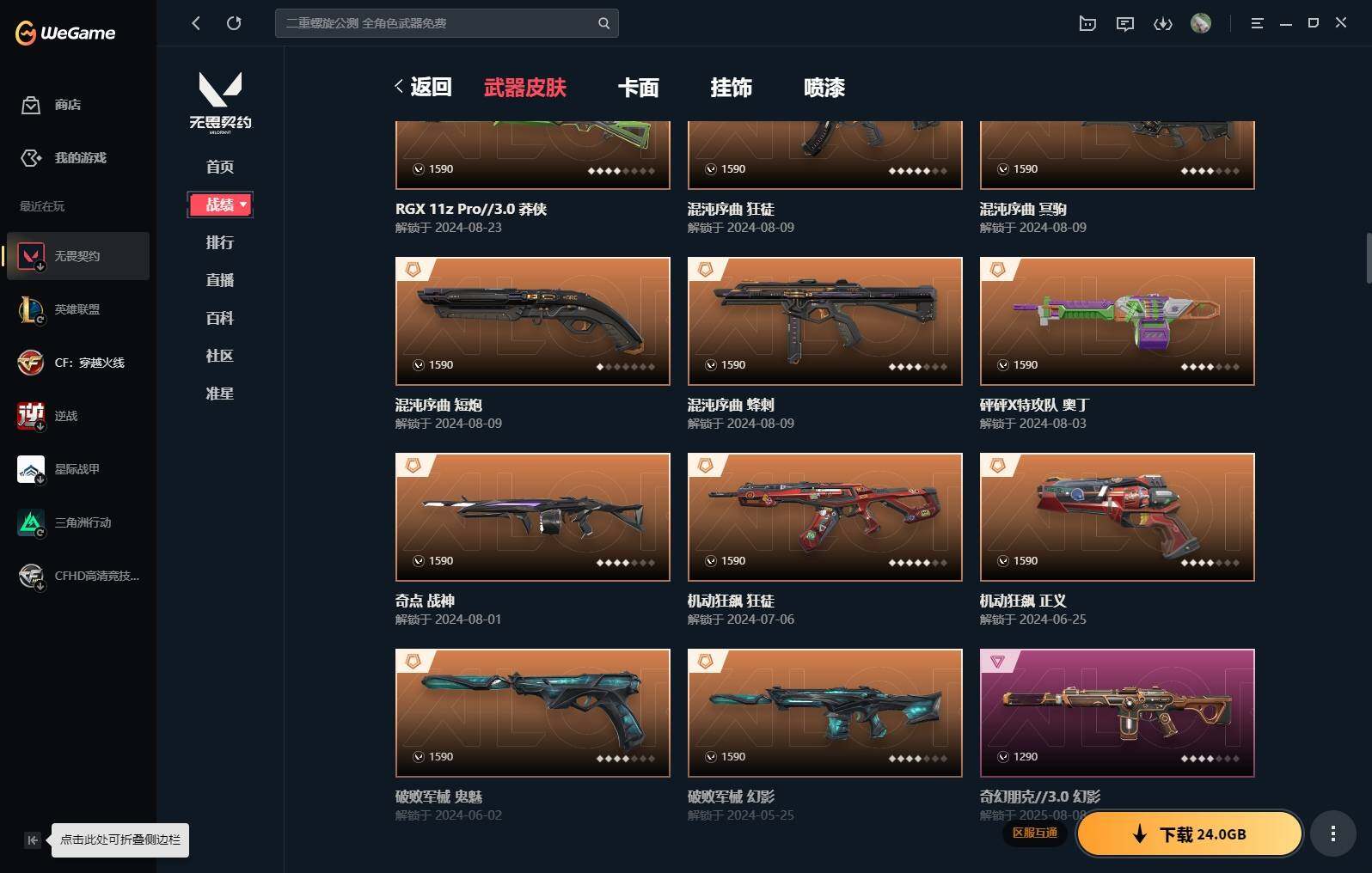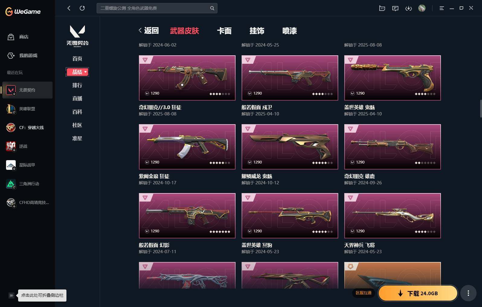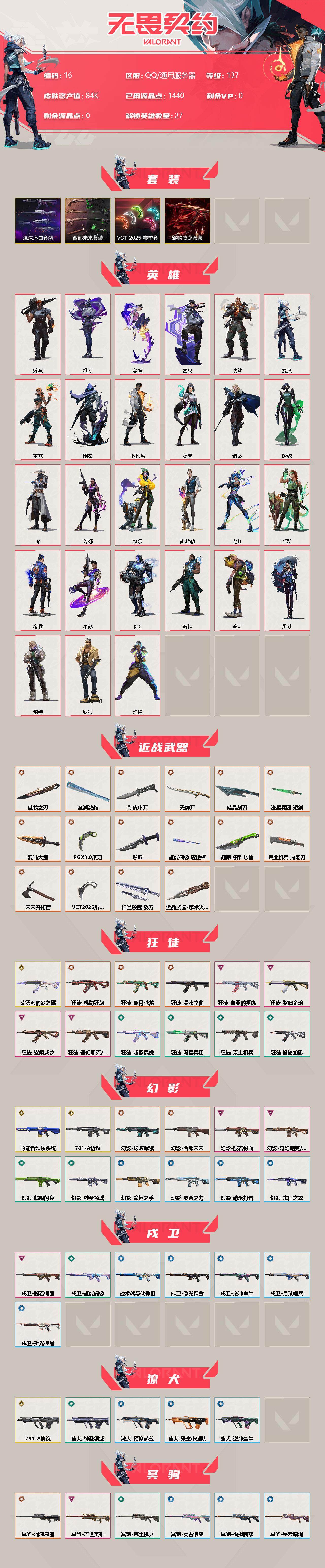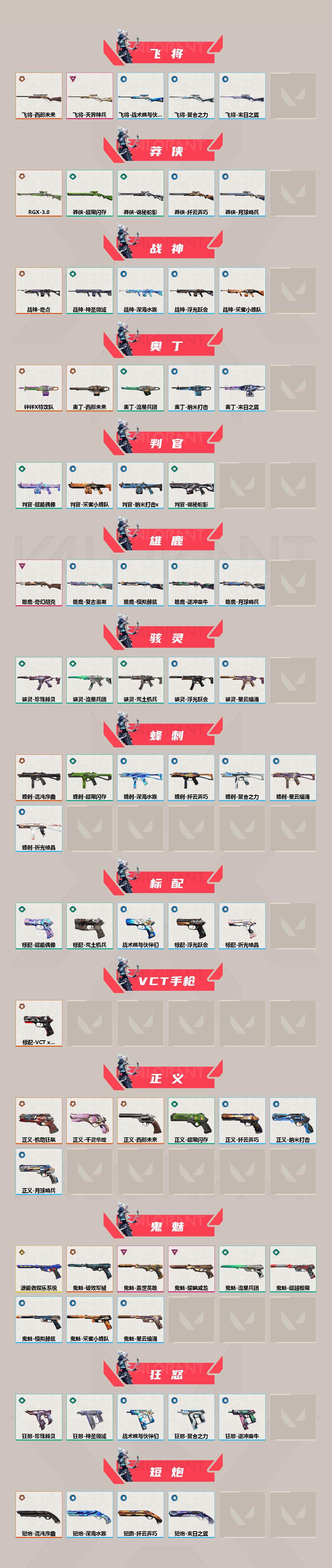 【16】【套装】:vct 2025 赛季套装,西部未来套装,混沌序曲套装,耀鳞威龙套装 【英雄】:幻棱,炼狱,维斯,暮蝶,钛狐,壹决,铁臂,捷风,雷兹,幽影,不死鸟,贤者,猎枭,蝰蛇,零,芮娜,奇乐,尚勃勒,霓虹,斯凯,夜露,星礈,k/o,海神,盖可,黑梦,钢锁 【近战 武器】:近战武器-魔术火花,近战武器-剥皮小刀,近战武器-vct 2025 爪刀,近战武器-rgx 11z pro//3.0 爪刀,近战武器-威龙之刃,近战武器-澄湖潋滟,近战武器-未来开拓者,近战武器-混沌大剑,近战武器-流星兵团 短剑,近战武器-超能偶像 应援棒,近战武器-超限闪存 匕首,近战武器-硅晶刻刀,近战武器-荒土机兵 热能刀,近战武器-天御刀,近战武器-影刃,近战武器-神圣领域 战刀,近战武器-魔术火花 【狂徒】:狂徒-艾沃莉的梦之翼,狂徒-混沌序曲,狂徒-机动狂飙,狂徒-偃月苍龙,狂徒-盖亚的复仇,狂徒-耀鳞威龙,狂徒-紫阙金琅,狂徒-奇幻朋克//3.0,狂徒-超能偶像,狂徒-荒土机兵,狂徒-流星兵团,狂徒-诡秘蛇影 【幻影】:幻影-781-a协议,幻影-源能者娱乐系统,幻影-破败军械,幻影-西部未来,幻影-般若假面,幻影-奇幻朋克//3.0,幻影-超限闪存,幻影-神圣领域,幻影-聚合之力,幻影-命运之手,幻影-纳米打击,幻影-末日之翼,幻影-西部未来 【戍卫】:戍卫-般若假面,戍卫-超能偶像,戍卫-浮光跃金,戍卫-逆冲蛮牛,戍卫-战术熊与伙伴们,戍卫-月球哨兵,戍卫-折光棱晶 【獠犬】:獠犬-781-a协议,獠犬-神圣领域,獠犬-采蜜小蜂队,獠犬-模拟赫兹,獠犬-逆冲蛮牛 【冥驹】:冥驹-混沌序曲,冥驹-盖世英雄,冥驹-荒土机兵,冥驹-复古浪潮,冥驹-模拟赫兹,冥驹-星云暗涌 【飞将】:飞将-西部未来,飞将-天界神兵,飞将-聚合之力,飞将-战术熊与伙伴们,飞将-末日之翼 【莽侠】:莽侠-rgx 11z pro//3.0,莽侠-超限闪存,莽侠-诡秘蛇影,莽侠-纤云弄巧,莽侠-月球哨兵 【战神】:战神-奇点,战神-神圣领域,战神-采蜜小蜂队,战神-浮光跃金,战神-深海水族 【奥丁】:奥丁-砰砰x特攻队,奥丁-西部未来,奥丁-流星兵团,奥丁-纳米打击,奥丁-末日之翼 【判官】:判官-超能偶像,判官-诡秘蛇影,判官-采蜜小蜂队,判官-纳米打击x 【雄鹿】:雄鹿-奇幻朋克,雄鹿-复古浪潮,雄鹿-模拟赫兹,雄鹿-逆冲蛮牛,雄鹿-月球哨兵 【骇灵】:骇灵-荒土机兵,骇灵-流星兵团,骇灵-珍珠棘贝,骇灵-浮光跃金,骇灵-星云暗涌 【蜂刺】:蜂刺-混沌序曲,蜂刺-超限闪存,蜂刺-聚合之力,蜂刺-深海水族,蜂刺-纤云弄巧,蜂刺-星云暗涌,蜂刺-折光棱晶 【标配】:标配-超能偶像,标配-荒土机兵,标配-浮光跃金,标配-战术熊与伙伴们,标配-折光棱晶 【vct手呛】:标配-vct x g2 【正义】:正义-机动狂飙,正义-千灵华绽,正义-西部未来,正义-超限闪存,正义-纳米打击,正义-纤云弄巧,正义-月球哨兵 【鬼魅】:鬼魅-源能者娱乐系统,鬼魅-破败军械,鬼魅-盖世英雄,鬼魅-耀鳞威龙,鬼魅-超越极限,鬼魅-流星兵团,鬼魅-采蜜小蜂队,鬼魅-模拟赫兹,鬼魅-星云暗涌 【狂怒】:狂怒-珍珠棘贝,狂怒-神圣领域,狂怒-聚合之力,狂怒-逆冲蛮牛,狂怒-战术熊与伙伴们 【短炮】:短炮-混沌序曲,短炮-深海水族,短炮-纤云弄巧,短炮-末日之翼 【卡面】:终章:激斗汉堡 卡面,进入射程 卡面,分崩离析 卡面,纳米打击 卡面,抑制技术 卡面,激斗汉堡 卡面,瓦娃脸雪糕 p2 卡面,从黄昏到黎明 卡面,荒土机兵 卡面,银弹猎手 卡面,逆冲蛮牛 卡面,《双城之战》拥抱 卡面,精灵大战 卡面,欢迎来到底城 卡面,南瓜盛典 卡面,vct cn首冠 卡面,唱片的故事 卡面,钢弓与箭弦 卡面,排除故障 卡面,战术桌游 卡面,悠享食光 卡面,修车达人 卡面,热舞环节 卡面,模拟赫兹 卡面,浮光跃金 卡面,超限闪存 卡面,维斯工牌 卡面,正义的化身 卡面,终章:生意人麦宝 卡面,铁之华 卡面,失而复得 卡面,时间到 卡面,最高舞台 卡面,复活专家 卡面,归乡 // 蝰蛇 卡面,超能偶像 卡面,生意人麦宝 卡面,音熊登场 卡面,声感陷阱设计图 卡面,红鳞松叶 卡面,钢锁工牌 卡面,战术小伙伴的夏日 卡面,采蜜小蜂队 卡面,聚合之力 卡面,梦幻奶茶 卡面,终章:打造专属狂徒 卡面,趁热吃 卡面,西装暴徒 卡面,失控边缘 卡面,哨卫者之领域 卡面,暮蝶工牌 卡面,战术熊与伙伴们 卡面,源能反应 卡面,流星兵团 卡面,纤云弄巧 卡面,暂别喧嚣 卡面,打造专属狂徒 卡面,零点嗅探设计图 卡面,瓦娃脸雪糕 卡面 ,vct x g2 卡面,沙雕爆能器 卡面,无畏契约go!第一卷:芮娜 卡面,深海水族 卡面,珍珠棘贝 卡面,复古浪潮 卡面,盖可工牌 卡面,清除名单 卡面,无畏契约go!第一卷:零 卡面,《双城之战》金克丝 卡面,代号红色 卡面,新兵报到 卡面,v契约 卡面,无畏契约 卡面 【喷漆】:小小心意 喷漆,战“素”兔 喷漆,宇宙的指引 喷漆,请求重启 喷漆,逆冲蛮牛 喷漆,纳米打击 喷漆,鼻尖上的蝴蝶 喷漆,简笔画黯兽 喷漆,独守蝰腹 喷漆,他们将落荒而逃 喷漆,通缉:战术企鹅 喷漆,荒土机兵 喷漆,别挡我吃球! 喷漆,嗨宝南瓜灯 喷漆,嘭! 喷漆,都算到了 喷漆,控场勿近 喷漆,皮蛋呼呼 喷漆,像素星礈 喷漆,图谋不轨的零 喷漆,小丑猫 喷漆,模拟赫兹 喷漆,高丽风情小熊 喷漆,蹲到一个 喷漆,全力集中 喷漆,超限闪存 喷漆,rua一下 喷漆,熊抱 喷漆,蛋糕还是爆能器? 喷漆,高丽风情小虎 喷漆,记在小本本 喷漆,防弹企鹅 喷漆,高丽风情小蛙 喷漆,又被闪了 喷漆,终极羞辱 喷漆,超级粉丝 喷漆,黯兽卖萌 喷漆,捷风差距 喷漆,惊声尖叫 喷漆,水晶球 喷漆,2021冠军巡回赛花火 喷漆,五人成星