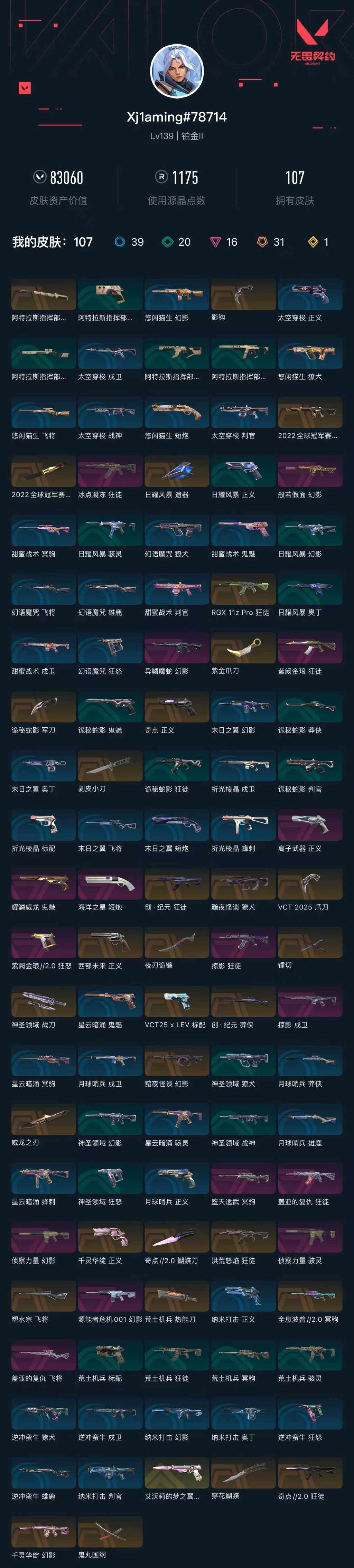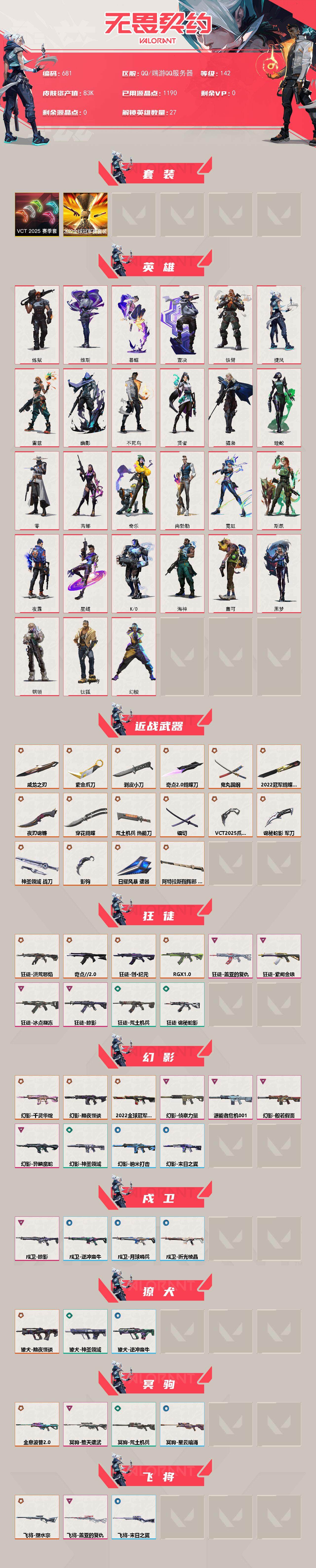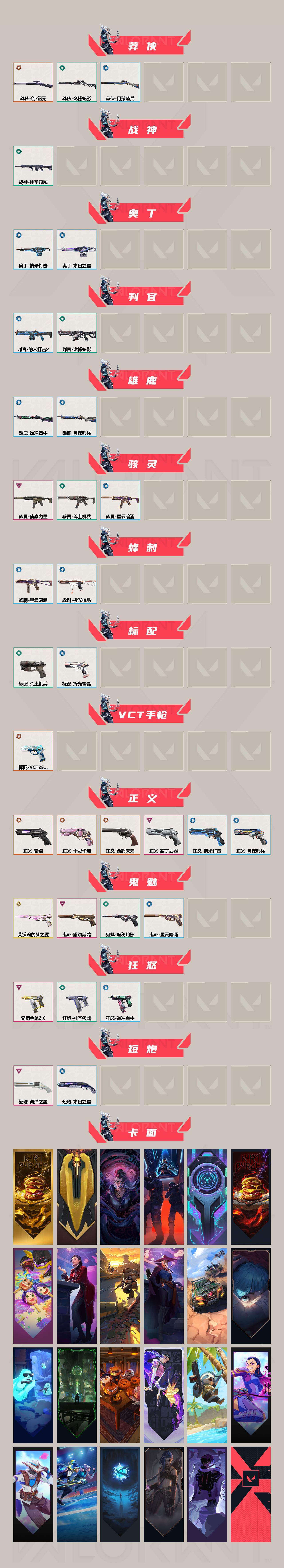 [14563452]【套装】:2022全球冠军赛套装,vct 2025 赛季套装 【英雄】:幻棱,炼狱,维斯,暮蝶,钛狐,壹决,铁臂,捷风,雷兹,幽影,不死鸟,贤者,猎枭,蝰蛇,零,芮娜,奇乐,尚勃勒,霓虹,斯凯,夜露,星礈,k/o,海神,盖可,黑梦,钢锁 【近战 武器】:近战武器-2022全球冠军赛 蝴蝶刀,近战武器-影钩,近战武器-穿花蝴蝶,近战武器-剥皮小刀,近战武器-奇点//2.0 蝴蝶刀,近战武器-vct 2025 爪刀,近战武器-紫金爪刀,近战武器-镭切,近战武器-威龙之刃,近战武器-鬼丸国纲,近战武器-荒土机兵 热能刀,近战武器-夜刃诡镰,近战武器-诡秘蛇影 军刀,近战武器-神圣领域 战刀,近战武器-日耀风暴 遗器,近战武器-阿特拉斯指挥部 甩棍 【狂徒】:狂徒-洪荒怒焰,狂徒-奇点//2.0,狂徒-创·纪元,狂徒-rgx 11z pro,狂徒-冰点凝冻,狂徒-掠影,狂徒-盖亚的复仇,狂徒-紫阙金琅,狂徒-荒土机兵,狂徒-诡秘蛇影 【幻影】:幻影-2022全球冠军赛,幻影-黯夜怪谈,幻影-千灵华绽,幻影-般若假面,幻影-源能者危机001,幻影-侦察力量,幻影-异鳞魔蛇,幻影-神圣领域,幻影-纳米打击,幻影-末日之翼 【戍卫】:戍卫-掠影,戍卫-逆冲蛮牛,戍卫-月球哨兵,戍卫-折光棱晶 【獠犬】:獠犬-黯夜怪谈,獠犬-神圣领域,獠犬-逆冲蛮牛 【冥驹】:冥驹-全息波普//2.0,冥驹-堕天遗武,冥驹-荒土机兵,冥驹-星云暗涌 【飞将】:飞将-塑水宗,飞将-盖亚的复仇,飞将-末日之翼 【莽侠】:莽侠-创·纪元,莽侠-诡秘蛇影,莽侠-月球哨兵 【战神】:战神-神圣领域 【奥丁】:奥丁-纳米打击,奥丁-末日之翼 【判官】:判官-诡秘蛇影,判官-纳米打击x 【雄鹿】:雄鹿-逆冲蛮牛,雄鹿-月球哨兵 【骇灵】:骇灵-侦察力量,骇灵-荒土机兵,骇灵-星云暗涌 【蜂刺】:蜂刺-星云暗涌,蜂刺-折光棱晶 【标配】:标配-荒土机兵,标配-折光棱晶 【vct手呛】:标配-vct25 x lev 【正义】:正义-奇点,正义-千灵华绽,正义-西部未来,正义-离子武器,正义-纳米打击,正义-月球哨兵 【鬼魅】:鬼魅-艾沃莉的梦之翼,鬼魅-耀鳞威龙,鬼魅-诡秘蛇影,鬼魅-星云暗涌 【狂怒】:狂怒-紫阙金琅//2.0,狂怒-神圣领域,狂怒-逆冲蛮牛 【短炮】:短炮-海洋之星,短炮-末日之翼 【卡面】: