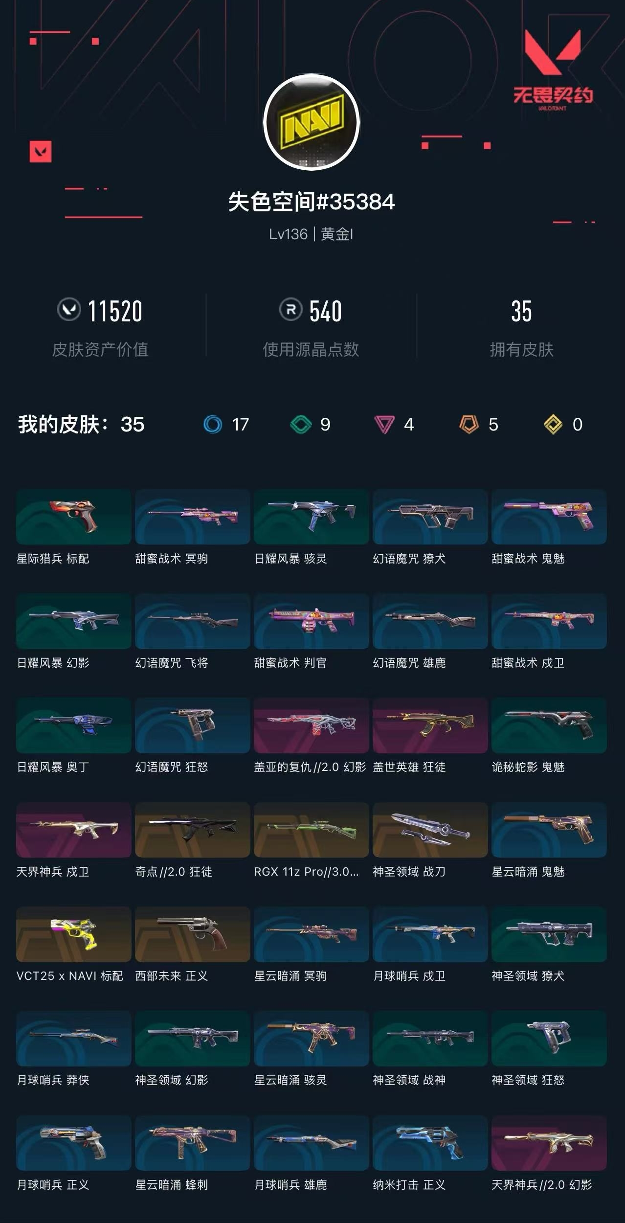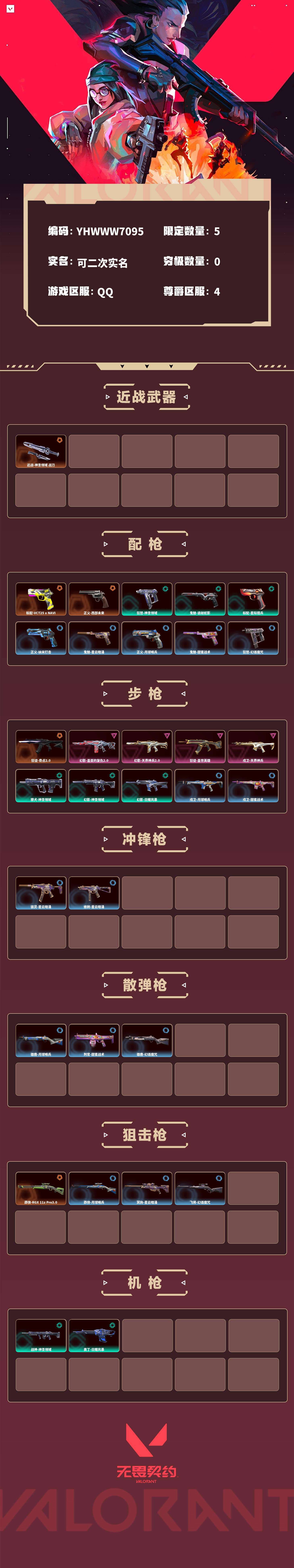 【无畏契约】【yhwww7095】等级:136,已用无畏点11520,已用源晶点540,橙皮:莽侠-rgx 11z pro3.0|狂徒-奇点2.0|近战-神圣领域 战刀|标配-vct25 x navi|正义-西部未来__紫皮:幻影-盖亚的复仇2.0|幻影-天界神兵2.0|狂徒-盖世英雄|戍卫-天界神兵__段位:黄金__蓝皮:正义-纳米打击|鬼魅-星云暗涌|骇灵-星云暗涌|正义-月球哨兵|莽侠-月球哨兵|戍卫-月球哨兵|雄鹿-月球哨兵|冥驹-星云暗涌|蜂刺-星云暗涌|鬼魅-甜蜜战术|判官-甜蜜战术|戍卫-甜蜜战术|雄鹿-幻语魔咒|獠犬-幻语魔咒|飞将-幻语魔咒|狂怒-幻语魔咒__绿皮:獠犬-神圣领域|狂怒-神圣领域|战神-神圣领域|幻影-神圣领域|鬼魅-诡秘蛇影|幻影-日耀风暴|奥丁-日耀风暴|标配-星际猎兵__英雄:尚勃勒|黑梦|斯凯|暮蝶|盖可|霓虹|壹决|星礈|k/o|幽影|夜露|钢锁|海神|奇乐|炼狱|铁臂|贤者|猎枭|钛狐|芮娜|零|捷风|不死鸟|幻棱|雷兹|禁灭