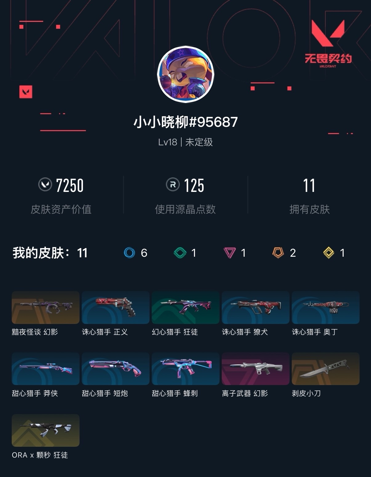 【无畏契约】【yhwww7072】等级:21,已用无畏点7250,已用源晶点125,橙皮:幻影-黯夜怪谈|近战-剥皮小刀__紫皮:幻影-离子武器__段位:未定级__英雄:尚勃勒|暮蝶|盖可|霓虹|壹决|炼狱|贤者|猎枭|芮娜|捷风|不死鸟__蓝皮:蜂刺-甜心猎手|短炮-甜心猎手|莽侠-甜心猎手|戍卫-甜心猎手|正义-诛心猎手|獠犬-诛心猎手|奥丁-诛心猎手__绿皮:狂徒-幻心猎手__金皮:狂徒-a x 颗秒