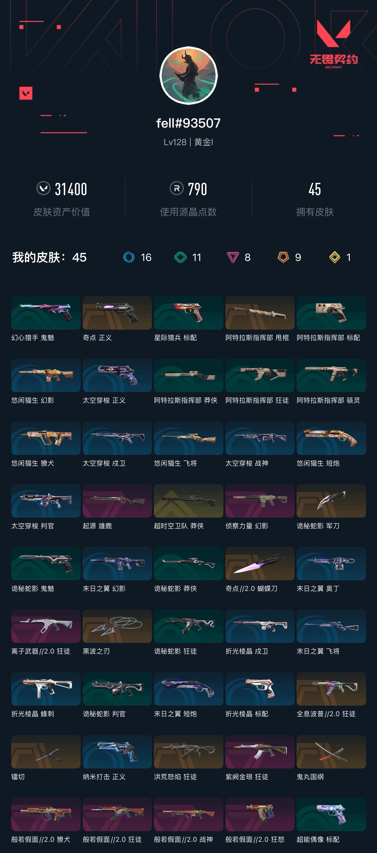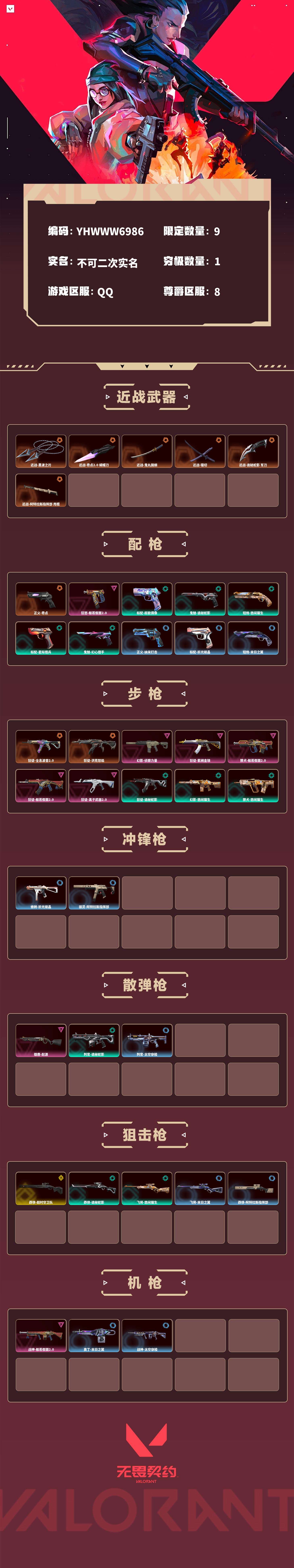 【无畏契约】【yhwww6986】等级:131,已用无畏点31400,已用源晶点790,橙皮:近战-黑波之刃|狂徒-全息波普2.0|狂徒-洪荒怒焰|正义-奇点|近战-奇点2.0 蝴蝶刀|近战-鬼丸国纲|近战-镭切|近战-诡秘蛇影 军刀|近战-阿特拉斯指挥部 甩棍__紫皮:幻影-侦察力量|狂徒-紫阙金琅|雄鹿-起源|战神-般若假面2.0|獠犬-般若假面2.0|狂徒-般若假面2.0|狂怒-般若假面2.0|狂徒-离子武器2.0__段位:白银__蓝皮:正义-纳米打击|蜂刺-折光棱晶|戍卫-折光棱晶|标配-折光棱晶|飞将-末日之翼|幻影-末日之翼|短炮-末日之翼|奥丁-末日之翼|正义-太空穿梭|战神-太空穿梭|判官-太空穿梭|戍卫-太空穿梭|骇灵-阿特拉斯指挥部|莽侠-阿特拉斯指挥部|标配-阿特拉斯指挥部|狂徒-阿特拉斯指挥部__绿皮:标配-超能偶像|判官-诡秘蛇影|鬼魅-诡秘蛇影|莽侠-诡秘蛇影|狂徒-诡秘蛇影|短炮-悠闲猫生|飞将-悠闲猫生|幻影-悠闲猫生|獠犬-悠闲猫生|标配-星际猎兵|鬼魅-幻心猎手__金皮:莽侠-超时空卫队__英雄:尚勃勒|维斯|暮蝶|盖可|霓虹|壹决|k/o|幽影|夜露|钢锁|奇乐|炼狱|铁臂|贤者|猎枭|钛狐|芮娜|零|捷风|蝰蛇|不死鸟|幻棱|雷兹|禁灭