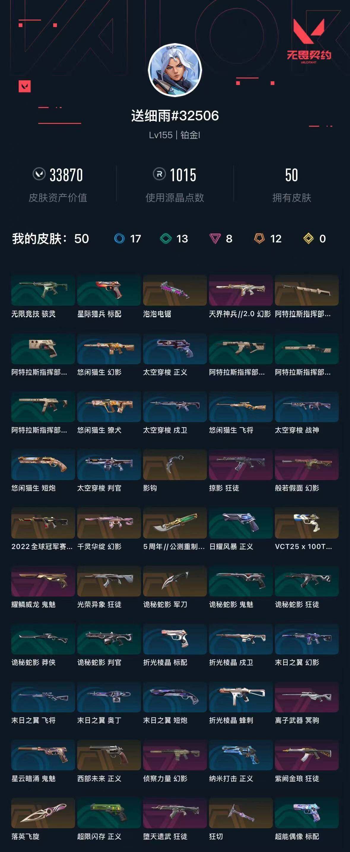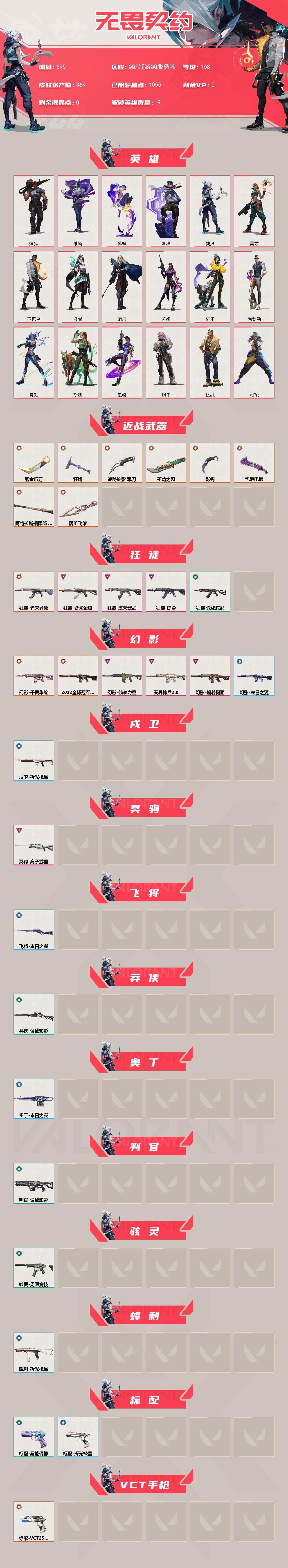 [14566880]【英雄】:幻棱,炼狱,维斯,暮蝶,钛狐,壹决,捷风,雷兹,不死鸟,贤者,猎枭,芮娜,奇乐,尚勃勒,霓虹,斯凯,星礈,钢锁 【近战 武器】:近战武器-泡泡电锯,近战武器-影钩,近战武器-5周年//公测重制版 苍龙之刃,近战武器-紫金爪刀,近战武器-落英飞旋,近战武器-狂切,近战武器-诡秘蛇影 军刀,近战武器-阿特拉斯指挥部 甩棍 【狂徒】:狂徒-光荣异象,狂徒-堕天遗武,狂徒-掠影,狂徒-紫阙金琅,狂徒-诡秘蛇影 【幻影】:幻影-2022全球冠军赛,幻影-千灵华绽,幻影-般若假面,幻影-天界神兵//2.0,幻影-侦察力量,幻影-末日之翼 【戍卫】:戍卫-折光棱晶 【冥驹】:冥驹-离子武器 【飞将】:飞将-末日之翼 【莽侠】:莽侠-诡秘蛇影 【奥丁】:奥丁-末日之翼 【判官】:判官-诡秘蛇影 【骇灵】:骇灵-无限竞技 【蜂刺】:蜂刺-折光棱晶 【标配】:标配-超能偶像,标配-折光棱晶 【vct手呛】:标配-vct25 x 100t 【正义】:正义-西部未来,正义-超限闪存,正义-纳米打击 【鬼魅】:鬼魅-耀鳞威龙,鬼魅-诡秘蛇影,鬼魅-星云暗涌 【短炮】:短炮-末日之翼 【卡面】:终章:激斗汉堡 卡面,进入射程 卡面,激斗汉堡 卡面,《双城之战》拥抱 卡面,精灵大战 卡面,欢迎来到底城 卡面,南瓜盛典 卡面,vct cn首冠 卡面,无畏契约:暮蝶 卡面,排除故障 卡面,修车达人 卡面,热舞环节 卡面,正义的化身 卡面,终章:生意人麦宝 卡面,铁之华 卡面,失而复得 卡面,时间到 卡面,最高舞台 卡面,归乡 // 蝰蛇 卡面,树懒大作战 卡面,声感陷阱设计图 卡面,红鳞松叶 卡面,clutch 卡面,梦幻奶茶 卡面,失控边缘 卡面,无畏契约go!第一卷:芮娜 卡面,复古浪潮 卡面,清除名单 卡面,无畏契约go!第一卷:零 卡面,无垠星环 卡面,《双城之战》金克丝 卡面,势不可挡//盖可 卡面,无畏契约go!第一卷:贤者 卡面,纪念照 p2 卡面,钢锁vs盖可 卡面,天台狂欢 卡面,代号红色 卡面,新兵报到 卡面,v契约 卡面,无畏契约 卡面 【喷漆】:嗨宝南瓜灯 喷漆,嘭! 喷漆,都算到了 喷漆,控场勿近 喷漆,伤心心 喷漆,小丑猫 喷漆,熊抱 喷漆,蛋糕还是爆能器? 喷漆,超级粉丝 喷漆,捷风差距 喷漆,惊声尖叫 喷漆,2021冠军巡回赛花火 喷漆,拼一呛 喷漆,新潮