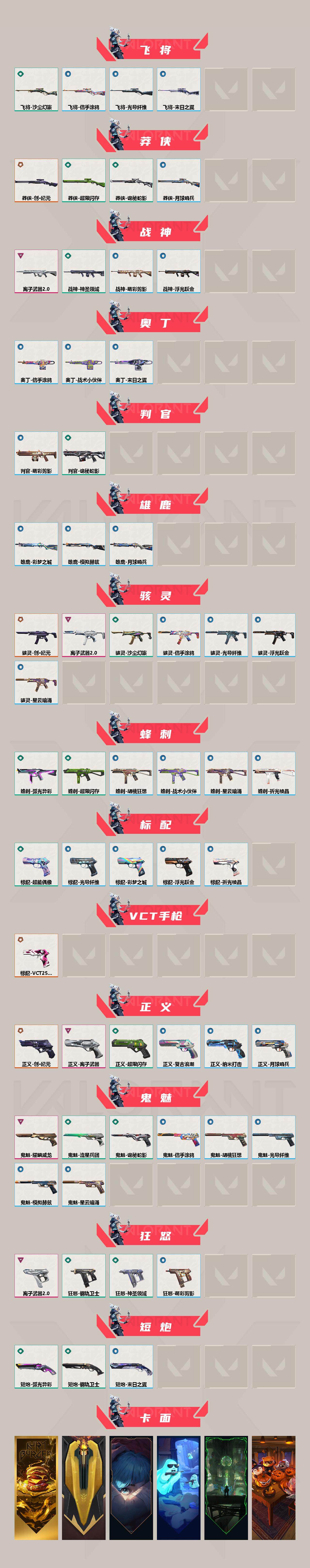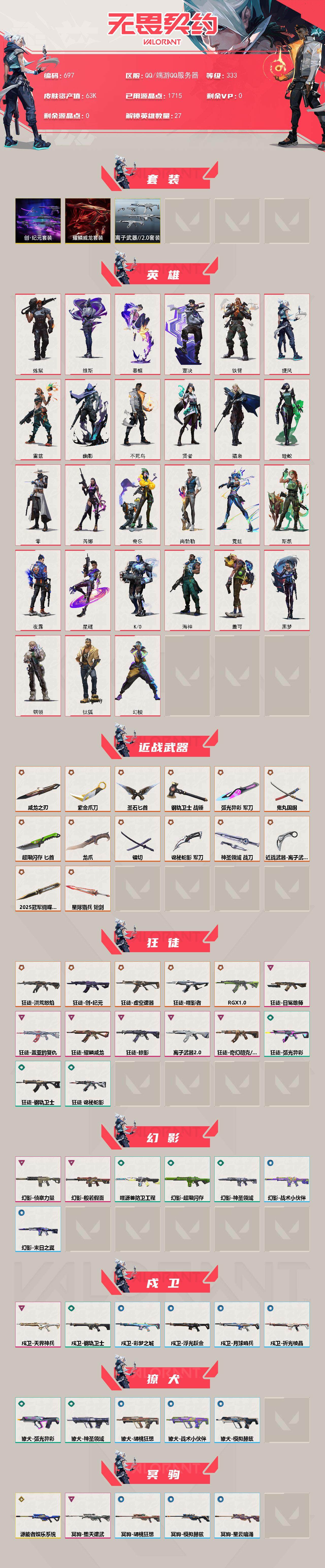 [14566989]【套装】:创·纪元套装,耀鳞威龙套装,离子武器//2.0套装 【英雄】:幻棱,炼狱,维斯,暮蝶,钛狐,壹决,铁臂,捷风,雷兹,幽影,不死鸟,贤者,猎枭,蝰蛇,零,芮娜,奇乐,尚勃勒,霓虹,斯凯,夜露,星礈,k/o,海神,盖可,黑梦,钢锁 【近战 武器】:近战武器-2025全球冠军赛 蝴蝶刀,近战武器-紫金爪刀,近战武器-镭切,近战武器-威龙之刃,近战武器-鬼丸国纲,近战武器-离子武器//2.0 爪刀,近战武器-龙爪,近战武器-超限闪存 匕首,近战武器-钢轨卫士 战锤,近战武器-弧光异彩 军刀,近战武器-圣石匕首,近战武器-诡秘蛇影 军刀,近战武器-神圣领域 战刀,近战武器-星际猎兵 短剑 【狂徒】:狂徒-洪荒怒焰,狂徒-创·纪元,狂徒-虚空遗器,狂徒-噬影者,狂徒-rgx 11z pro,狂徒-掠影,狂徒-盖亚的复仇,狂徒-日冕雄师,狂徒-耀鳞威龙,狂徒-离子武器//2.0,狂徒-奇幻朋克//3.0,狂徒-钢轨卫士,狂徒-弧光异彩,狂徒-诡秘蛇影 【幻影】:幻影-般若假面,幻影-侦察力量,幻影-超限闪存,幻影-噬源兽防卫工程,幻影-神圣领域,幻影-战术小伙伴,幻影-末日之翼 【戍卫】:戍卫-天界神兵,戍卫-钢轨卫士,戍卫-彩梦之城,戍卫-浮光跃金,戍卫-月球哨兵,戍卫-折光棱晶 【獠犬】:獠犬-弧光异彩,獠犬-神圣领域,獠犬-胡桃狂想,獠犬-模拟赫兹,獠犬-战术小伙伴 【冥驹】:冥驹-源能者娱乐系统,冥驹-堕天遗武,冥驹-胡桃狂想,冥驹-模拟赫兹,冥驹-星云暗涌 【飞将】:飞将-沙尘幻旅,飞将-信手涂鸦,飞将-光导纤维,飞将-末日之翼 【莽侠】:莽侠-创·纪元,莽侠-超限闪存,莽侠-诡秘蛇影,莽侠-月球哨兵 【战神】:战神-离子武器//2.0,战神-神圣领域,战神-浮光跃金,战神-萌彩剪影 【奥丁】:奥丁-信手涂鸦,奥丁-战术小伙伴,奥丁-末日之翼 【判官】:判官-诡秘蛇影,判官-萌彩剪影 【雄鹿】:雄鹿-彩梦之城,雄鹿-模拟赫兹,雄鹿-月球哨兵 【骇灵】:骇灵-创·纪元,骇灵-离子武器//2.0,骇灵-沙尘幻旅,骇灵-浮光跃金,骇灵-光导纤维,骇灵-信手涂鸦,骇灵-星云暗涌 【蜂刺】:蜂刺-超限闪存,蜂刺-弧光异彩,蜂刺-胡桃狂想,蜂刺-战术小伙伴,蜂刺-星云暗涌,蜂刺-折光棱晶 【标配】:标配-超能偶像,标配-彩梦之城,标配-浮光跃金,标配-光导纤维,标配-折