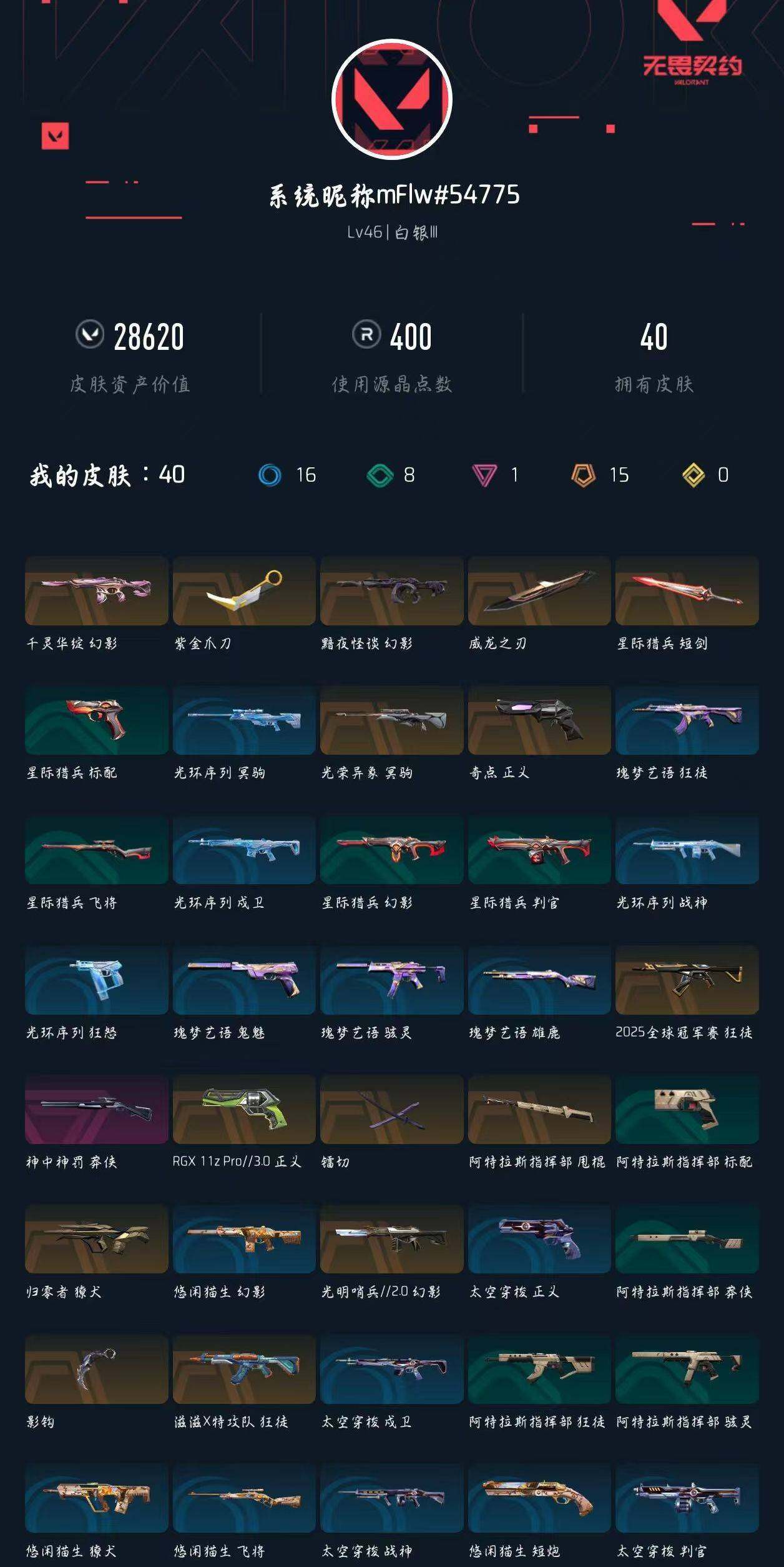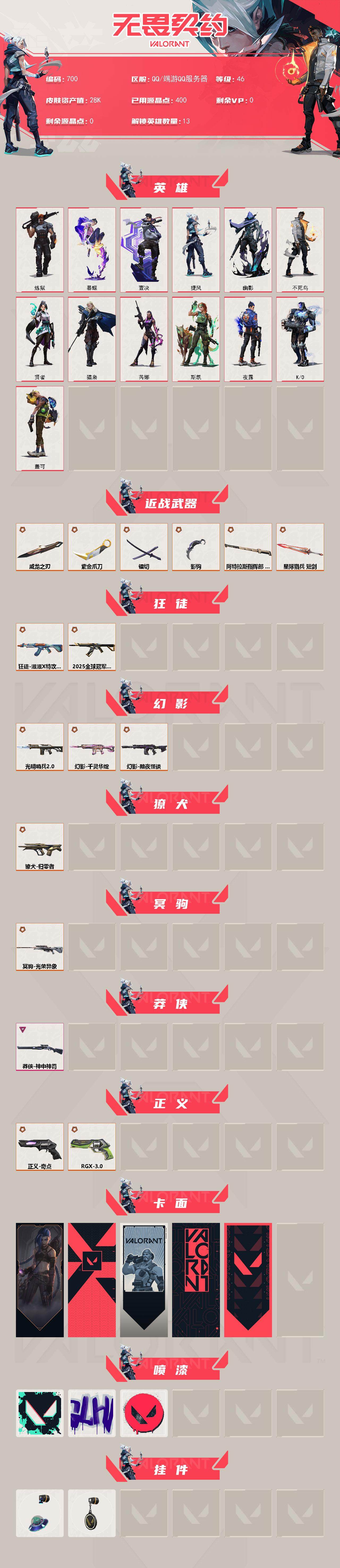 [14567303]【英雄】:炼狱,暮蝶,壹决,捷风,幽影,不死鸟,贤者,猎枭,芮娜,斯凯,夜露,k/o,盖可 【近战 武器】:近战武器-影钩,近战武器-紫金爪刀,近战武器-镭切,近战武器-威龙之刃,近战武器-阿特拉斯指挥部 甩棍,近战武器-星际猎兵 短剑 【狂徒】:狂徒-2025全球冠军赛,狂徒-滋滋x特攻队 【幻影】:幻影-黯夜怪谈,幻影-光明哨兵//2.0,幻影-千灵华绽 【獠犬】:獠犬-归零者 【冥驹】:冥驹-光荣异象 【莽侠】:莽侠-神中神罚 【正义】:正义-rgx 11z pro//3.0,正义-奇点 【卡面】:《双城之战》金克丝 卡面,代号红色 卡面,新兵报到 卡面,v契约 卡面,无畏契约 卡面 【喷漆】:胜利属于无畏契约 喷漆,glhf 喷漆,无畏契约 喷漆 【挂饰】:天外飞客 挂饰,无畏契约 纪念币 挂饰