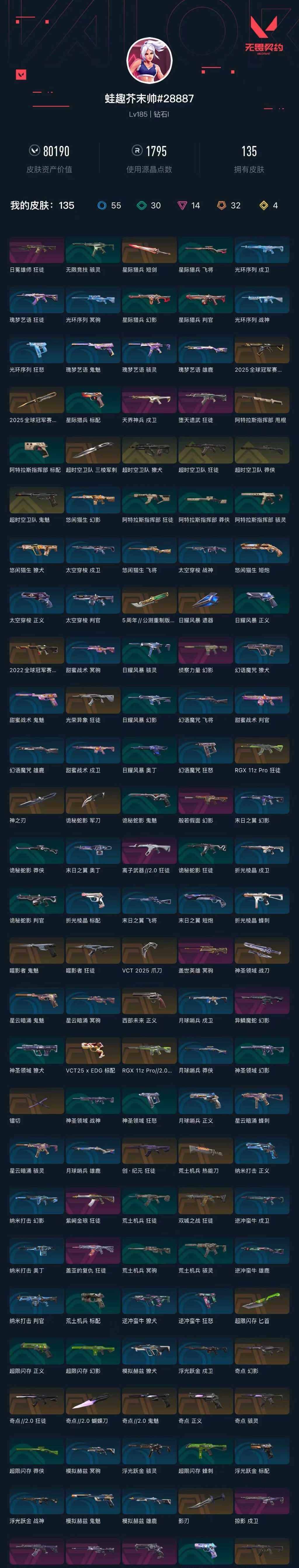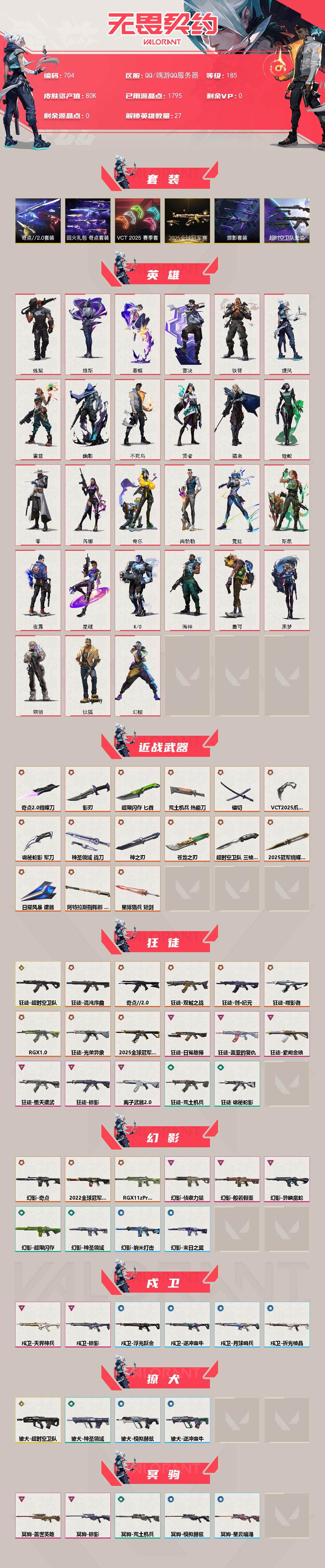 [14567500]【套装】:2025全球冠军赛套装,超时空卫队套装,vct 2025 赛季套装,奇点//2.0套装,回火礼包:奇点套装,掠影套装 【英雄】:幻棱,炼狱,维斯,暮蝶,钛狐,壹决,铁臂,捷风,雷兹,幽影,不死鸟,贤者,猎枭,蝰蛇,零,芮娜,奇乐,尚勃勒,霓虹,斯凯,夜露,星礈,k/o,海神,盖可,黑梦,钢锁 【近战 武器】:近战武器-2025全球冠军赛 蝴蝶刀,近战武器-超时空卫队 三棱军刺,近战武器-5周年//公测重制版 苍龙之刃,近战武器-神之刃,近战武器-奇点//2.0 蝴蝶刀,近战武器-vct 2025 爪刀,近战武器-镭切,近战武器-超限闪存 匕首,近战武器-荒土机兵 热能刀,近战武器-影刃,近战武器-诡秘蛇影 军刀,近战武器-神圣领域 战刀,近战武器-日耀风暴 遗器,近战武器-阿特拉斯指挥部 甩棍,近战武器-星际猎兵 短剑 【狂徒】:狂徒-超时空卫队,狂徒-2025全球冠军赛,狂徒-混沌序曲,狂徒-奇点//2.0,狂徒-双城之战,狂徒-创·纪元,狂徒-噬影者,狂徒-rgx 11z pro,狂徒-光荣异象,狂徒-堕天遗武,狂徒-掠影,狂徒-盖亚的复仇,狂徒-日冕雄师,狂徒-紫阙金琅,狂徒-离子武器//2.0,狂徒-荒土机兵,狂徒-诡秘蛇影 【幻影】:幻影-2022全球冠军赛,幻影-奇点,幻影-rgx 11z pro//2.0,幻影-般若假面,幻影-侦察力量,幻影-异鳞魔蛇,幻影-超限闪存,幻影-神圣领域,幻影-纳米打击,幻影-末日之翼 【戍卫】:戍卫-掠影,戍卫-天界神兵,戍卫-浮光跃金,戍卫-逆冲蛮牛,戍卫-月球哨兵,戍卫-折光棱晶 【獠犬】:獠犬-超时空卫队,獠犬-神圣领域,獠犬-模拟赫兹,獠犬-逆冲蛮牛 【冥驹】:冥驹-掠影,冥驹-盖世英雄,冥驹-荒土机兵,冥驹-模拟赫兹,冥驹-星云暗涌 【飞将】:飞将-末日之翼 【莽侠】:莽侠-超时空卫队,莽侠-超限闪存,莽侠-诡秘蛇影,莽侠-月球哨兵 【战神】:战神-神圣领域,战神-浮光跃金 【奥丁】:奥丁-纳米打击,奥丁-末日之翼 【判官】:判官-诡秘蛇影,判官-纳米打击x 【雄鹿】:雄鹿-模拟赫兹,雄鹿-逆冲蛮牛,雄鹿-月球哨兵 【骇灵】:骇灵-奇点,骇灵-荒土机兵,骇灵-无限竞技,骇灵-浮光跃金,骇灵-星云暗涌 【蜂刺】:蜂刺-超限闪存,蜂刺-星云暗涌,蜂刺-折光棱晶 【标配】:标配-超能偶像,标配-荒土机兵,