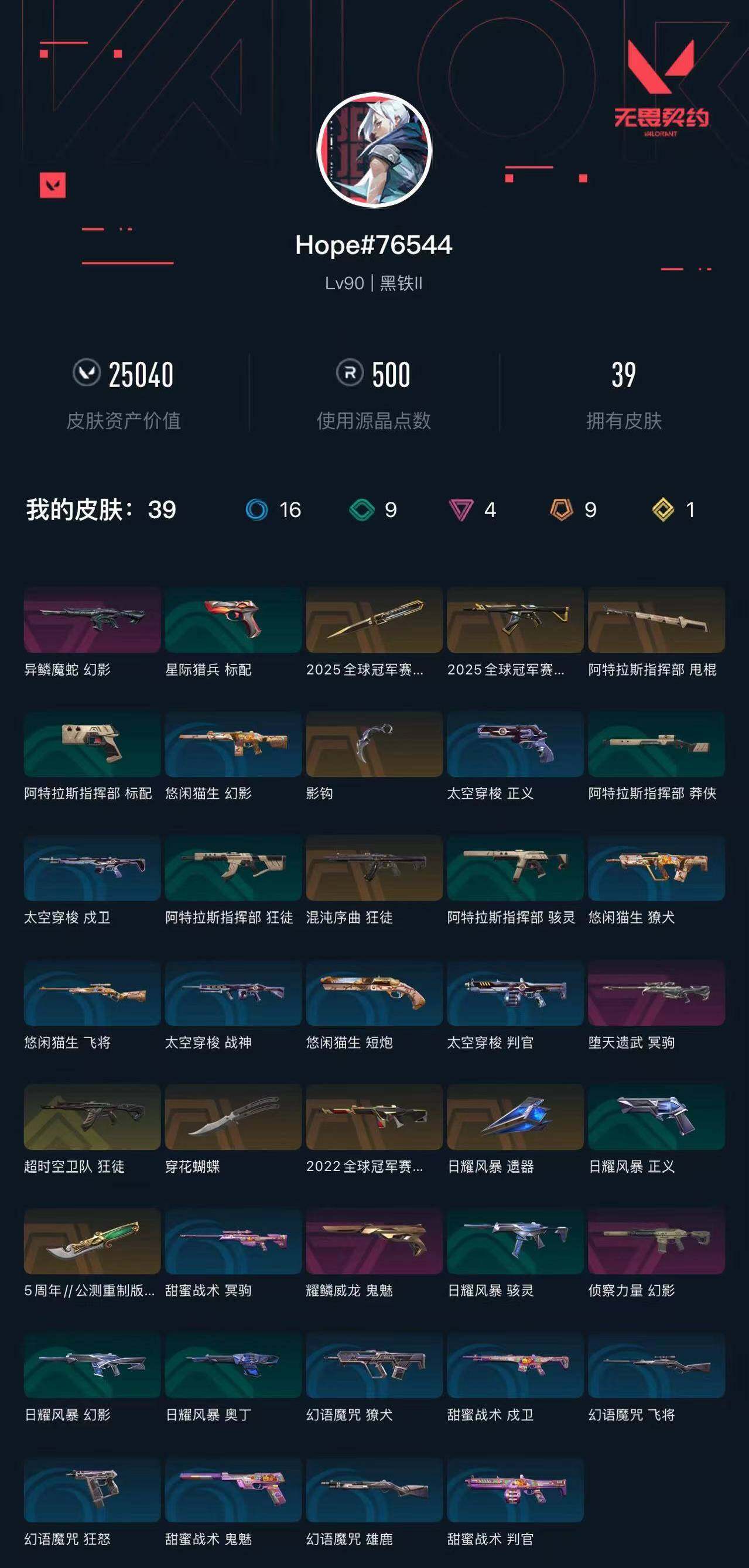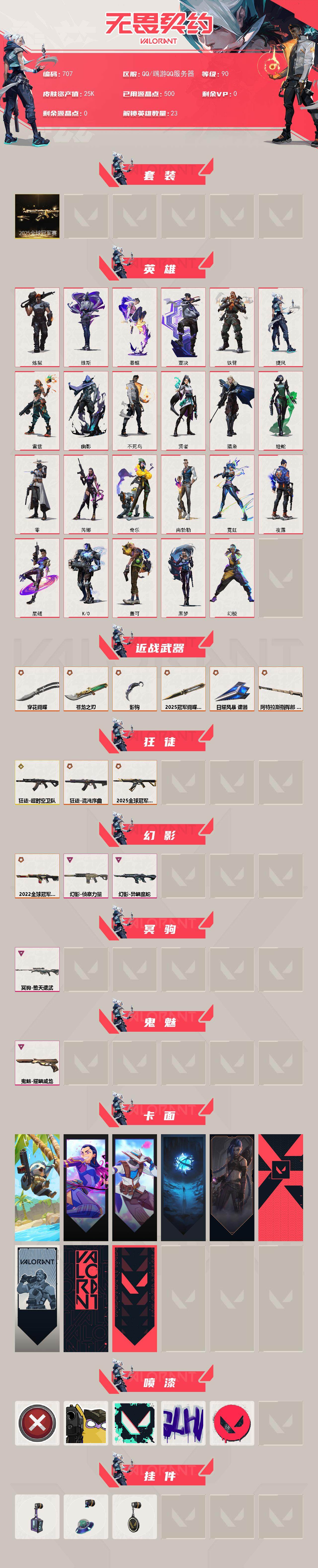 [14567718]【套装】:2025全球冠军赛套装 【英雄】:幻棱,炼狱,维斯,暮蝶,壹决,铁臂,捷风,雷兹,幽影,不死鸟,贤者,猎枭,蝰蛇,零,芮娜,奇乐,尚勃勒,霓虹,夜露,星礈,k/o,盖可,黑梦 【近战 武器】:近战武器-2025全球冠军赛 蝴蝶刀,近战武器-影钩,近战武器-5周年//公测重制版 苍龙之刃,近战武器-穿花蝴蝶,近战武器-日耀风暴 遗器,近战武器-阿特拉斯指挥部 甩棍 【狂徒】:狂徒-超时空卫队,狂徒-2025全球冠军赛,狂徒-混沌序曲 【幻影】:幻影-2022全球冠军赛,幻影-侦察力量,幻影-异鳞魔蛇 【冥驹】:冥驹-堕天遗武 【鬼魅】:鬼魅-耀鳞威龙 【卡面】:树懒大作战 卡面,无畏契约go!第一卷:芮娜 卡面,无畏契约go!第一卷:零 卡面,无垠星环 卡面,《双城之战》金克丝 卡面,代号红色 卡面,新兵报到 卡面,v契约 卡面,无畏契约 卡面 【喷漆】:买装还是存钱 喷漆,放下武器 喷漆,胜利属于无畏契约 喷漆,glhf 喷漆,无畏契约 喷漆 【挂饰】:动力机箱 挂饰,天外飞客 挂饰,无畏契约 纪念币 挂饰