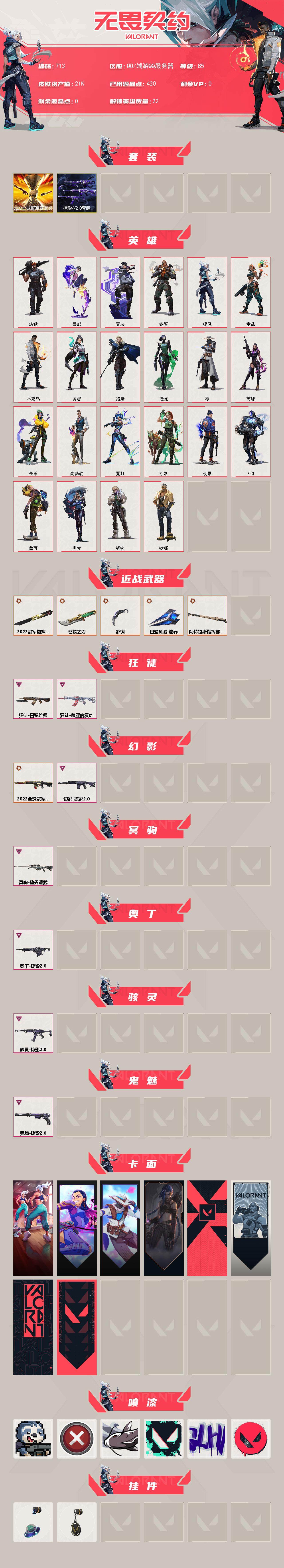 [14568031]【套装】:2022全球冠军赛套装,掠影//2.0套装 【英雄】:炼狱,暮蝶,钛狐,壹决,铁臂,捷风,雷兹,不死鸟,贤者,猎枭,蝰蛇,零,芮娜,奇乐,尚勃勒,霓虹,斯凯,夜露,k/o,盖可,黑梦,钢锁 【近战 武器】:近战武器-2022全球冠军赛 蝴蝶刀,近战武器-影钩,近战武器-5周年//公测重制版 苍龙之刃,近战武器-日耀风暴 遗器,近战武器-阿特拉斯指挥部 甩棍 【狂徒】:狂徒-盖亚的复仇,狂徒-日冕雄师 【幻影】:幻影-2022全球冠军赛,幻影-掠影//2.0 【冥驹】:冥驹-堕天遗武 【奥丁】:奥丁-掠影//2.0 【骇灵】:骇灵-掠影//2.0 【鬼魅】:鬼魅-掠影//2.0 【卡面】:热舞环节 卡面,无畏契约go!第一卷:芮娜 卡面,无畏契约go!第一卷:零 卡面,《双城之战》金克丝 卡面,代号红色 卡面,新兵报到 卡面,v契约 卡面,无畏契约 卡面 【喷漆】:审判之爪 喷漆,买装还是存钱 喷漆,松叶 喷漆,胜利属于无畏契约 喷漆,glhf 喷漆,无畏契约 喷漆 【挂饰】:天外飞客 挂饰,无畏契约 纪念币 挂饰