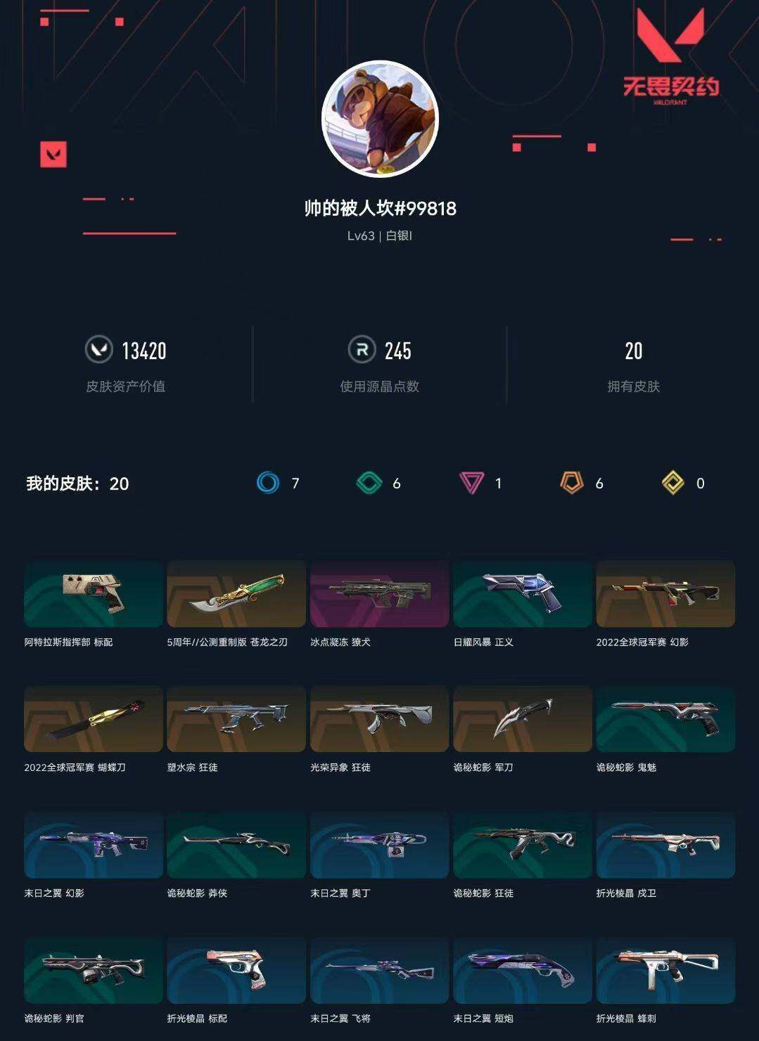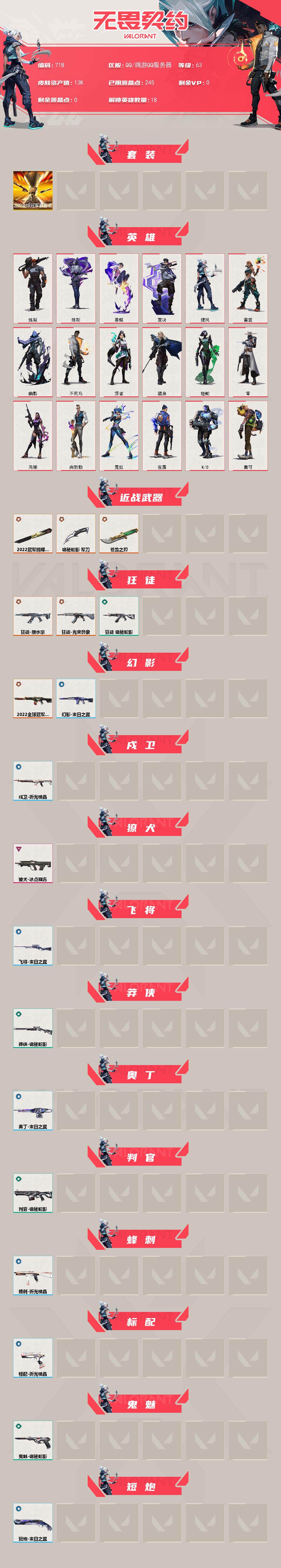 [14568273]【套装】:2022全球冠军赛套装 【英雄】:炼狱,维斯,暮蝶,壹决,捷风,雷兹,幽影,不死鸟,贤者,猎枭,蝰蛇,零,芮娜,尚勃勒,霓虹,夜露,k/o,盖可 【近战 武器】:近战武器-2022全球冠军赛 蝴蝶刀,近战武器-5周年//公测重制版 苍龙之刃,近战武器-诡秘蛇影 军刀 【狂徒】:狂徒-塑水宗,狂徒-光荣异象,狂徒-诡秘蛇影 【幻影】:幻影-2022全球冠军赛,幻影-末日之翼 【戍卫】:戍卫-折光棱晶 【獠犬】:獠犬-冰点凝冻 【飞将】:飞将-末日之翼 【莽侠】:莽侠-诡秘蛇影 【奥丁】:奥丁-末日之翼 【判官】:判官-诡秘蛇影 【蜂刺】:蜂刺-折光棱晶 【标配】:标配-折光棱晶 【鬼魅】:鬼魅-诡秘蛇影 【短炮】:短炮-末日之翼 【卡面】:南瓜盛典 卡面,正义的化身 卡面,clutch 卡面,梦幻奶茶 卡面,无畏契约go!第一卷:芮娜 卡面,无畏契约go!第一卷:零 卡面,《双城之战》金克丝 卡面,代号红色 卡面,新兵报到 卡面,v契约 卡面,无畏契约 卡面 【喷漆】:买装还是存钱 喷漆,暴走萝莉 喷漆,胜利属于无畏契约 喷漆,glhf 喷漆,无畏契约 喷漆 【挂饰】:第九季//第一幕 纪念币 挂饰,天外飞客 挂饰,海豹的认可 挂饰,无畏契约 纪念币 挂饰
