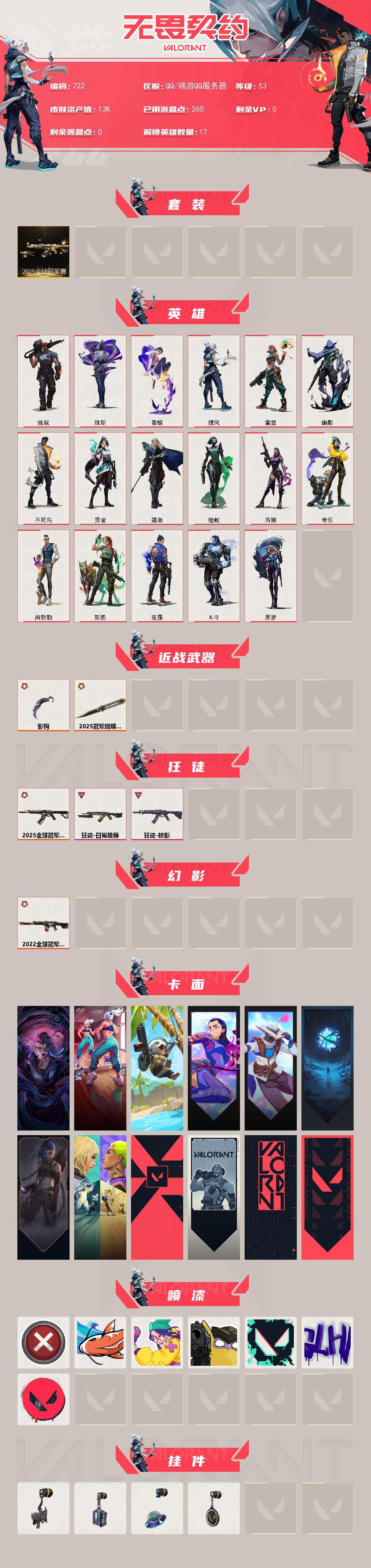 [14568362]【套装】:2025全球冠军赛套装 【英雄】:炼狱,维斯,暮蝶,捷风,雷兹,幽影,不死鸟,贤者,猎枭,蝰蛇,芮娜,奇乐,尚勃勒,斯凯,夜露,k/o,黑梦 【近战 武器】:近战武器-2025全球冠军赛 蝴蝶刀,近战武器-影钩 【狂徒】:狂徒-2025全球冠军赛,狂徒-掠影,狂徒-日冕雄师 【幻影】:幻影-2022全球冠军赛 【卡面】:分崩离析 卡面,热舞环节 卡面,树懒大作战 卡面,无畏契约go!第一卷:芮娜 卡面,无畏契约go!第一卷:零 卡面,无垠星环 卡面,《双城之战》金克丝 卡面,钢锁vs盖可 卡面,代号红色 卡面,新兵报到 卡面,v契约 卡面,无畏契约 卡面 【喷漆】:买装还是存钱 喷漆,红鳞 喷漆,无畏契约go!第一卷:奇乐 喷漆,放下武器 喷漆,胜利属于无畏契约 喷漆,glhf 喷漆,无畏契约 喷漆 【挂饰】:鱼骨头 挂饰,动力机箱 挂饰,天外飞客 挂饰,无畏契约 纪念币 挂饰