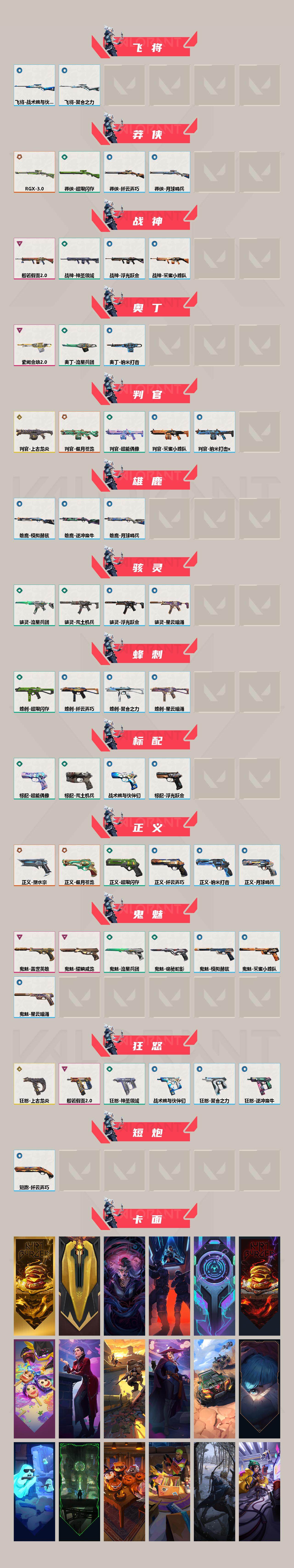 [14572879]【套装】:上古龙炎套装,滋滋x特攻队套装,般若假面//2.0套装 【英雄】:幻棱,炼狱,维斯,暮蝶,钛狐,壹决,铁臂,捷风,雷兹,幽影,不死鸟,贤者,猎枭,蝰蛇,零,芮娜,奇乐,尚勃勒,霓虹,斯凯,夜露,星礈,k/o,海神,盖可,黑梦,钢锁 【近战 武器】:近战武器-嘟昂嘟昂超弹力水球拳套,近战武器-rgx 11z pro//3.0 爪刀,近战武器-夜之蝴蝶,近战武器-鬼丸国纲,近战武器-龙爪,近战武器-流星兵团 短剑,近战武器-超能偶像 应援棒,近战武器-超限闪存 匕首,近战武器-荒土机兵 热能刀,近战武器-神圣领域 战刀,近战武器-阿特拉斯指挥部 甩棍 【狂徒】:狂徒-艾沃莉的梦之翼,狂徒-上古龙炎,狂徒-洪荒怒焰,狂徒-机动狂飙,狂徒-塑水宗,狂徒-偃月苍龙,狂徒-滋滋x特攻队,狂徒-般若假面//2.0,狂徒-盖世英雄,狂徒-盖亚的复仇,狂徒-海洋之星,狂徒-耀鳞威龙,狂徒-紫阙金琅,狂徒-超能偶像,狂徒-荒土机兵,狂徒-流星兵团 【幻影】:幻影-源能者娱乐系统,幻影-2022全球冠军赛,幻影-赛博迷城,幻影-超限闪存,幻影-神圣领域,幻影-聚合之力,幻影-纳米打击 【戍卫】:戍卫-破败军械,戍卫-超能偶像,戍卫-浮光跃金,戍卫-逆冲蛮牛,戍卫-战术熊与伙伴们,戍卫-月球哨兵 【獠犬】:獠犬-般若假面//2.0,獠犬-神圣领域,獠犬-采蜜小蜂队,獠犬-模拟赫兹,獠犬-逆冲蛮牛 【冥驹】:冥驹-上古龙炎,冥驹-千灵华绽,冥驹-偃月苍龙,冥驹-滋滋x特攻队,冥驹-荒土机兵,冥驹-模拟赫兹,冥驹-星云暗涌 【飞将】:飞将-聚合之力,飞将-战术熊与伙伴们 【莽侠】:莽侠-rgx 11z pro//3.0,莽侠-超限闪存,莽侠-纤云弄巧,莽侠-月球哨兵 【战神】:战神-般若假面//2.0,战神-神圣领域,战神-采蜜小蜂队,战神-浮光跃金 【奥丁】:奥丁-紫阙金琅//2.0,奥丁-流星兵团,奥丁-纳米打击 【判官】:判官-上古龙炎,判官-偃月苍龙,判官-超能偶像,判官-采蜜小蜂队,判官-纳米打击x 【雄鹿】:雄鹿-模拟赫兹,雄鹿-逆冲蛮牛,雄鹿-月球哨兵 【骇灵】:骇灵-荒土机兵,骇灵-流星兵团,骇灵-浮光跃金,骇灵-星云暗涌 【蜂刺】:蜂刺-超限闪存,蜂刺-聚合之力,蜂刺-纤云弄巧,蜂刺-星云暗涌 【标配】:标配-超能偶像,标配-荒土机兵,标配-浮光跃金,标配-战术熊