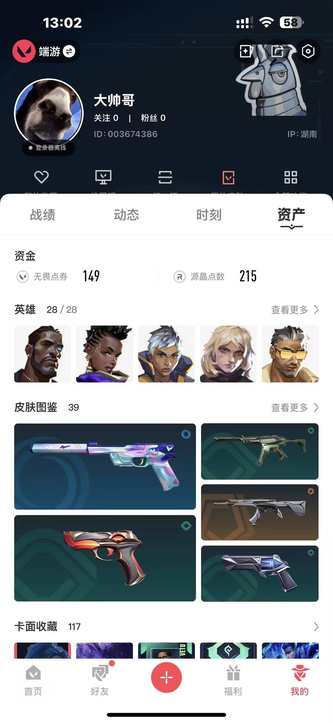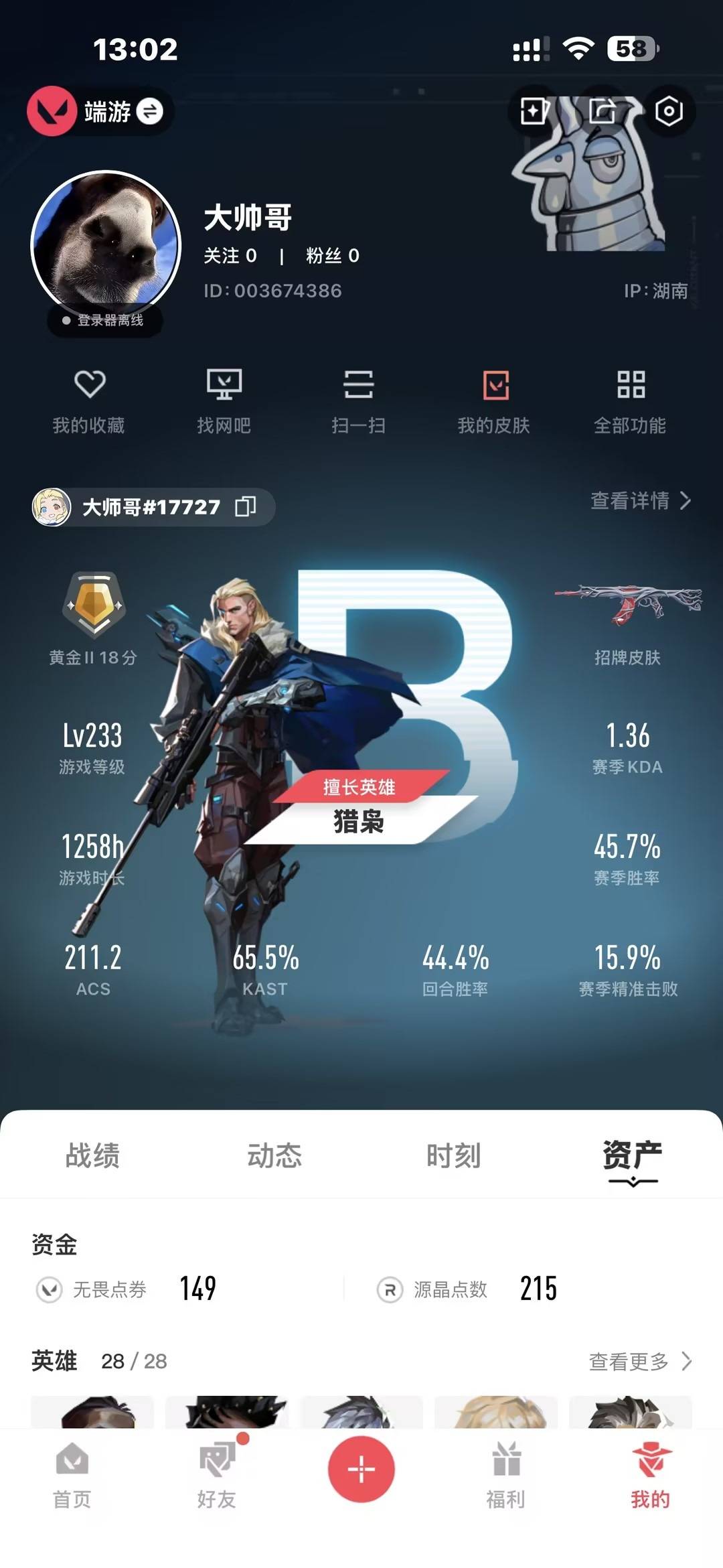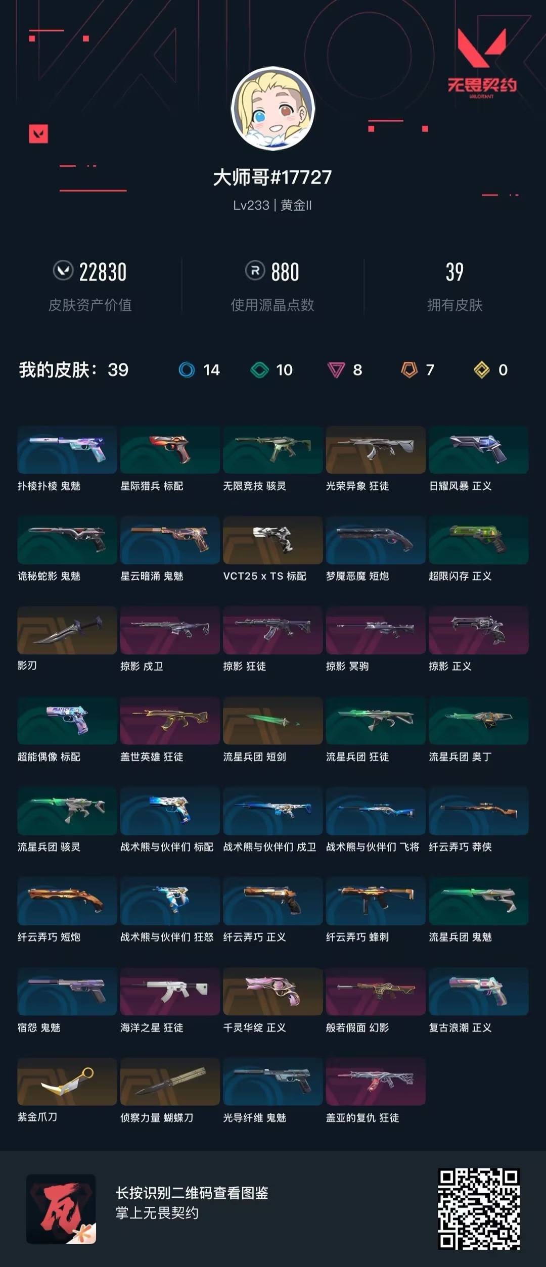 7橙皮 8紫皮 39皮肤 28英雄 117卡面 880已用源晶 黄金段位 【套装】:掠影套装 【近战武器皮肤】:短剑-流星兵团影刃蝴蝶刀-侦察力量紫金爪刀 【佩呛皮肤】:正义-掠影标配-vct25xts正义-千灵华绽 【步呛皮肤】:狂徒-掠影戍卫-掠影狂徒-光荣异象狂徒-海洋之星