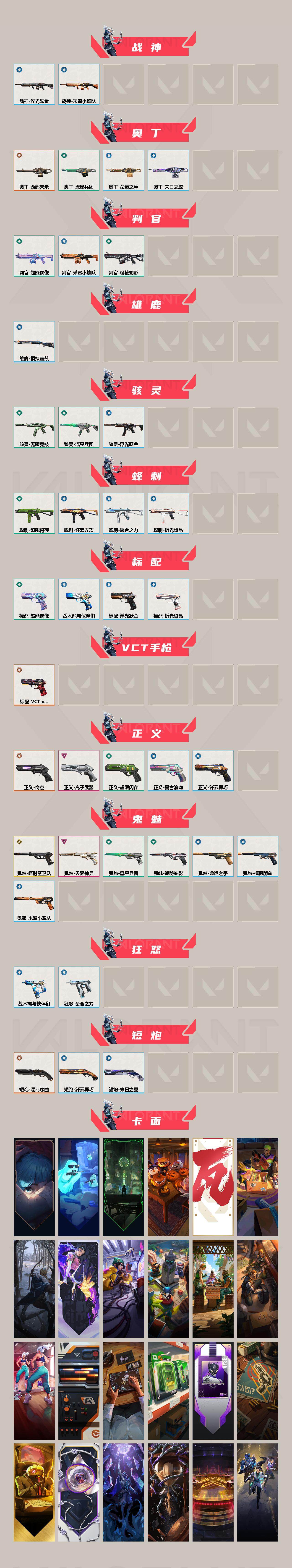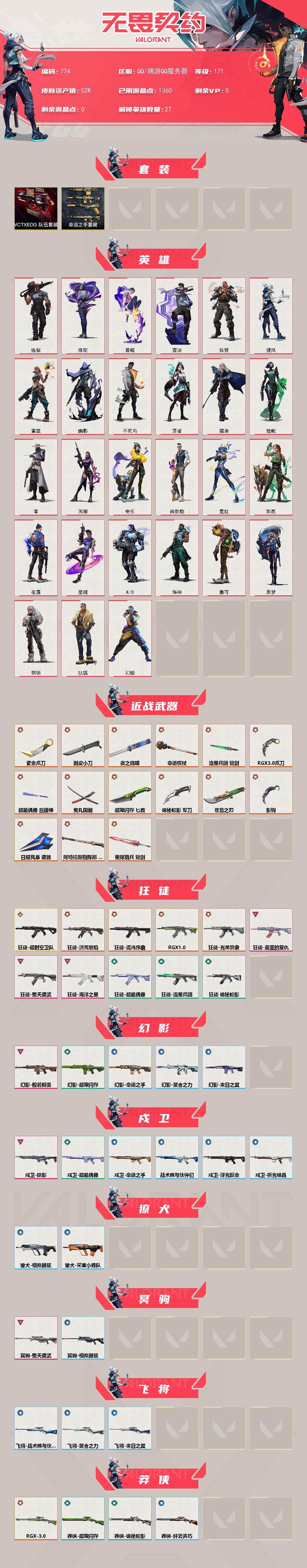 [14576835]【套装】:vctxedg 队伍套装,命运之手套装 【英雄】:幻棱,炼狱,维斯,暮蝶,钛狐,壹决,铁臂,捷风,雷兹,幽影,不死鸟,贤者,猎枭,蝰蛇,零,芮娜,奇乐,尚勃勒,霓虹,斯凯,夜露,星礈,k/o,海神,盖可,黑梦,钢锁 【近战 武器】:近战武器-影钩,近战武器-5周年//公测重制版 苍龙之刃,近战武器-剥皮小刀,近战武器-紫金爪刀,近战武器-rgx 11z pro//3.0 爪刀,近战武器-夜之蝴蝶,近战武器-鬼丸国纲,近战武器-流星兵团 短剑,近战武器-超能偶像 应援棒,近战武器-超限闪存 匕首,近战武器-命运权杖,近战武器-诡秘蛇影 军刀,近战武器-日耀风暴 遗器,近战武器-阿特拉斯指挥部 甩棍,近战武器-星际猎兵 短剑 【狂徒】:狂徒-超时空卫队,狂徒-洪荒怒焰,狂徒-混沌序曲,狂徒-rgx 11z pro,狂徒-光荣异象,狂徒-堕天遗武,狂徒-盖亚的复仇,狂徒-海洋之星,狂徒-超能偶像,狂徒-流星兵团,狂徒-诡秘蛇影 【幻影】:幻影-般若假面,幻影-超限闪存,幻影-聚合之力,幻影-命运之手,幻影-末日之翼 【戍卫】:戍卫-掠影,戍卫-超能偶像,戍卫-浮光跃金,戍卫-命运之手,戍卫-战术熊与伙伴们,戍卫-折光棱晶 【獠犬】:獠犬-采蜜小蜂队,獠犬-模拟赫兹 【冥驹】:冥驹-堕天遗武,冥驹-模拟赫兹 【飞将】:飞将-聚合之力,飞将-战术熊与伙伴们,飞将-末日之翼 【莽侠】:莽侠-rgx 11z pro//3.0,莽侠-超限闪存,莽侠-诡秘蛇影,莽侠-纤云弄巧 【战神】:战神-采蜜小蜂队,战神-浮光跃金 【奥丁】:奥丁-西部未来,奥丁-流星兵团,奥丁-命运之手,奥丁-末日之翼 【判官】:判官-超能偶像,判官-诡秘蛇影,判官-采蜜小蜂队 【雄鹿】:雄鹿-模拟赫兹 【骇灵】:骇灵-流星兵团,骇灵-无限竞技,骇灵-浮光跃金 【蜂刺】:蜂刺-超限闪存,蜂刺-聚合之力,蜂刺-纤云弄巧,蜂刺-折光棱晶 【标配】:标配-超能偶像,标配-浮光跃金,标配-战术熊与伙伴们,标配-折光棱晶 【vct手呛】:标配-vct x edg 【正义】:正义-奇点,正义-离子武器,正义-超限闪存,正义-复古浪潮,正义-纤云弄巧 【鬼魅】:鬼魅-超时空卫队,鬼魅-天界神兵,鬼魅-流星兵团,鬼魅-诡秘蛇影,鬼魅-采蜜小蜂队,鬼魅-命运之手,鬼魅-模拟赫兹 【狂怒】:狂怒-聚合之力,狂怒-战术熊
