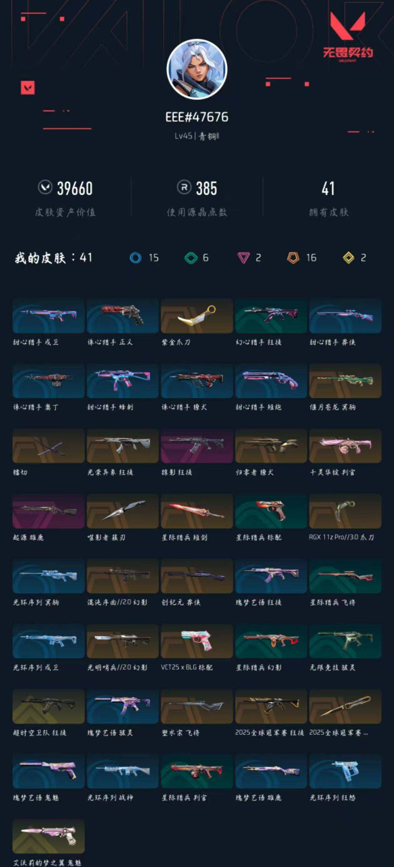 [14577150]【套装】:2025全球冠军赛套装 【英雄】:炼狱,维斯,暮蝶,壹决,捷风,幽影,不死鸟,贤者,猎枭,零,芮娜,尚勃勒,星礈,盖可,黑梦 【近战 武器】:近战武器-2025全球冠军赛 蝴蝶刀,近战武器-紫金爪刀,近战武器-rgx 11z pro//3.0 爪刀,近战武器-噬影者 簇刃,近战武器-镭切,近战武器-星际猎兵 短剑 【狂徒】:狂徒-超时空卫队,狂徒-2025全球冠军赛,狂徒-光荣异象,狂徒-掠影 【幻影】:幻影-光明哨兵//2.0,幻影-混沌序曲//2.0 【獠犬】:獠犬-归零者 【冥驹】:冥驹-偃月苍龙 【飞将】:飞将-塑水宗 【莽侠】:莽侠-创·纪元 【判官】:判官-千灵华绽 【雄鹿】:雄鹿-起源 【骇灵】:骇灵-无限竞技 【vct手呛】:标配-vct25 x blg 【鬼魅】:鬼魅-艾沃莉的梦之翼 【卡面】:无畏契约go!第一卷:芮娜 卡面,无畏契约go!第一卷:零 卡面,钢锁vs盖可 卡面,代号红色 卡面,新兵报到 卡面,v契约 卡面,无畏契约 卡面 【喷漆】:伤心心 喷漆,买装还是存钱 喷漆,胜利属于无畏契约 喷漆,glhf 喷漆,无畏契约 喷漆 【挂饰】:无畏契约go!第一卷 零 挂饰,天外飞客 挂饰,无畏契约 纪念币 挂饰