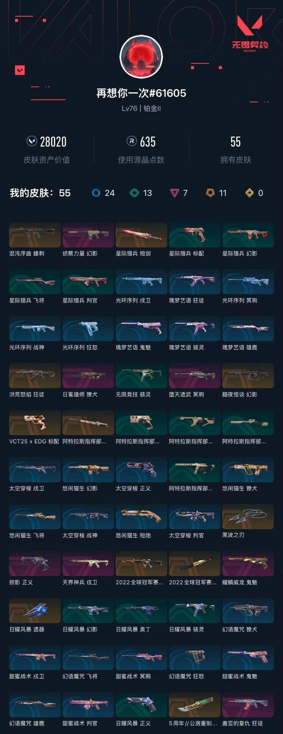 [14577732]【套装】:2022全球冠军赛套装 【英雄】:幻棱,炼狱,维斯,暮蝶,壹决,捷风,不死鸟,贤者,猎枭,蝰蛇,零,芮娜,夜露,盖可 【近战 武器】:近战武器-2022全球冠军赛 蝴蝶刀,近战武器-5周年//公测重制版 苍龙之刃,近战武器-黑波之刃,近战武器-日耀风暴 遗器,近战武器-阿特拉斯指挥部 甩棍,近战武器-星际猎兵 短剑 【狂徒】:狂徒-洪荒怒焰,狂徒-盖亚的复仇 【幻影】:幻影-2022全球冠军赛,幻影-黯夜怪谈,幻影-侦察力量 【戍卫】:戍卫-天界神兵 【獠犬】:獠犬-日冕雄师 【冥驹】:冥驹-堕天遗武 【骇灵】:骇灵-无限竞技 【蜂刺】:蜂刺-混沌序曲 【vct手呛】:标配-vct25 x edg 【正义】:正义-掠影 【鬼魅】:鬼魅-耀鳞威龙 【卡面】:红鳞松叶 卡面,clutch 卡面,无畏契约go!第一卷:芮娜 卡面,无畏契约go!第一卷:零 卡面,《双城之战》金克丝 卡面,钢锁vs盖可 卡面,代号红色 卡面,新兵报到 卡面,v契约 卡面,无畏契约 卡面 【喷漆】:新潮流 喷漆,买装还是存钱 喷漆,关门放狗 喷漆,胜利属于无畏契约 喷漆,glhf 喷漆,无畏契约 喷漆 【挂饰】:猫猫木乃伊 挂饰,无畏契约go!第一卷 零 挂饰,薰衣草之心 挂饰,vct x edg 挂饰,天外飞客 挂饰,红鳞松叶 挂饰,无畏契约 纪念币 挂饰