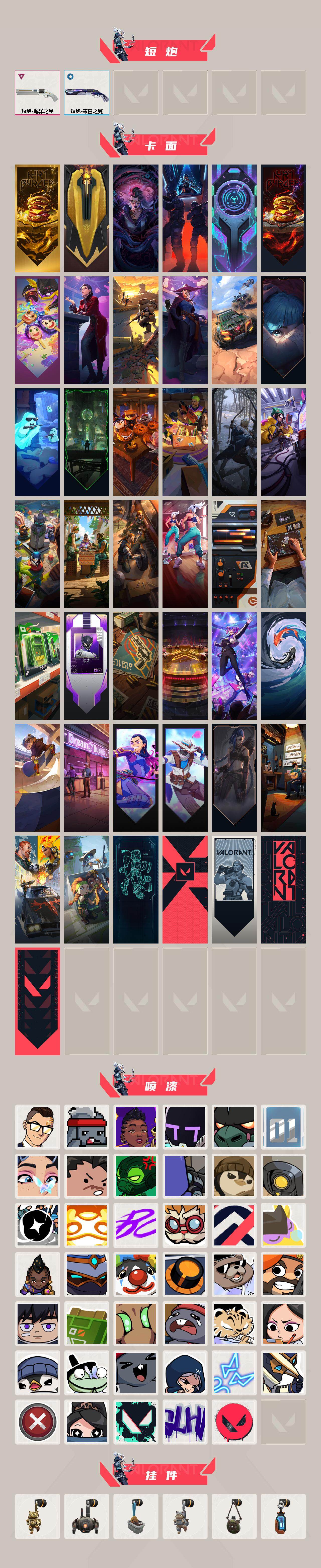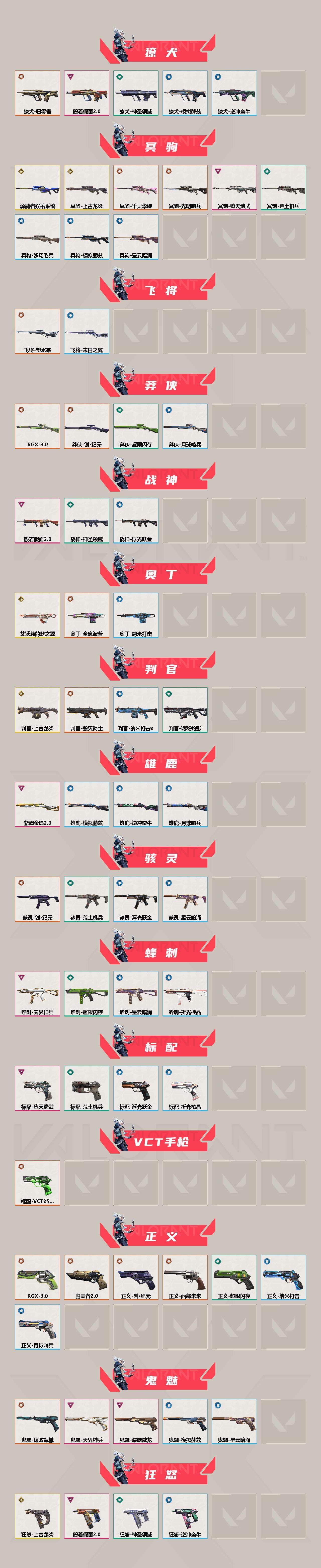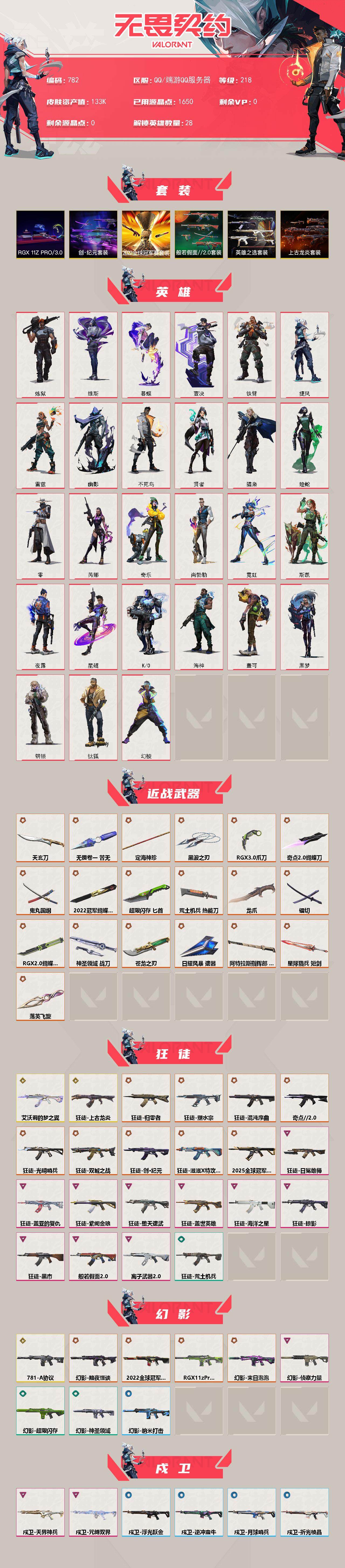 [14578070]【套装】:2022全球冠军赛套装,上古龙炎套装,创·纪元套装,rgx 11z pro//3.0套装,般若假面//2.0套装,英雄之选套装 【英雄】:幻棱,炼狱,维斯,暮蝶,钛狐,壹决,铁臂,捷风,雷兹,幽影,不死鸟,贤者,猎枭,蝰蛇,零,芮娜,奇乐,尚勃勒,霓虹,斯凯,夜露,星礈,k/o,海神,盖可,黑梦,钢锁 【近战 武器】:近战武器-2022全球冠军赛 蝴蝶刀,近战武器-5周年//公测重制版 苍龙之刃,近战武器-无畏契约go!第一卷 苦无,近战武器-rgx 11z pro//2.0 蝴蝶刀,近战武器-奇点//2.0 蝴蝶刀,近战武器-rgx 11z pro//3.0 爪刀,近战武器-黑波之刃,近战武器-落英飞旋,近战武器-镭切,近战武器-鬼丸国纲,近战武器-龙爪,近战武器-超限闪存 匕首,近战武器-定海神珍,近战武器-荒土机兵 热能刀,近战武器-天玄刀,近战武器-神圣领域 战刀,近战武器-日耀风暴 遗器,近战武器-阿特拉斯指挥部 甩棍,近战武器-星际猎兵 短剑 【狂徒】:狂徒-艾沃莉的梦之翼,狂徒-上古龙炎,狂徒-2025全球冠军赛,狂徒-光明哨兵,狂徒-归零者,狂徒-混沌序曲,狂徒-奇点//2.0,狂徒-双城之战,狂徒-塑水宗,狂徒-创·纪元,狂徒-滋滋x特攻队,狂徒-般若假面//2.0,狂徒-堕天遗武,狂徒-掠影,狂徒-盖世英雄,狂徒-盖亚的复仇,狂徒-海洋之星,狂徒-黑市,狂徒-日冕雄师,狂徒-紫阙金琅,狂徒-离子武器//2.0,狂徒-荒土机兵 【幻影】:幻影-781-a协议,幻影-2022全球冠军赛,幻影-黯夜怪谈,幻影-rgx 11z pro//2.0,幻影-末日泡泡,幻影-侦察力量,幻影-超限闪存,幻影-神圣领域,幻影-纳米打击 【戍卫】:戍卫-天界神兵,戍卫-咒缚双界,戍卫-浮光跃金,戍卫-逆冲蛮牛,戍卫-月球哨兵,戍卫-折光棱晶 【獠犬】:獠犬-归零者,獠犬-般若假面//2.0,獠犬-神圣领域,獠犬-模拟赫兹,獠犬-逆冲蛮牛 【冥驹】:冥驹-源能者娱乐系统,冥驹-上古龙炎,冥驹-光明哨兵,冥驹-千灵华绽,冥驹-堕天遗武,冥驹-荒土机兵,冥驹-模拟赫兹,冥驹-沙场老兵,冥驹-星云暗涌 【飞将】:飞将-塑水宗,飞将-末日之翼 【莽侠】:莽侠-rgx 11z pro//3.0,莽侠-创·纪元,莽侠-超限闪存,莽侠-月球哨兵 【战神】:战神-般若假面/