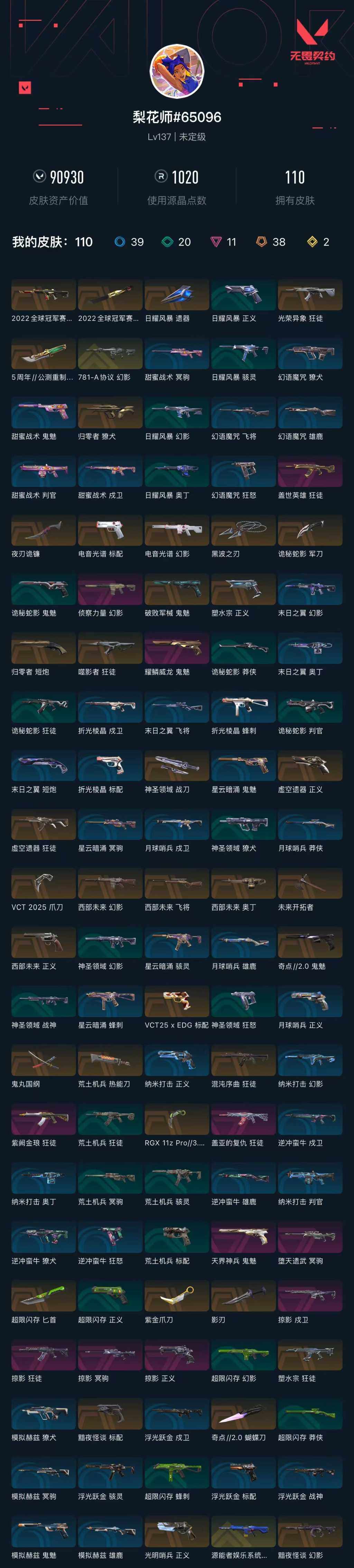 [14578507]【套装】:2022全球冠军赛套装,vct 2025 赛季套装,西部未来套装,掠影套装 【英雄】:幻棱,炼狱,维斯,暮蝶,钛狐,壹决,铁臂,捷风,雷兹,幽影,不死鸟,贤者,猎枭,蝰蛇,零,芮娜,奇乐,尚勃勒,霓虹,斯凯,夜露,星礈,k/o,海神,盖可,黑梦,钢锁 【近战 武器】:近战武器-2022全球冠军赛 蝴蝶刀,近战武器-5周年//公测重制版 苍龙之刃,近战武器-奇点//2.0 蝴蝶刀,近战武器-vct 2025 爪刀,近战武器-紫金爪刀,近战武器-rgx 11z pro//3.0 爪刀,近战武器-黑波之刃,近战武器-鬼丸国纲,近战武器-未来开拓者,近战武器-超限闪存 匕首,近战武器-荒土机兵 热能刀,近战武器-夜刃诡镰,近战武器-影刃,近战武器-诡秘蛇影 军刀,近战武器-神圣领域 战刀,近战武器-日耀风暴 遗器 【狂徒】:狂徒-混沌序曲,狂徒-塑水宗,狂徒-虚空遗器,狂徒-噬影者,狂徒-光荣异象,狂徒-掠影,狂徒-盖世英雄,狂徒-盖亚的复仇,狂徒-紫阙金琅,狂徒-荒土机兵,狂徒-诡秘蛇影 【幻影】:幻影-781-a协议,幻影-源能者娱乐系统,幻影-2022全球冠军赛,幻影-黯夜怪谈,幻影-西部未来,幻影-电音光谱,幻影-侦察力量,幻影-超限闪存,幻影-神圣领域,幻影-纳米打击,幻影-末日之翼,幻影-西部未来,幻影-电音光谱 【戍卫】:戍卫-掠影,戍卫-浮光跃金,戍卫-逆冲蛮牛,戍卫-月球哨兵,戍卫-折光棱晶 【獠犬】:獠犬-归零者,獠犬-神圣领域,獠犬-模拟赫兹,獠犬-逆冲蛮牛 【冥驹】:冥驹-堕天遗武,冥驹-掠影,冥驹-荒土机兵,冥驹-模拟赫兹,冥驹-星云暗涌 【飞将】:飞将-西部未来,飞将-末日之翼 【莽侠】:莽侠-超限闪存,莽侠-诡秘蛇影,莽侠-月球哨兵 【战神】:战神-神圣领域,战神-浮光跃金 【奥丁】:奥丁-西部未来,奥丁-纳米打击,奥丁-末日之翼 【判官】:判官-诡秘蛇影,判官-纳米打击x 【雄鹿】:雄鹿-模拟赫兹,雄鹿-逆冲蛮牛,雄鹿-月球哨兵 【骇灵】:骇灵-荒土机兵,骇灵-浮光跃金,骇灵-星云暗涌 【蜂刺】:蜂刺-超限闪存,蜂刺-星云暗涌,蜂刺-折光棱晶 【标配】:标配-黯夜怪谈,标配-电音光谱,标配-荒土机兵,标配-浮光跃金,标配-折光棱晶,标配-电音光谱 【vct手呛】:标配-vct25 x edg 【正义】:正义-光明哨兵,正义-塑水宗